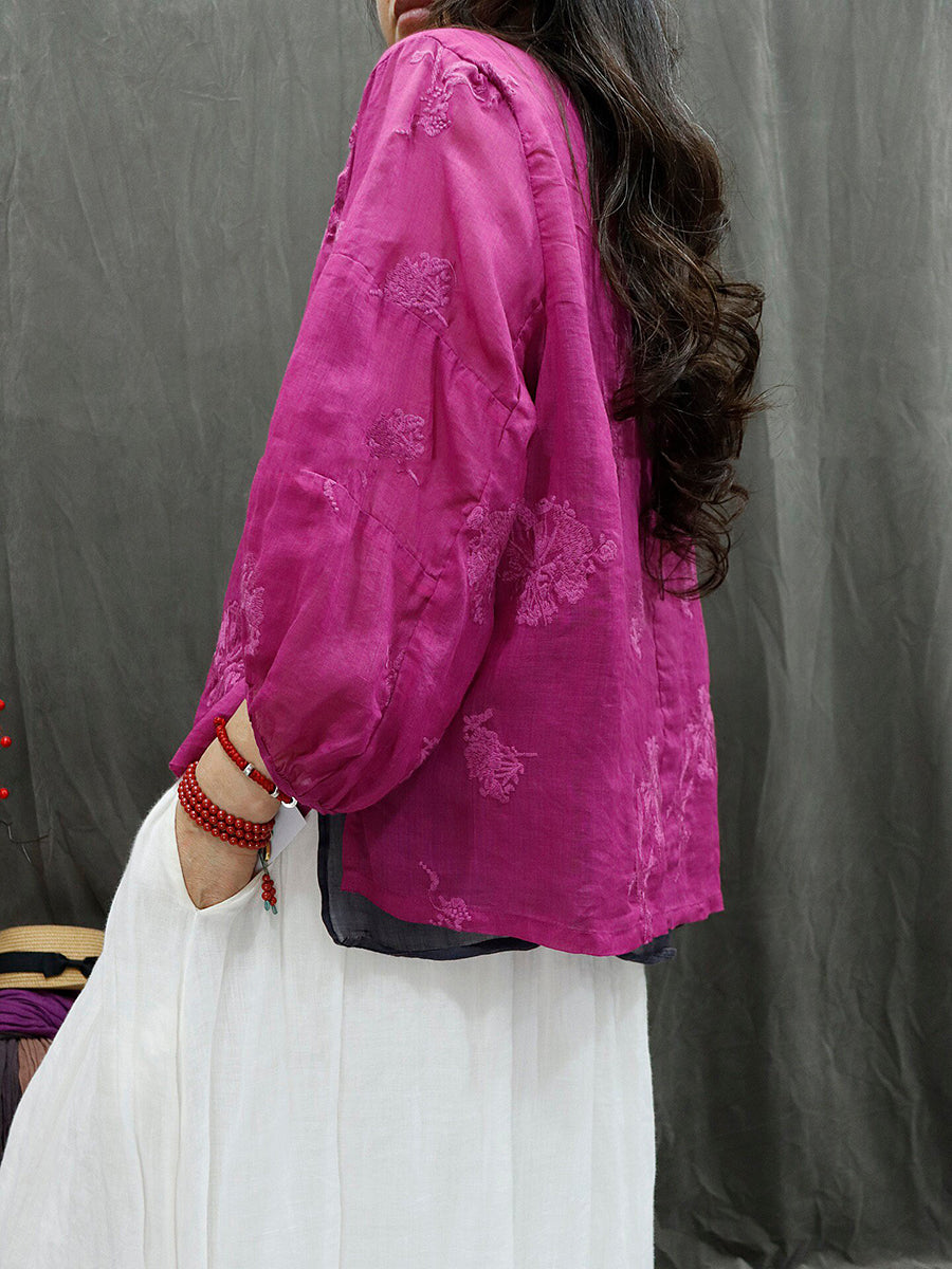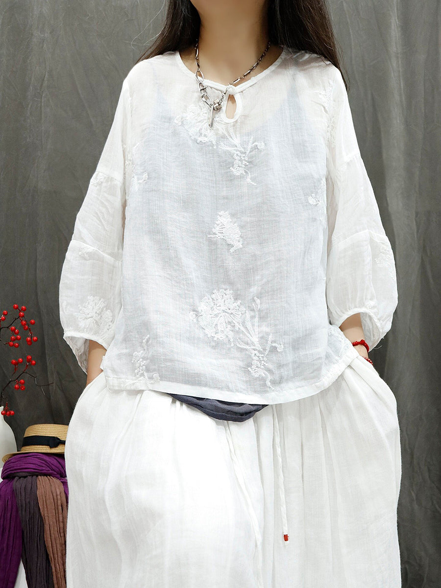 Women Summer Retro Embroidery Ramie Blouse