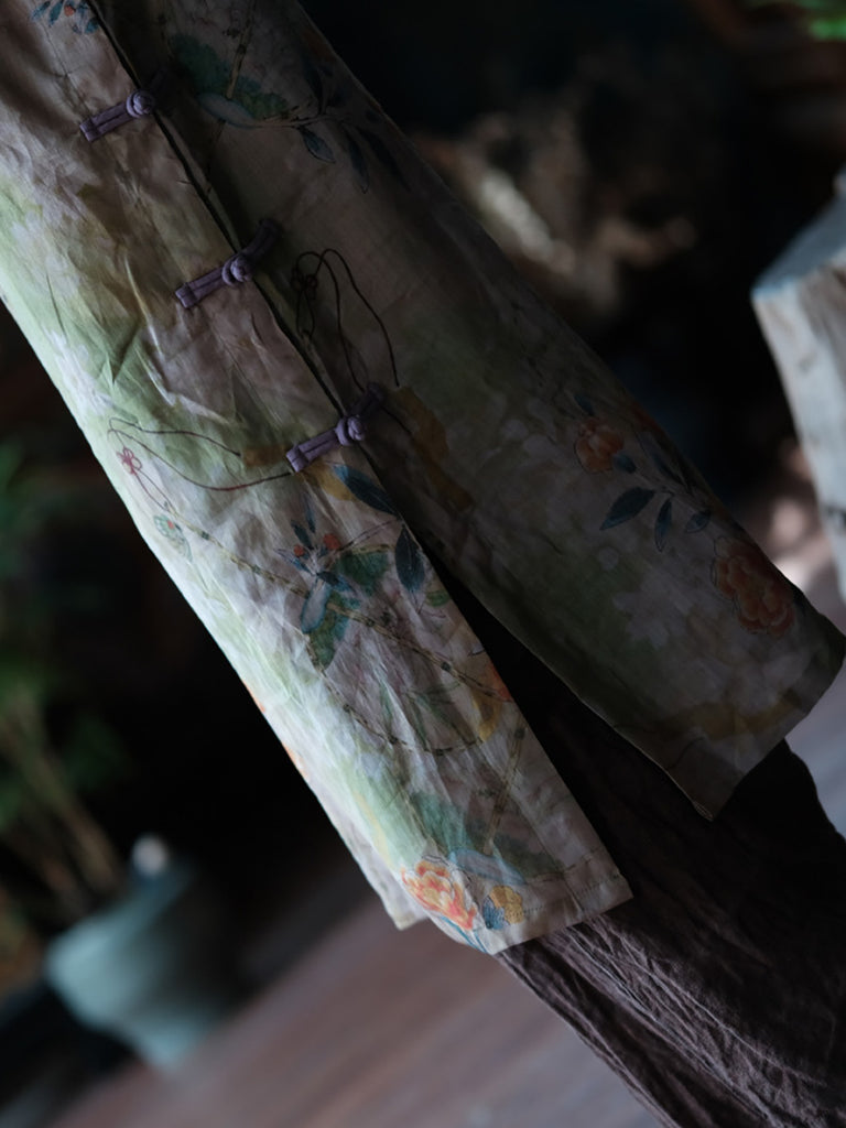 Women Summer Vintage Flower Buckle Stand Collar Ramie Dress