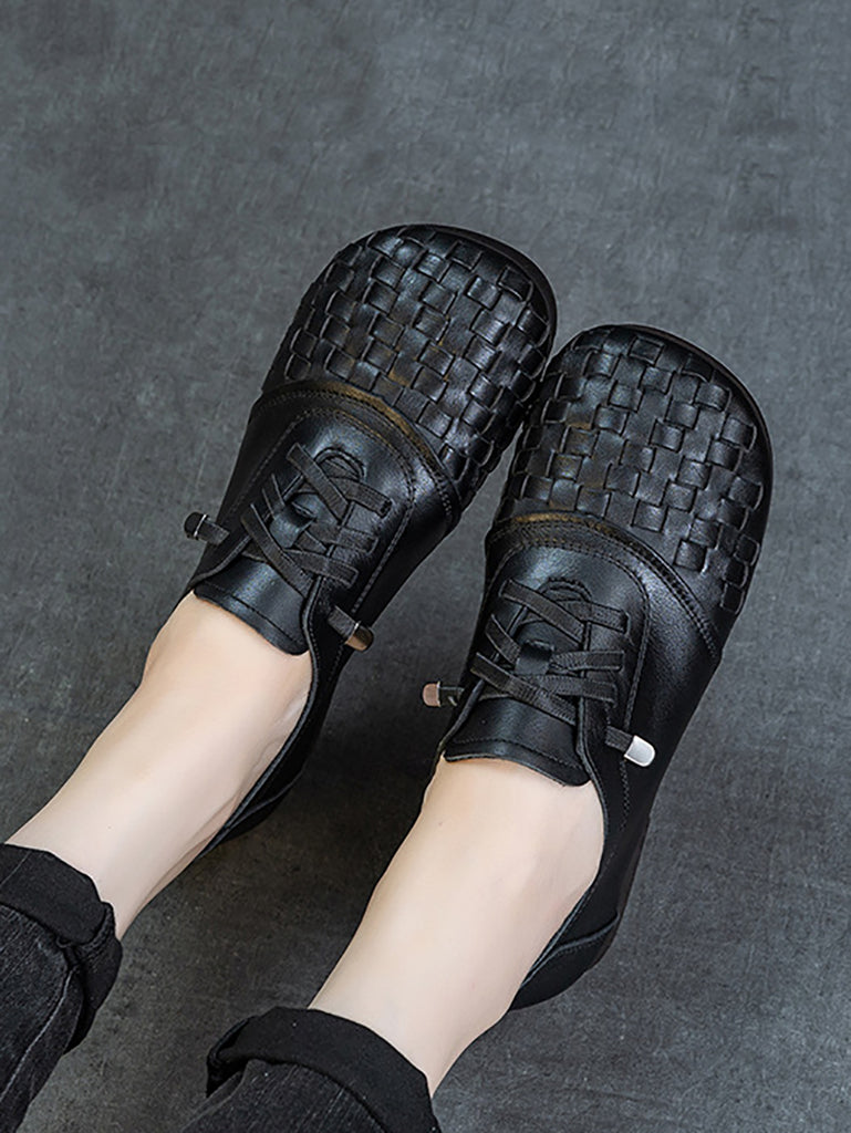 Women Vintage Leather Weave Low Heel Shoes