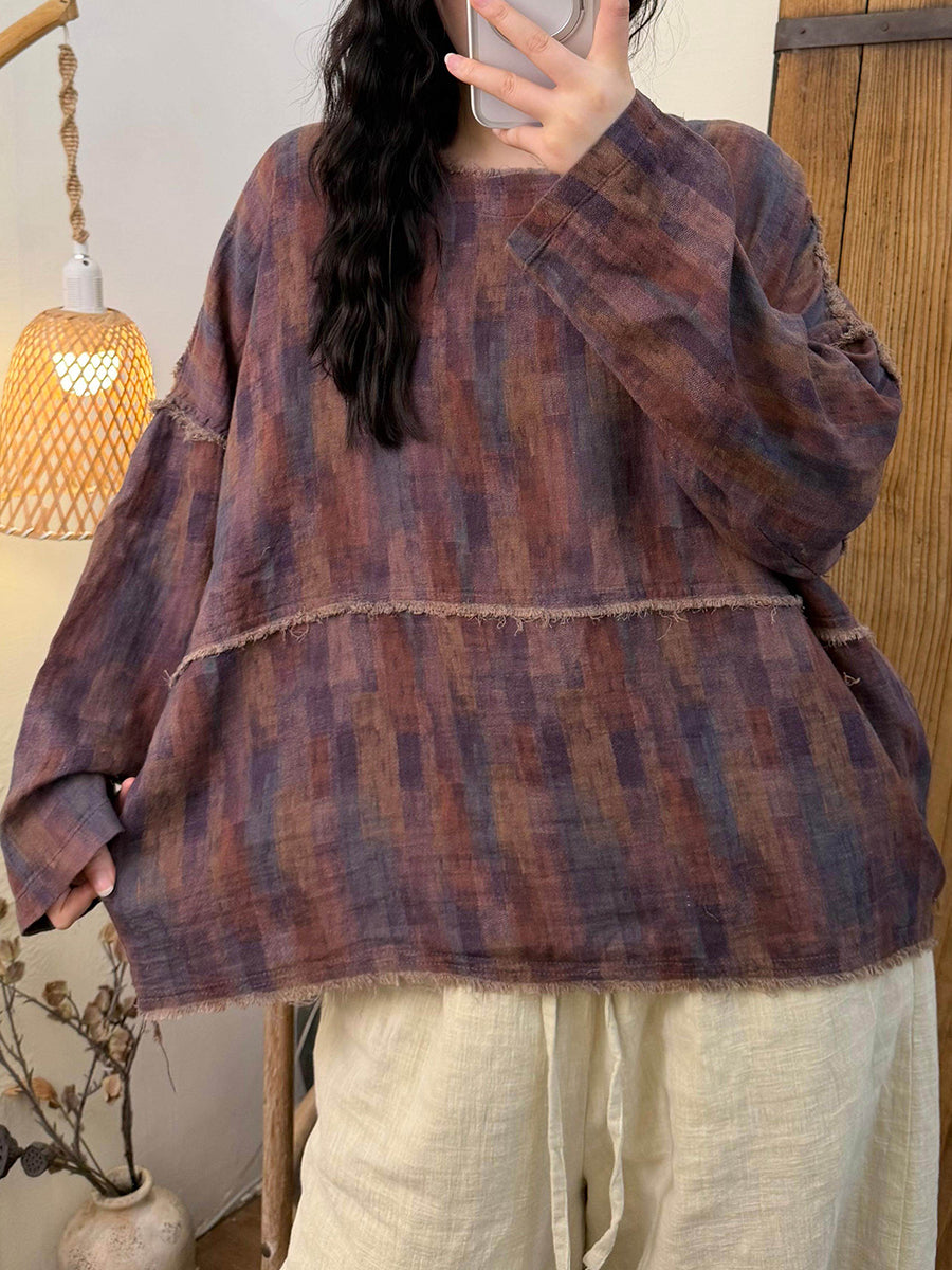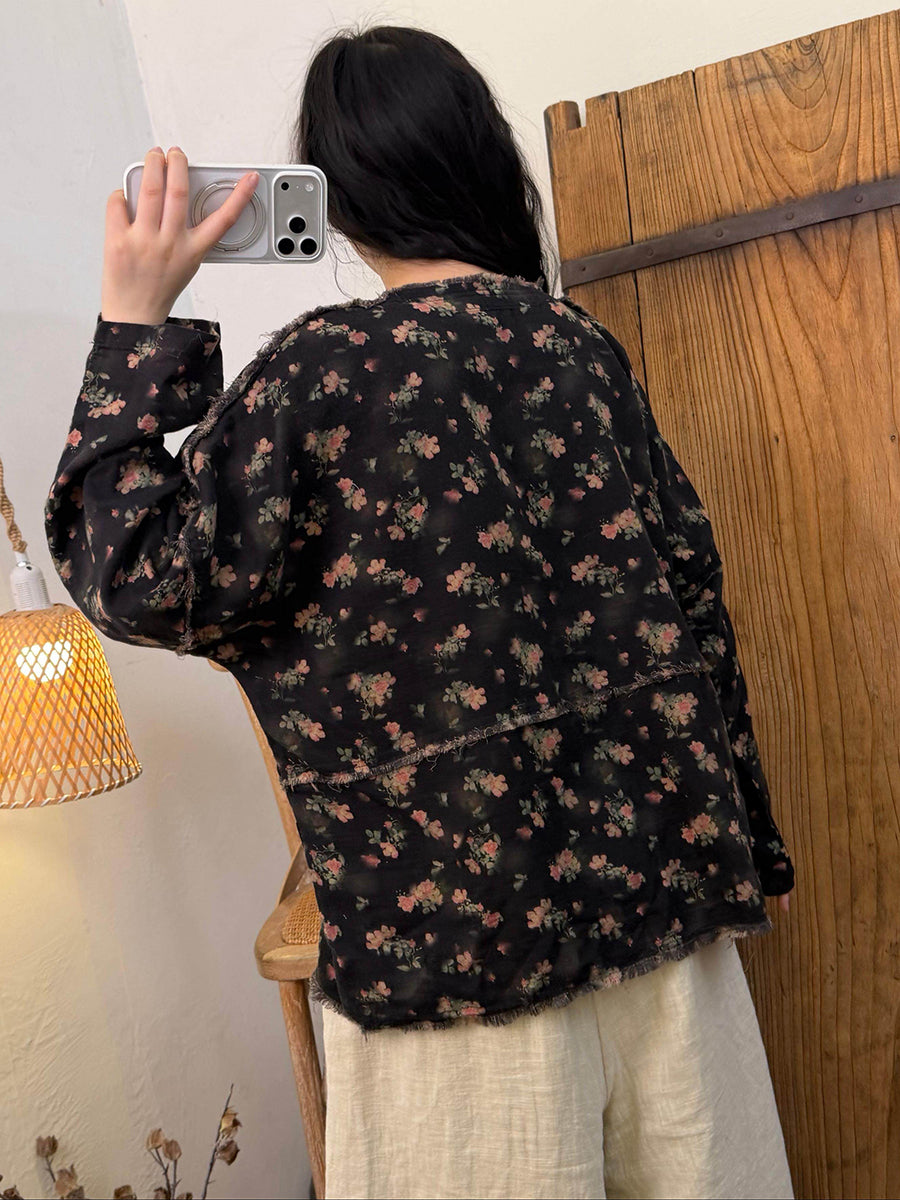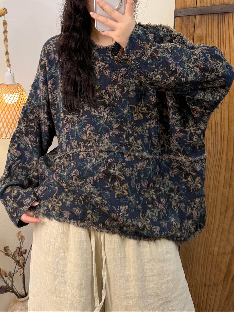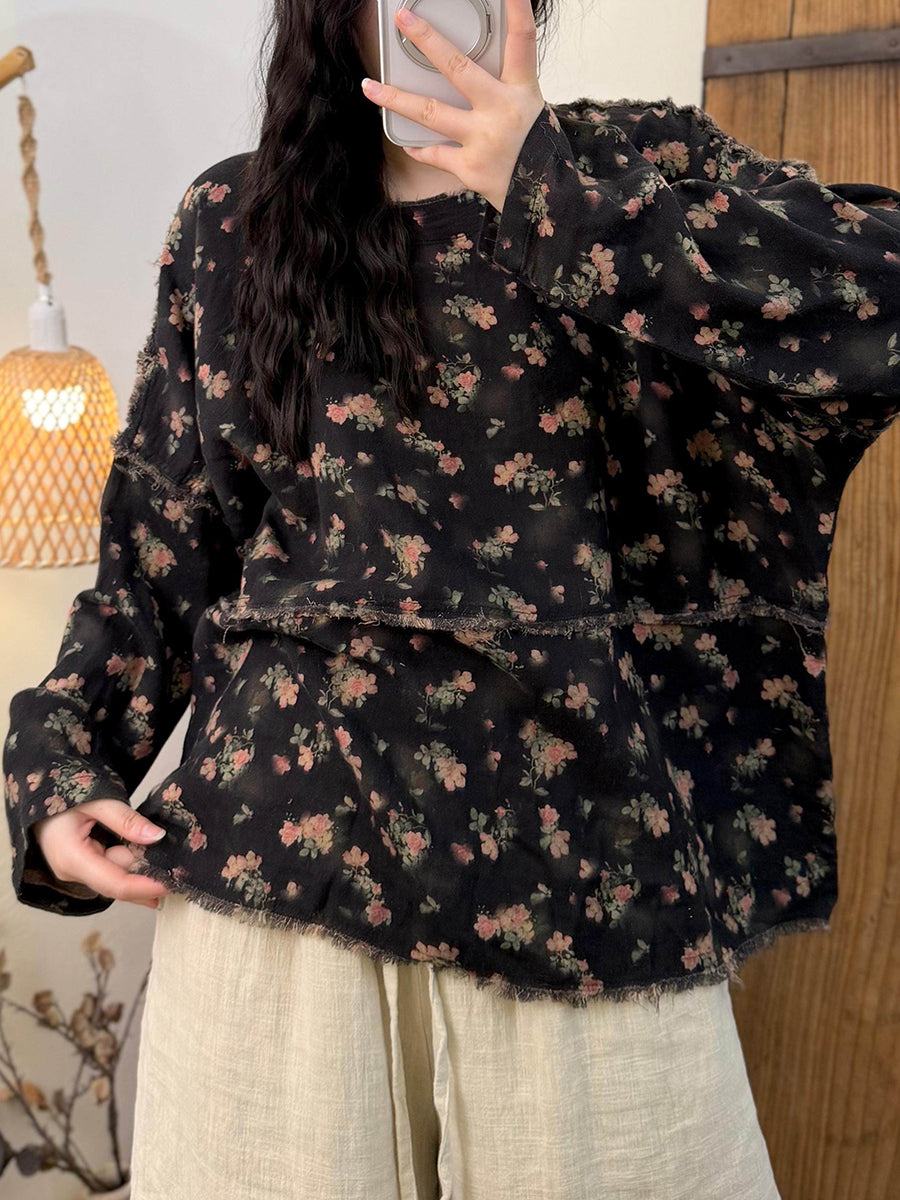 Women Vintage Spring Spliced Flower O-Neck Blouse