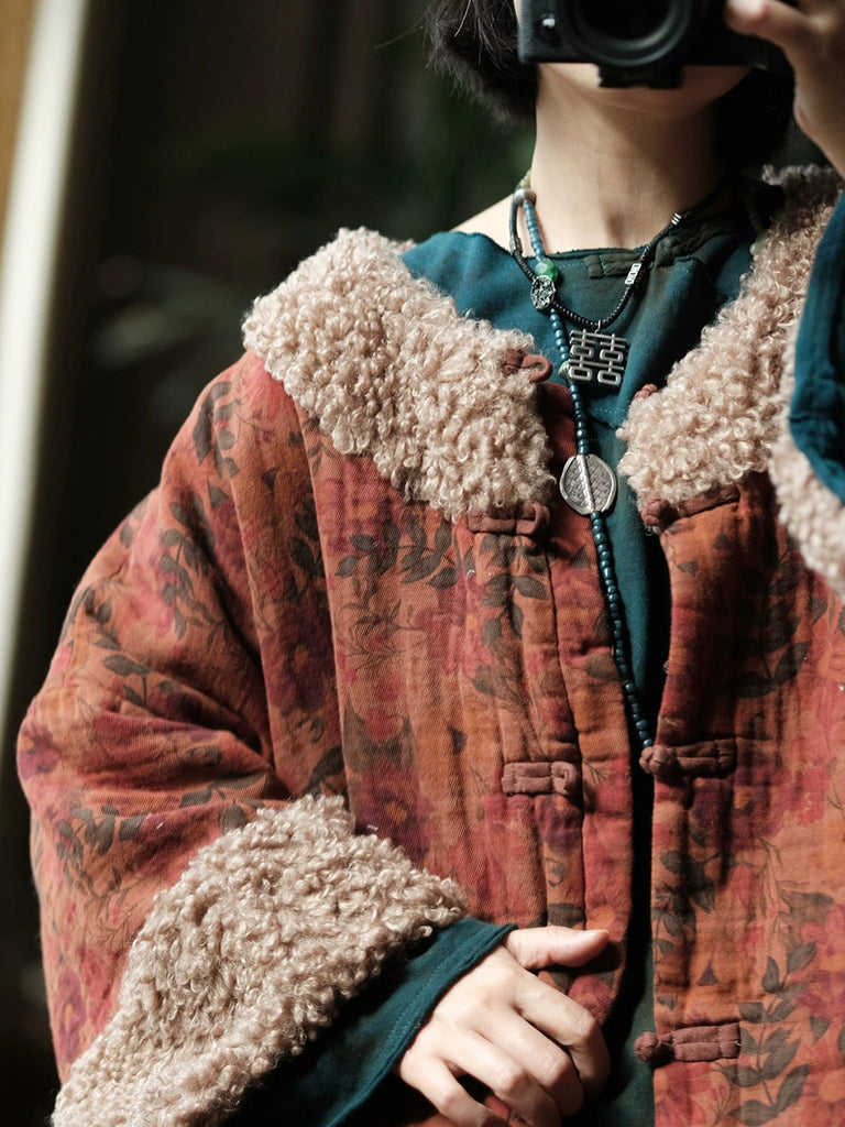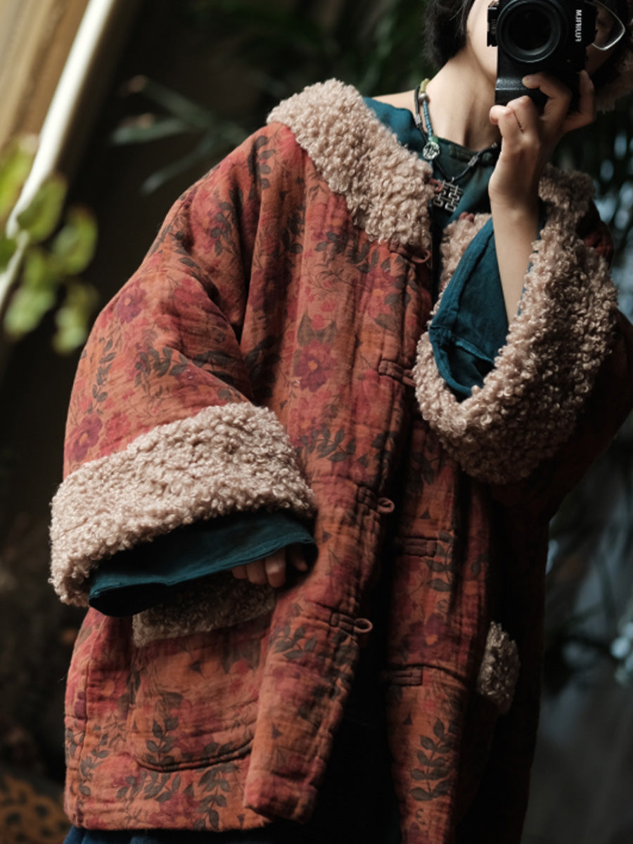 Women Vintage Winter Flower Fleece Spliced Cotton O-Neck Coat