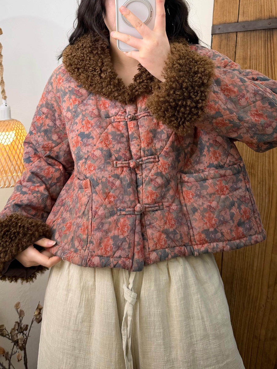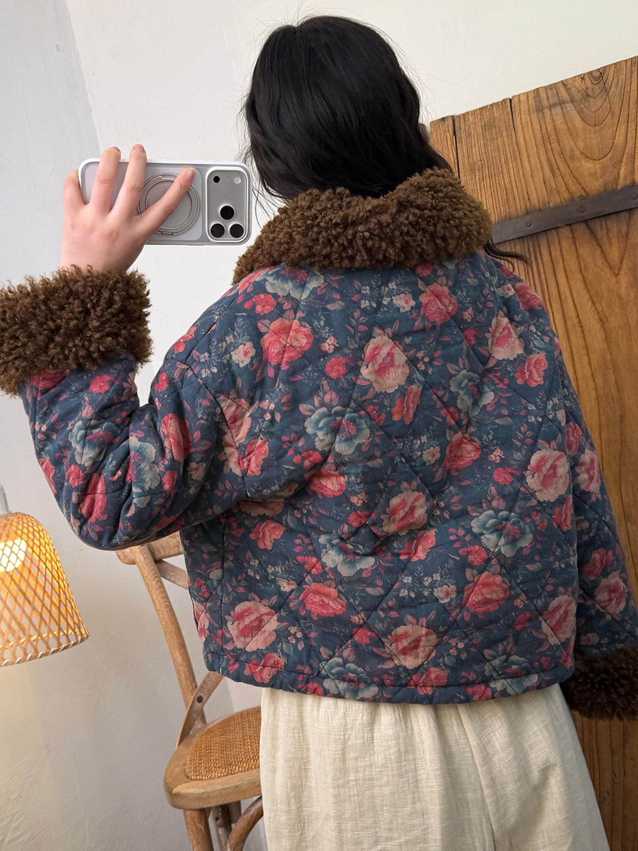 Women Winter Flower Fleece Spliced Padded O-Neck Coat
