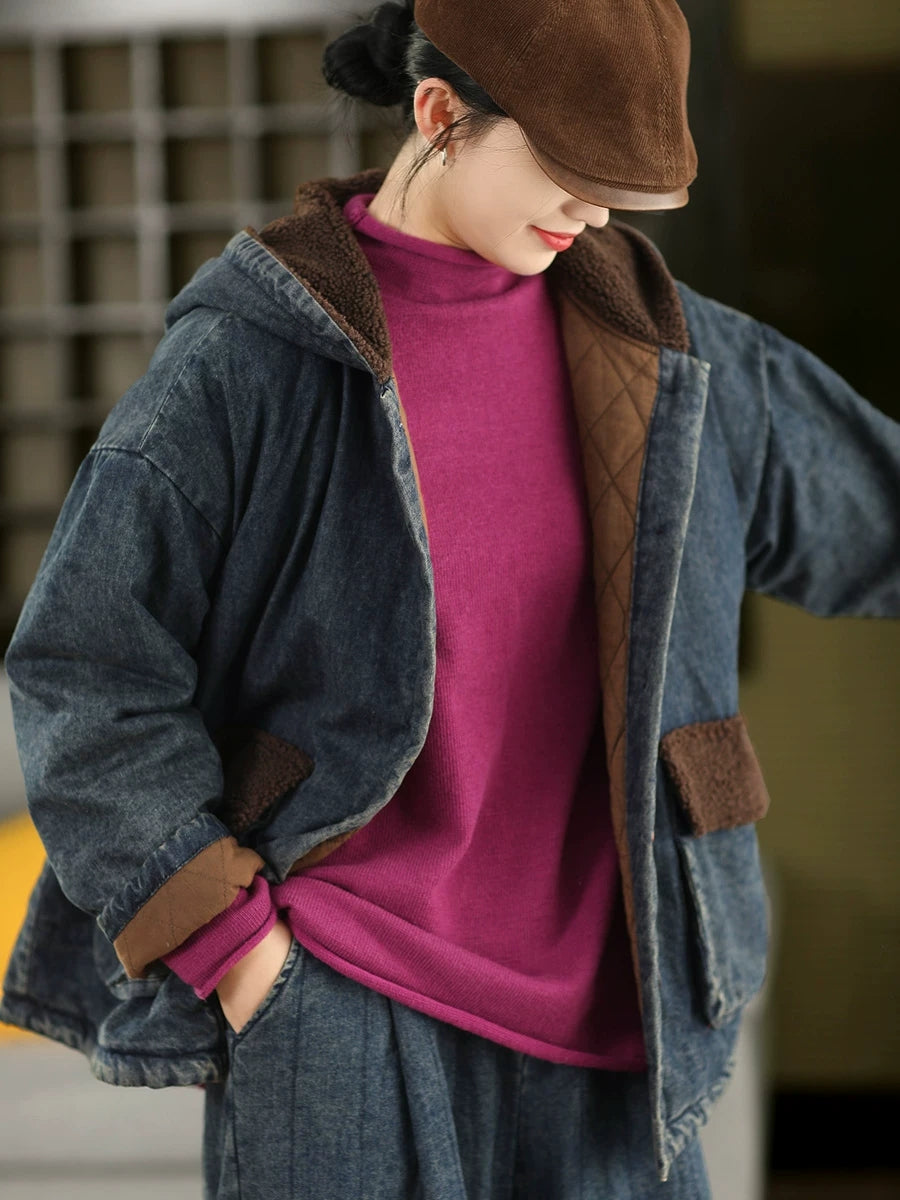 Women Winter Retro Denim Fleece Spliced Padded Hooded Coat