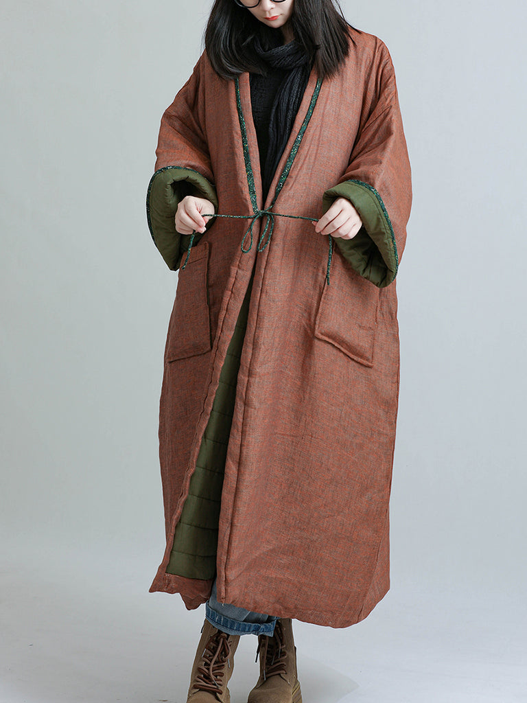 Women Winter Retro Pure Color V-Neck Padded Coat