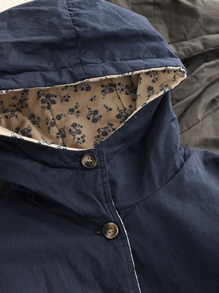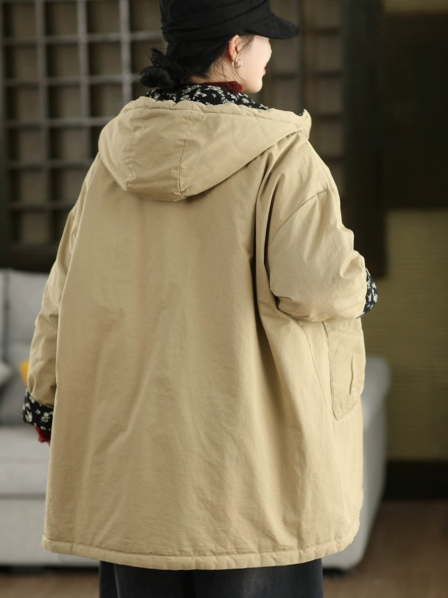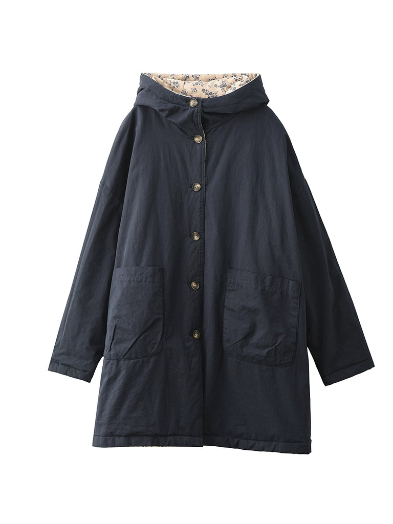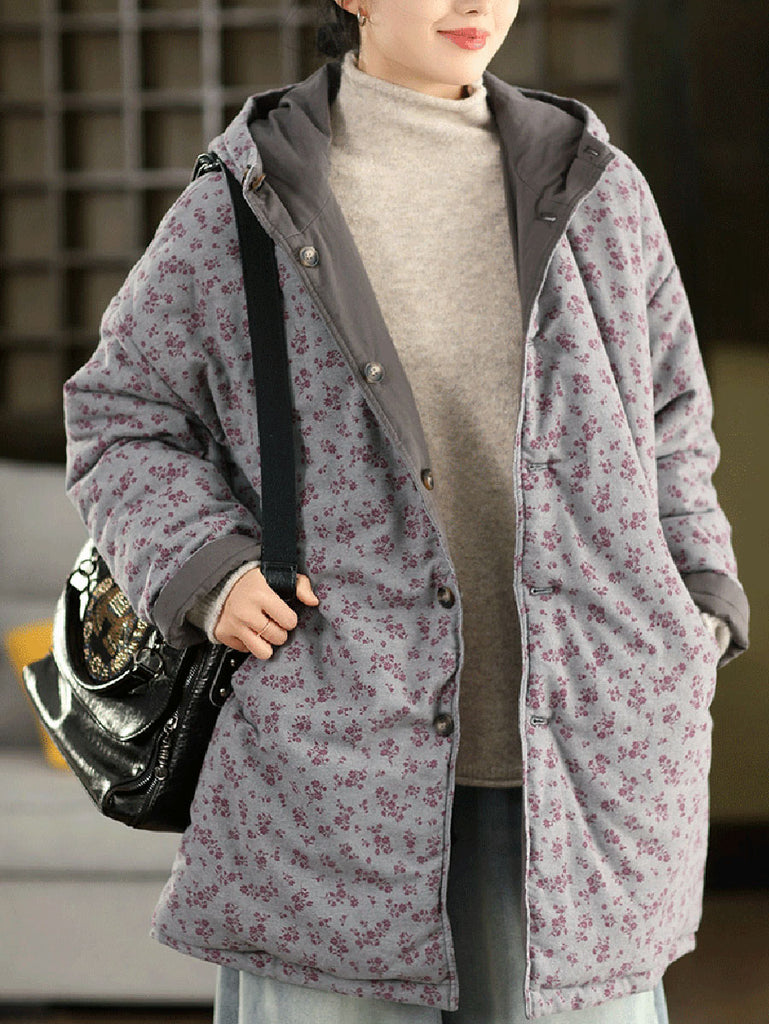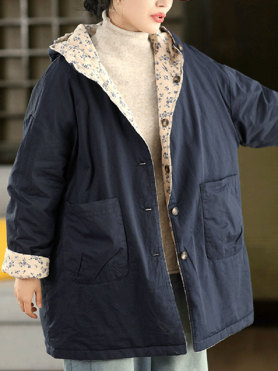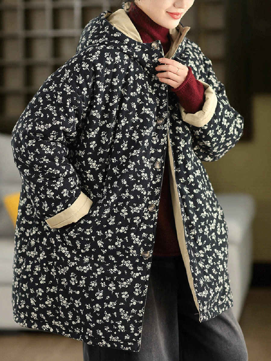 Women Winter Two-side Wearing Floral 100%Cotton Hooded Coat