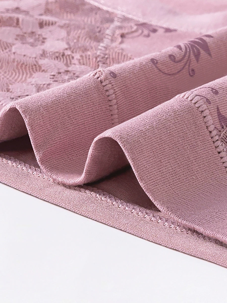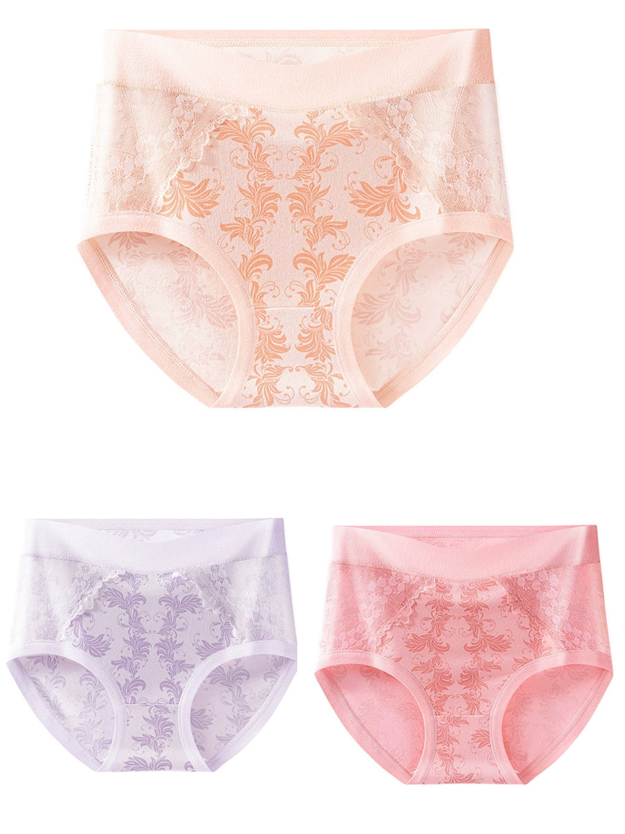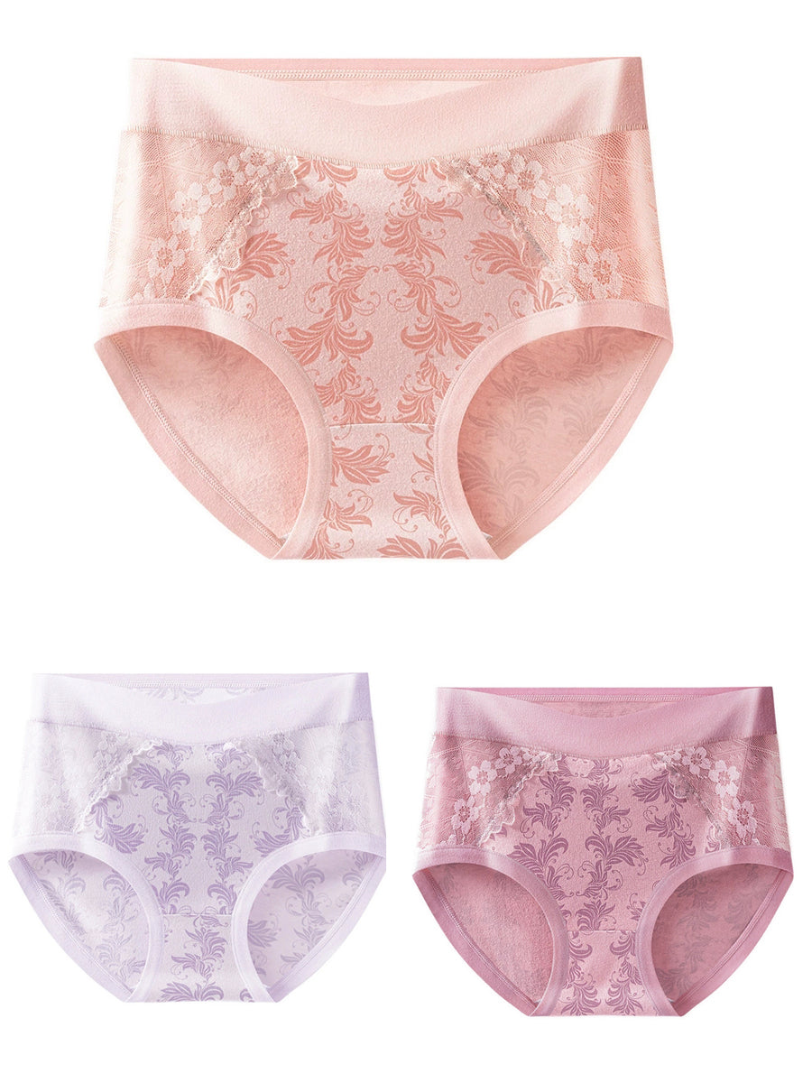 Conjunto de 3 peças de calcinha feminina de cintura alta com renda floral artística.