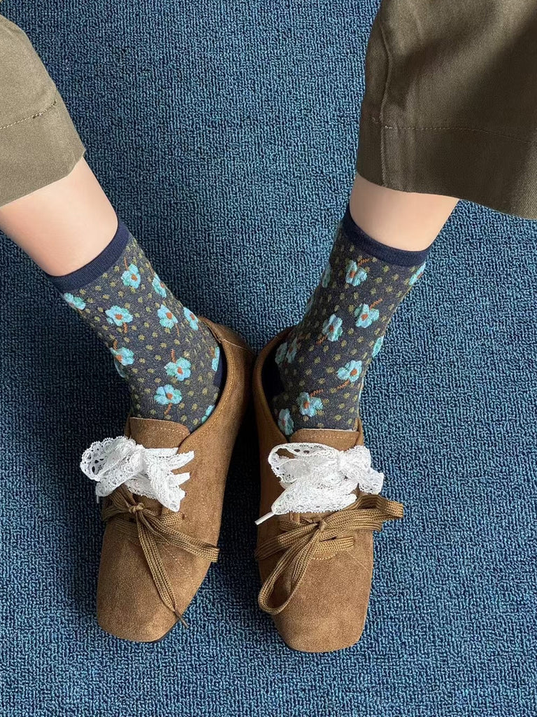 5 pares de meias femininas de algodão com estampa floral artística de outono