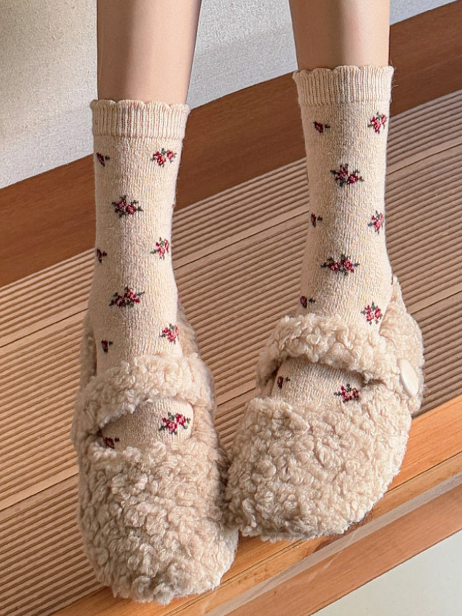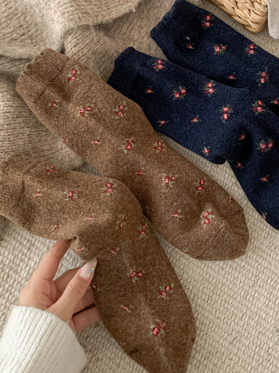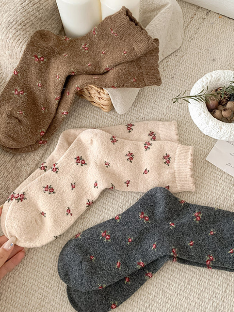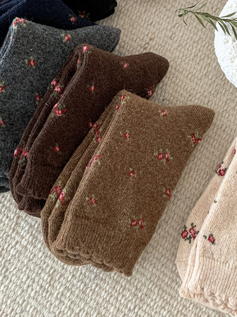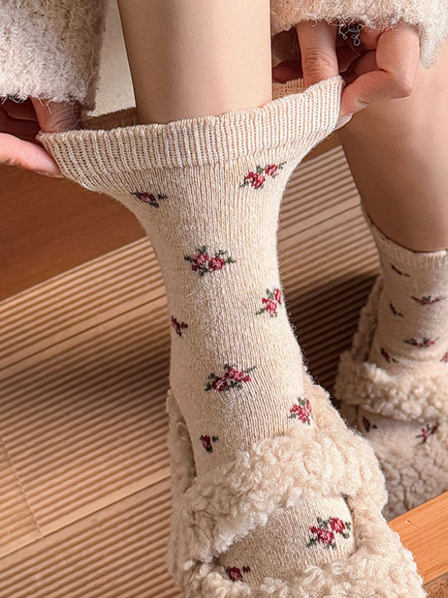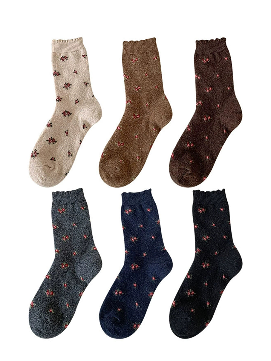 6 pares de meias femininas de inverno com estampa floral em jacquard