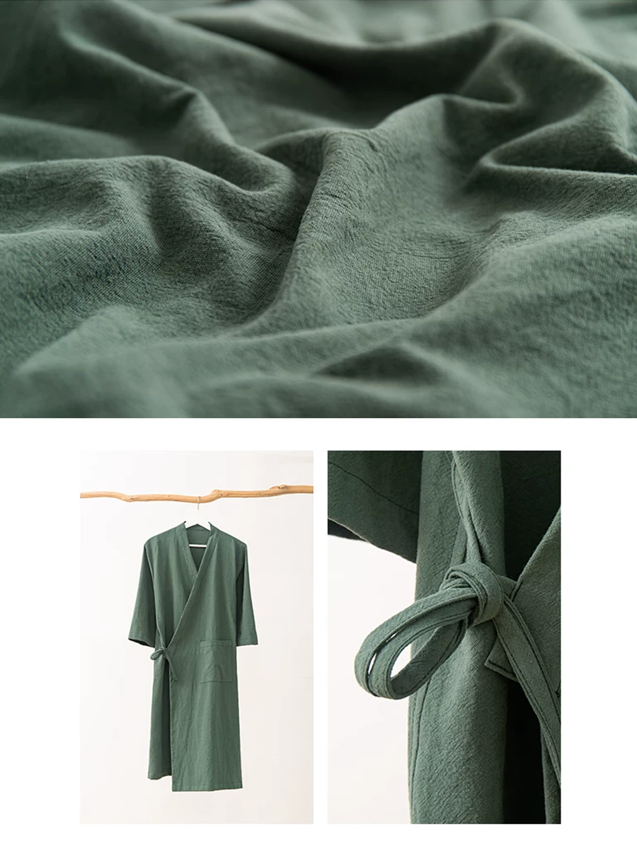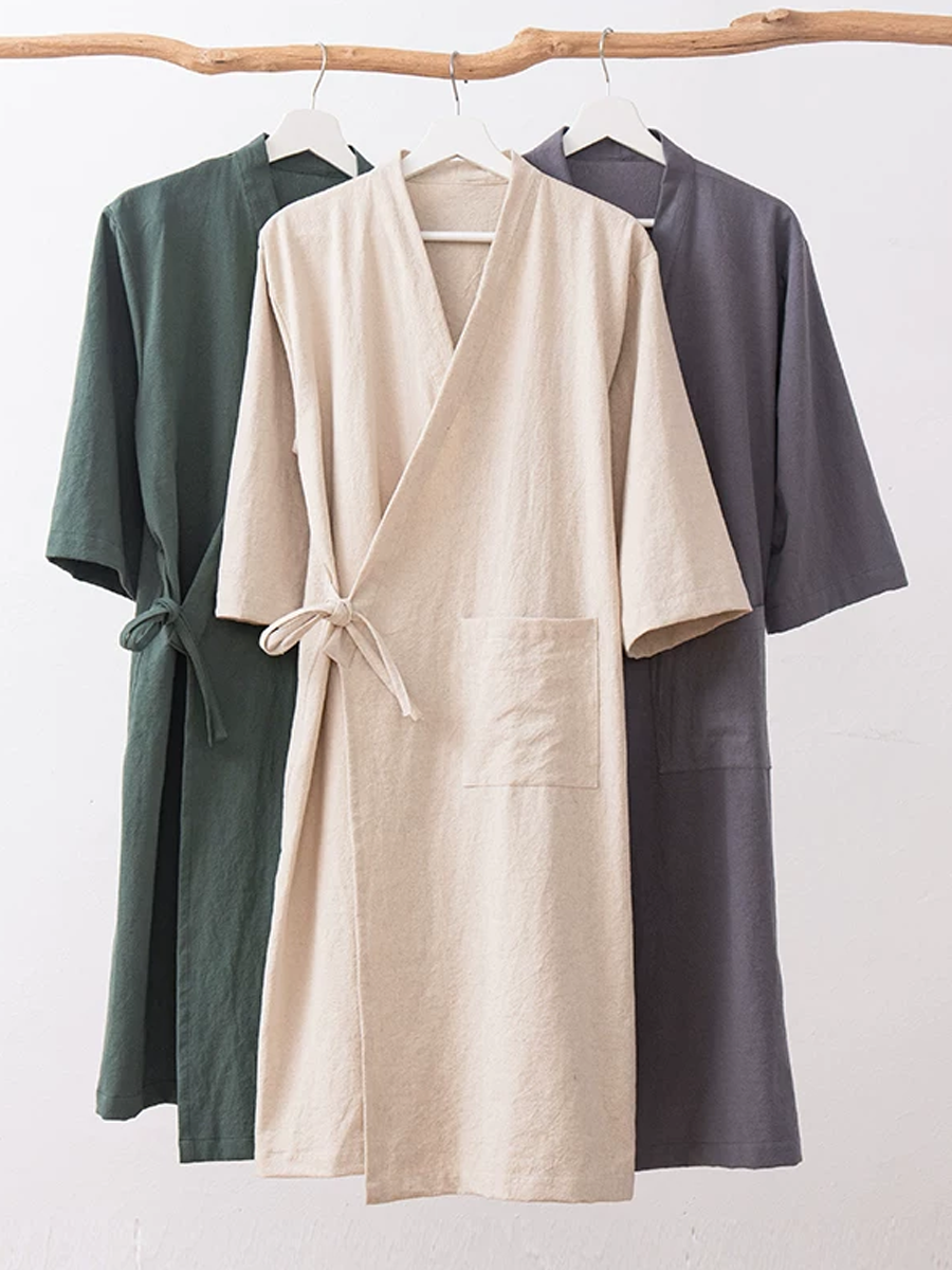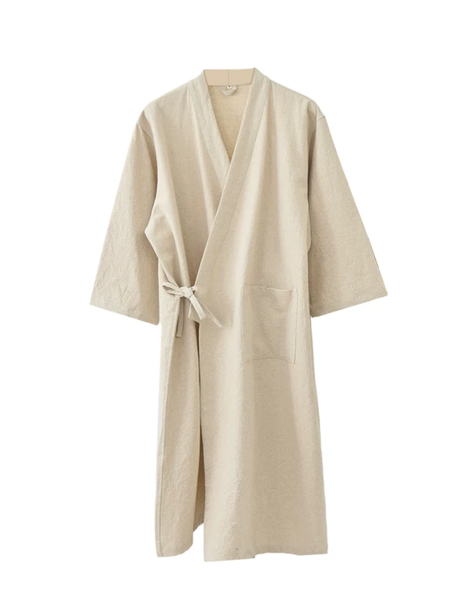 Nosso roupão de algodão e linho tem um comprimento médio a longo, que chega abaixo do joelho, e é confeccionado com uma mistura macia de 70% algodão e 30% linho. Com sua elegante cor pura, este roupão respirável e durável é perfeito para relaxar em casa ou depois do banho, oferecendo uma experiência elegante e confortável.