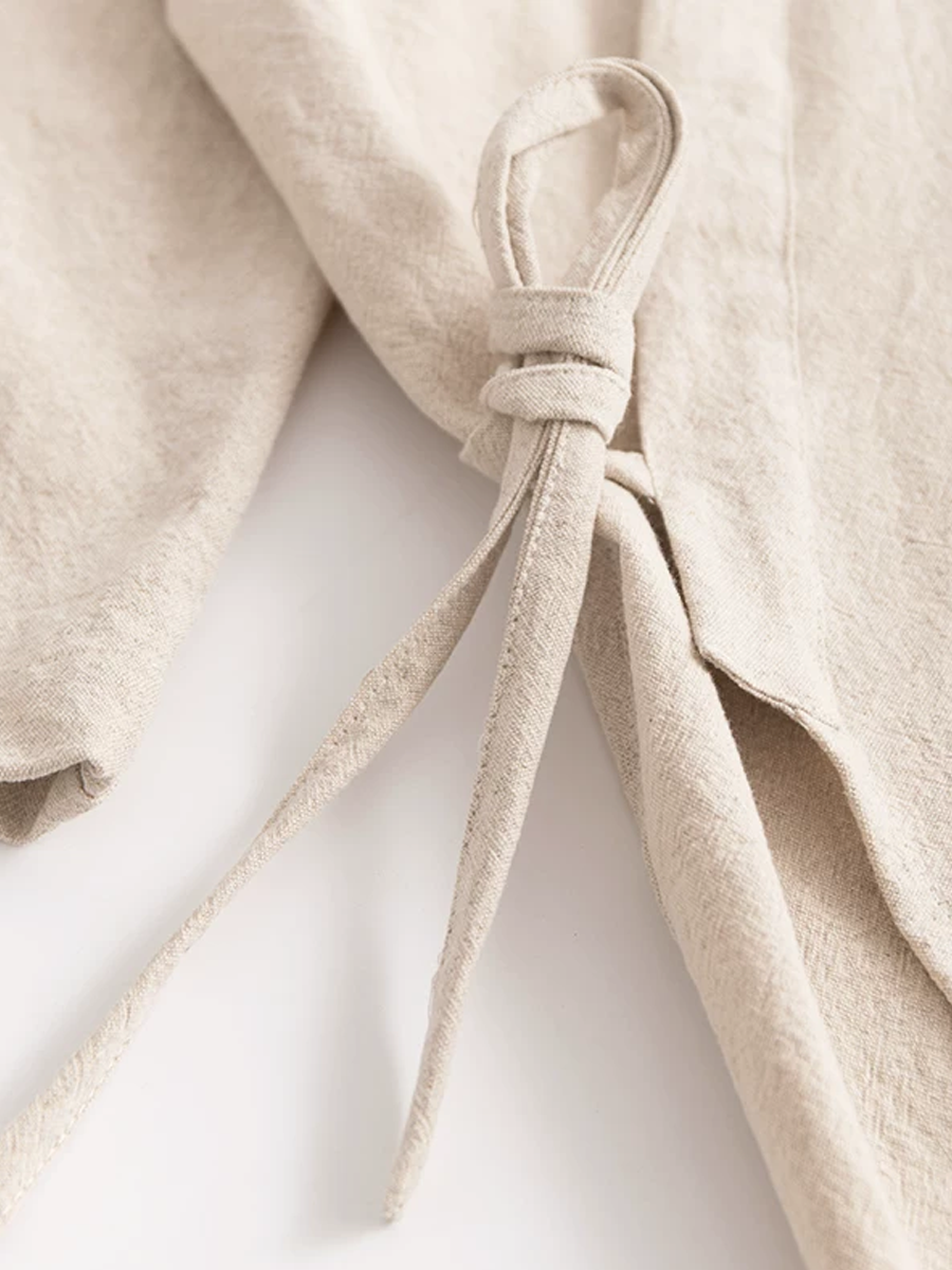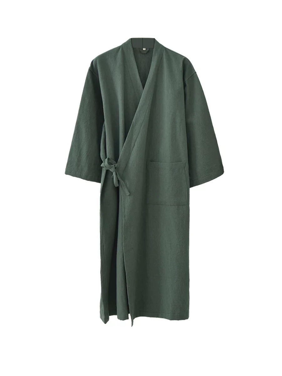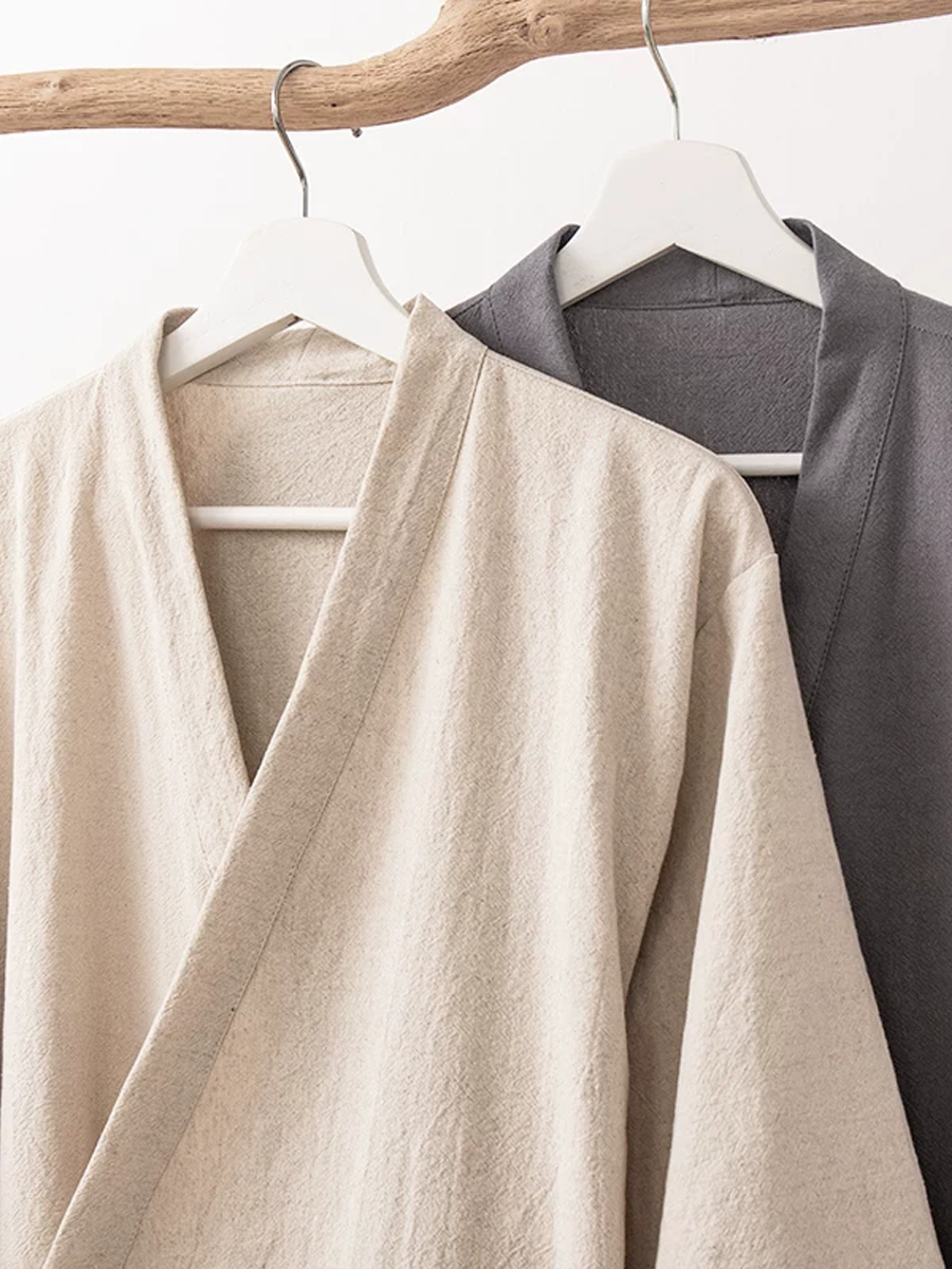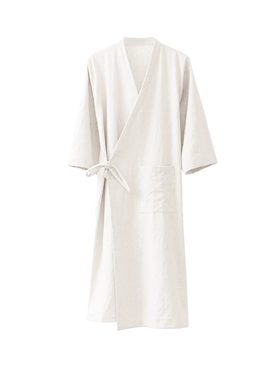 Nosso roupão de algodão e linho tem um comprimento médio a longo, que chega abaixo do joelho, e é confeccionado com uma mistura macia de 70% algodão e 30% linho. Com sua elegante cor pura, este roupão respirável e durável é perfeito para relaxar em casa ou depois do banho, oferecendo uma experiência elegante e confortável.