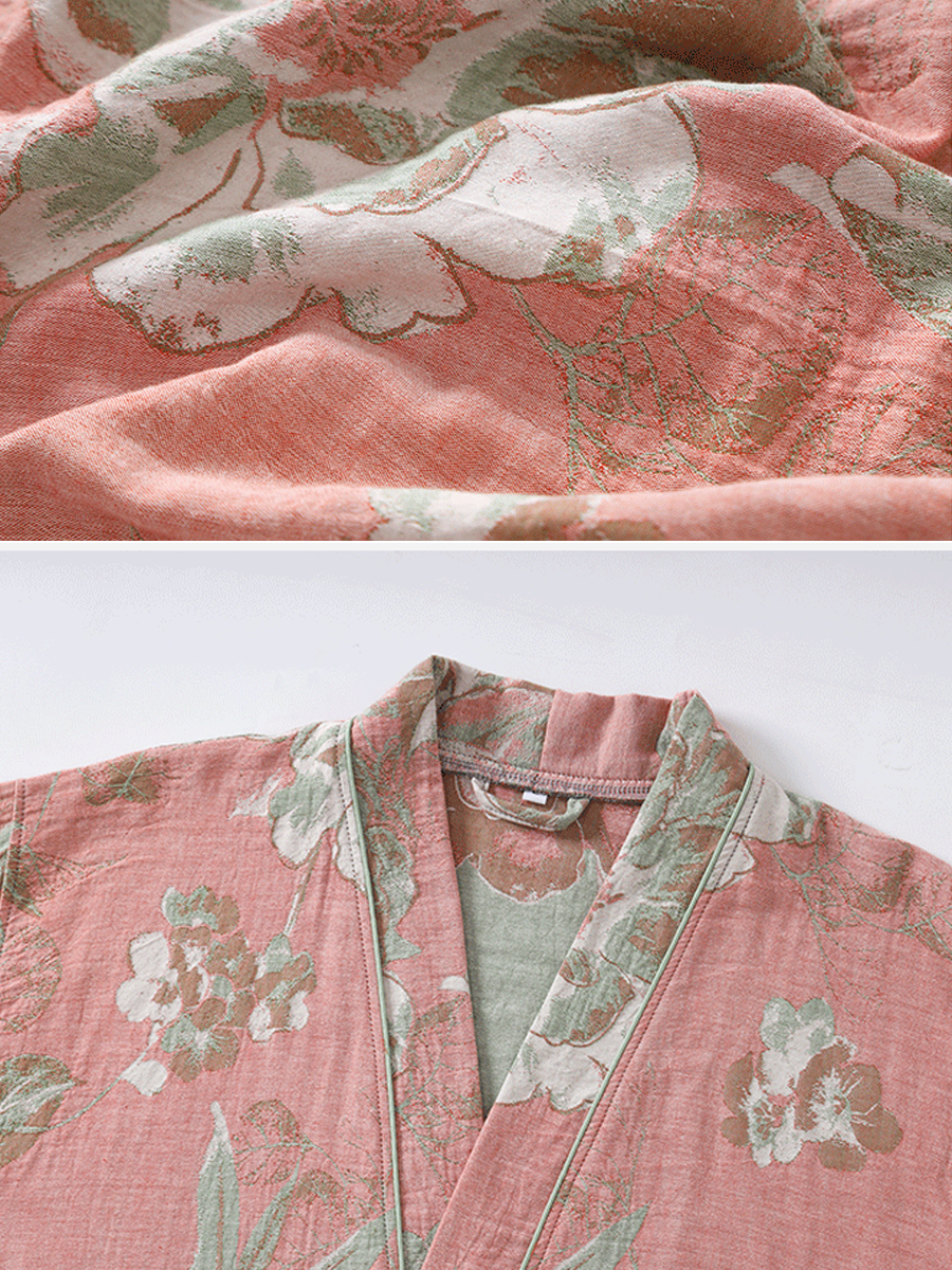 Confeccionado em gaze dupla 100% algodão puro, este roupão leve e respirável apresenta um corte solto e uma elegante estampa floral. Com cinto ajustável e comprimento alongado, oferece conforto e estilo para seus momentos de relaxamento.