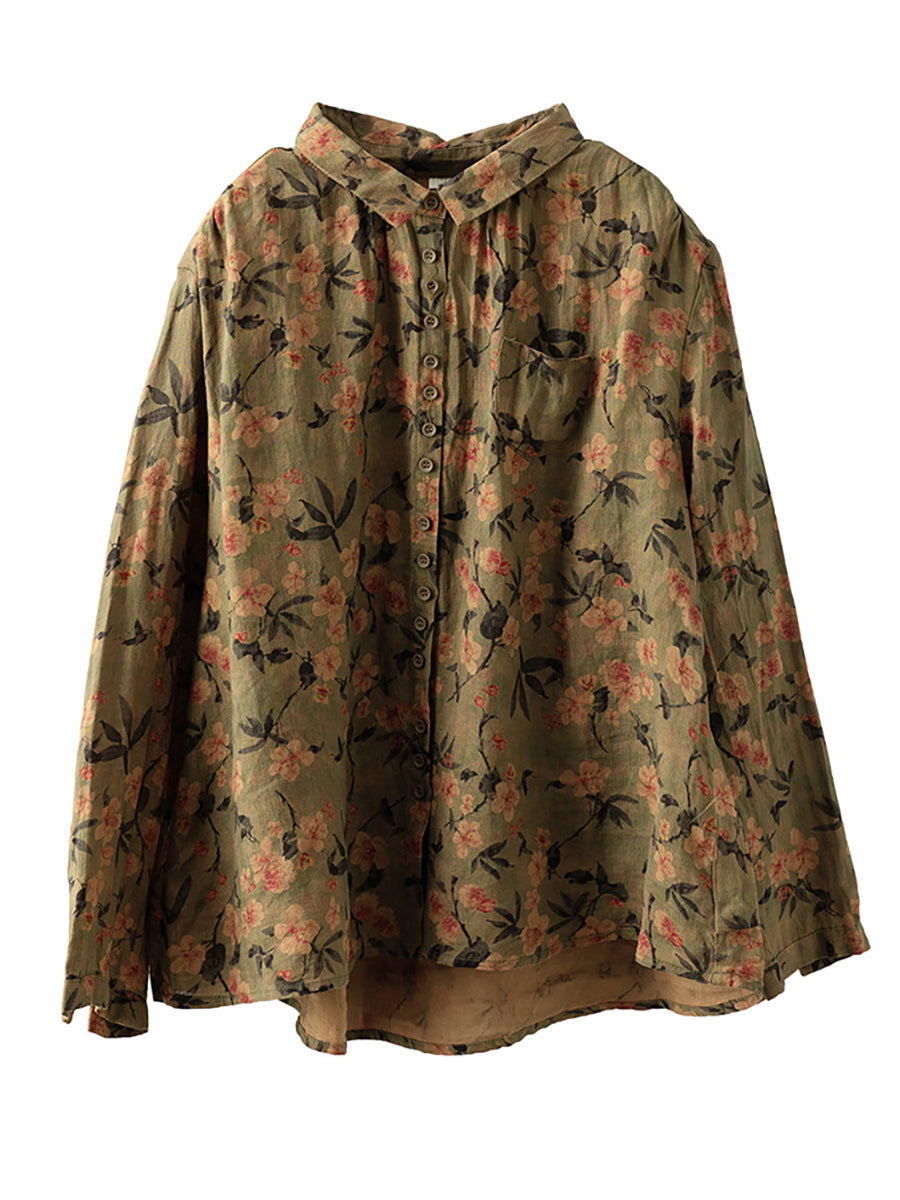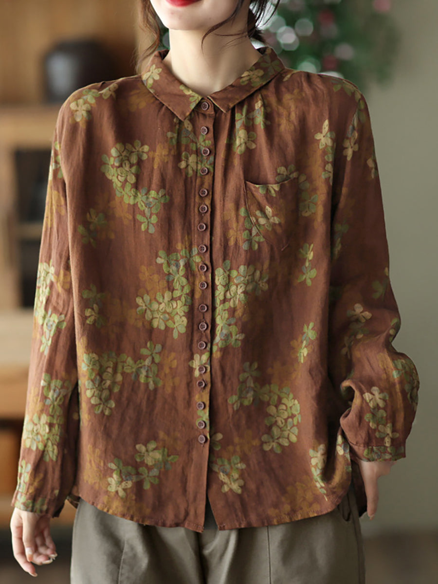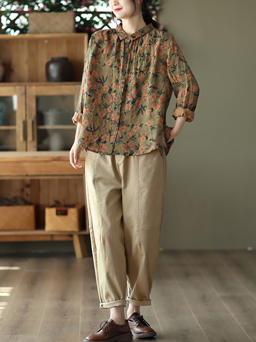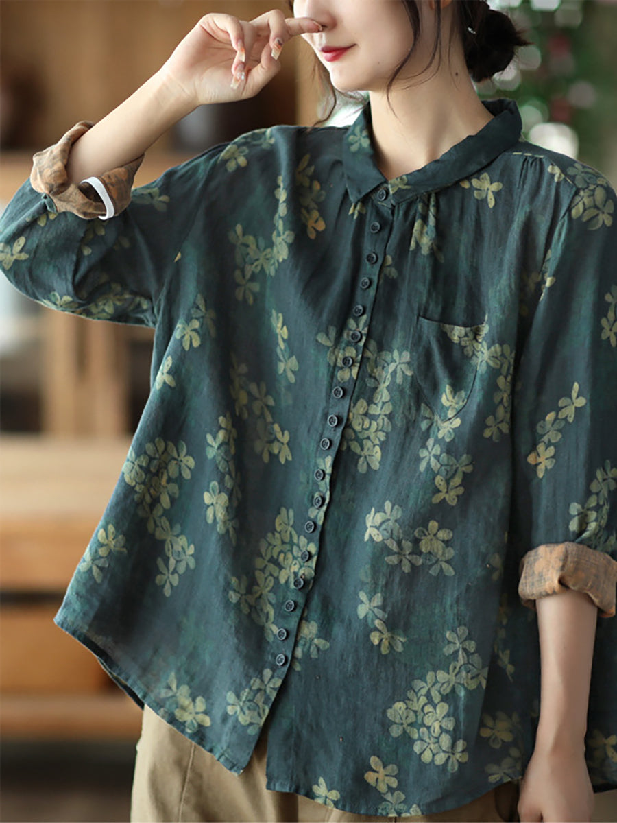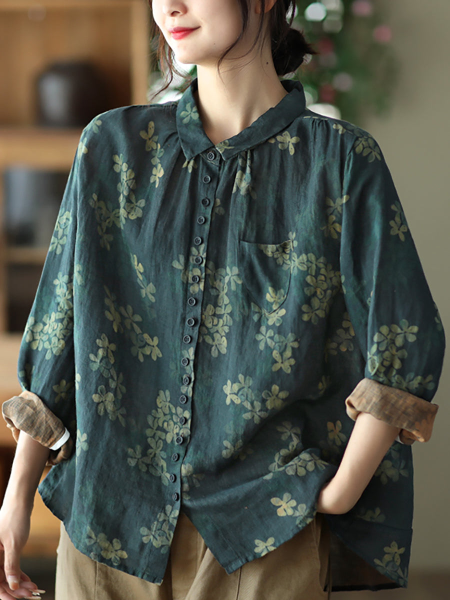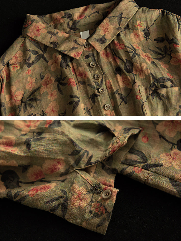 Camisa de linho estampada vintage de verão com gola virada para baixo