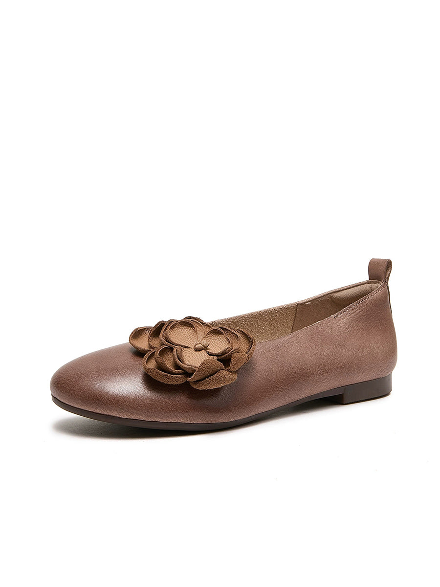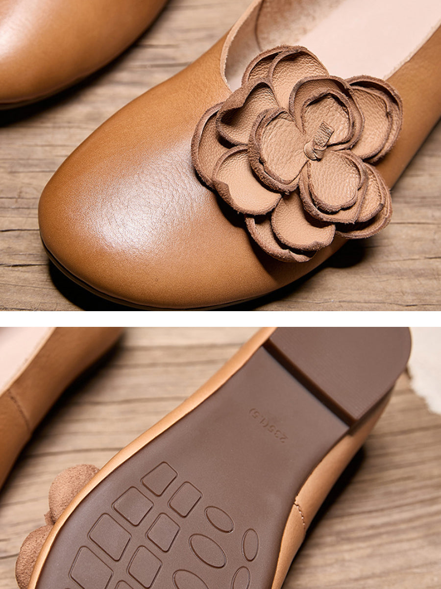 Sapatos femininos de salto baixo com detalhes florais em couro.