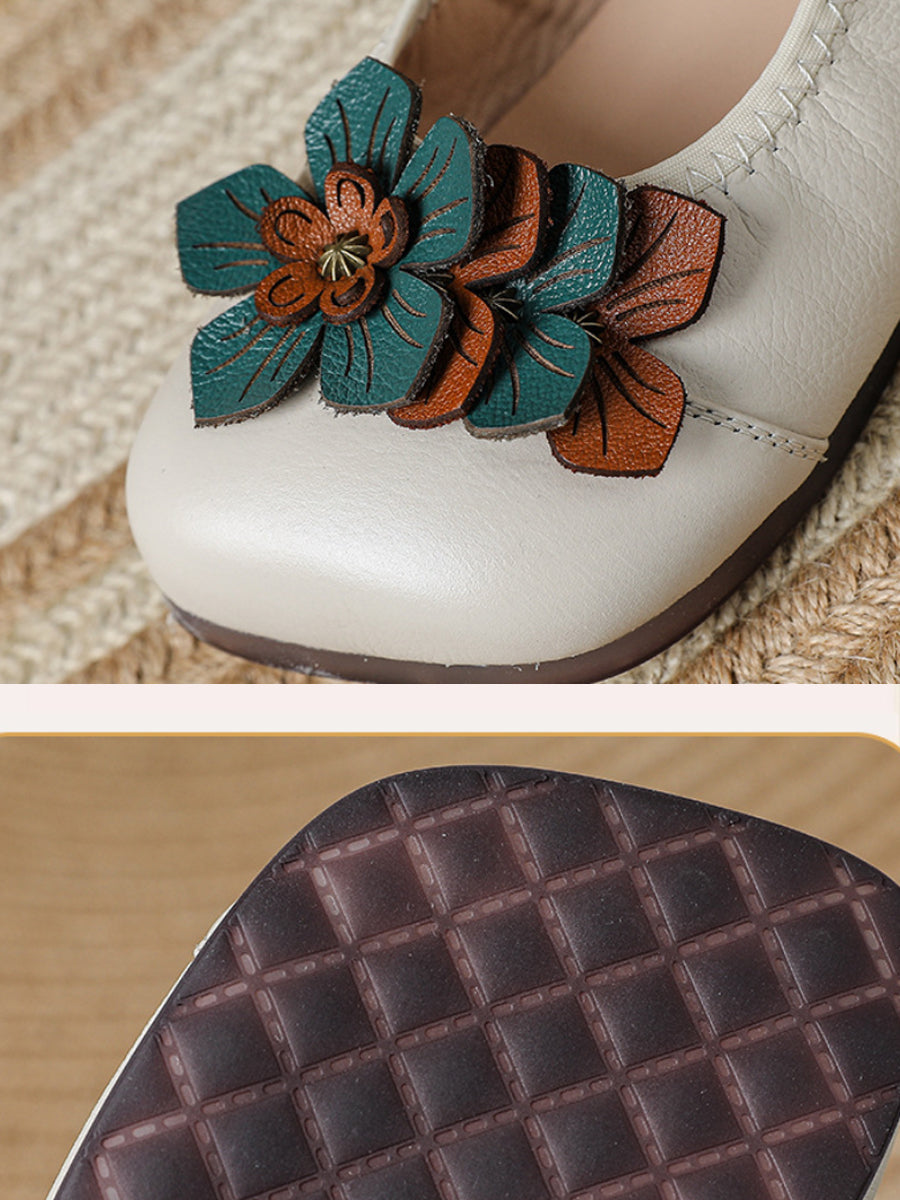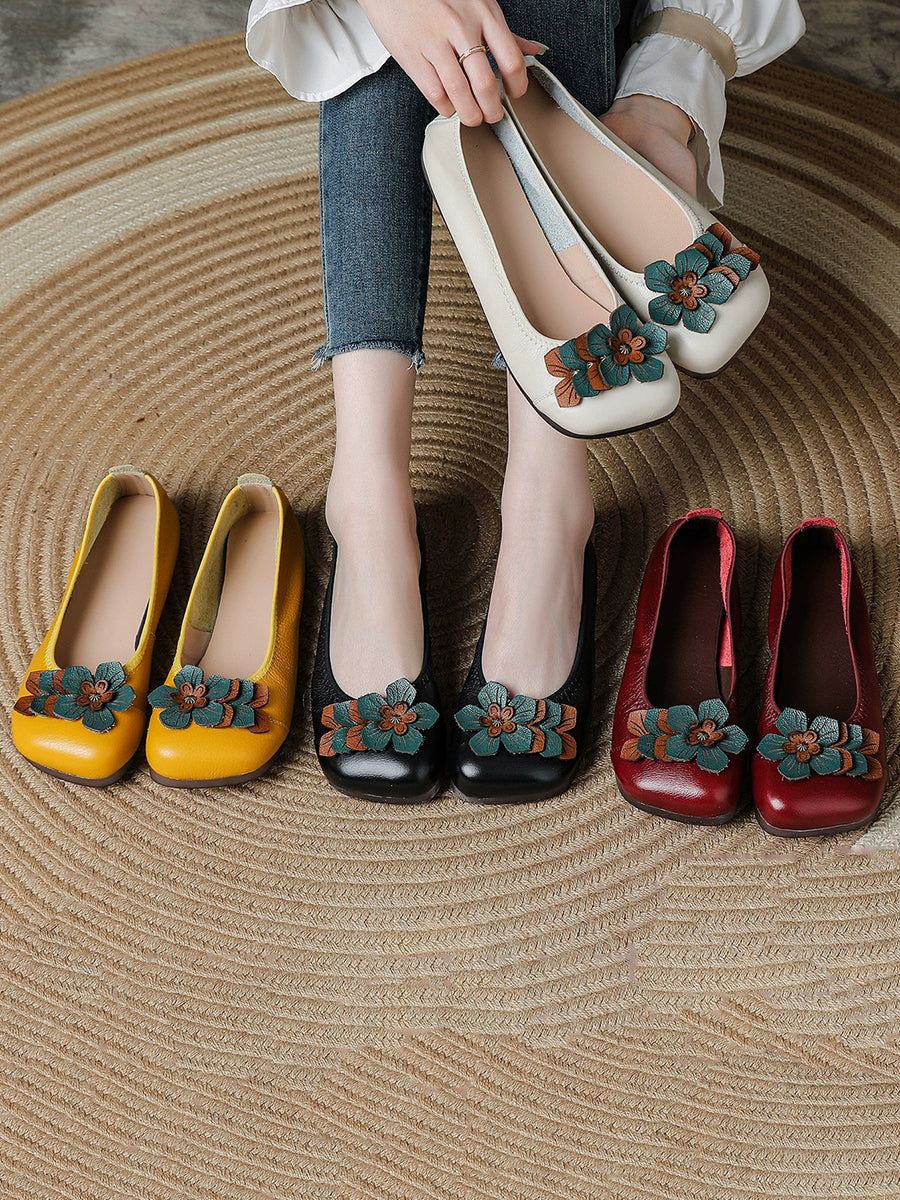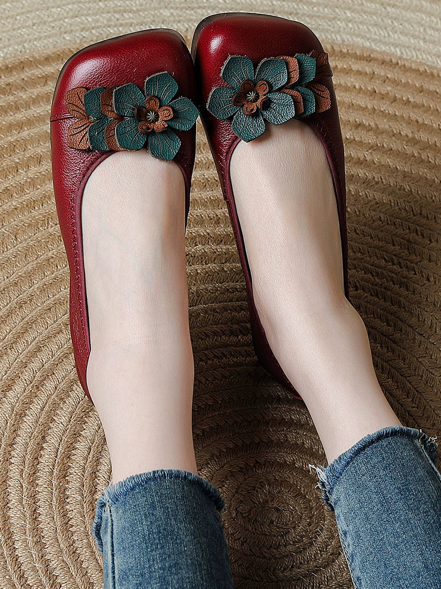 Sapatos femininos de couro legítimo com detalhes florais artísticos
