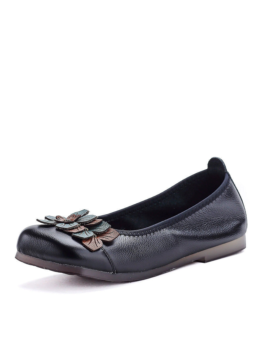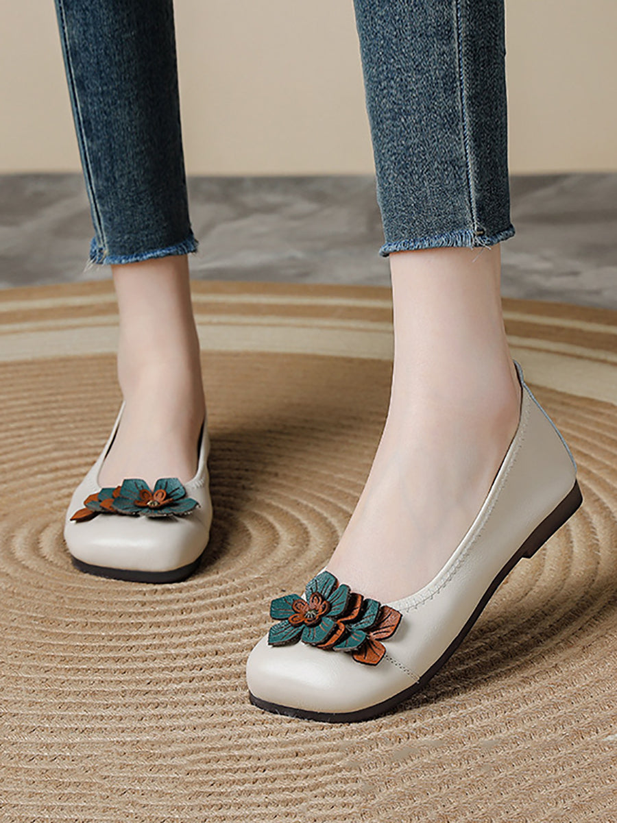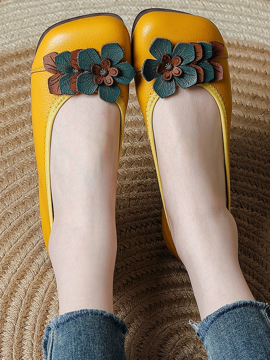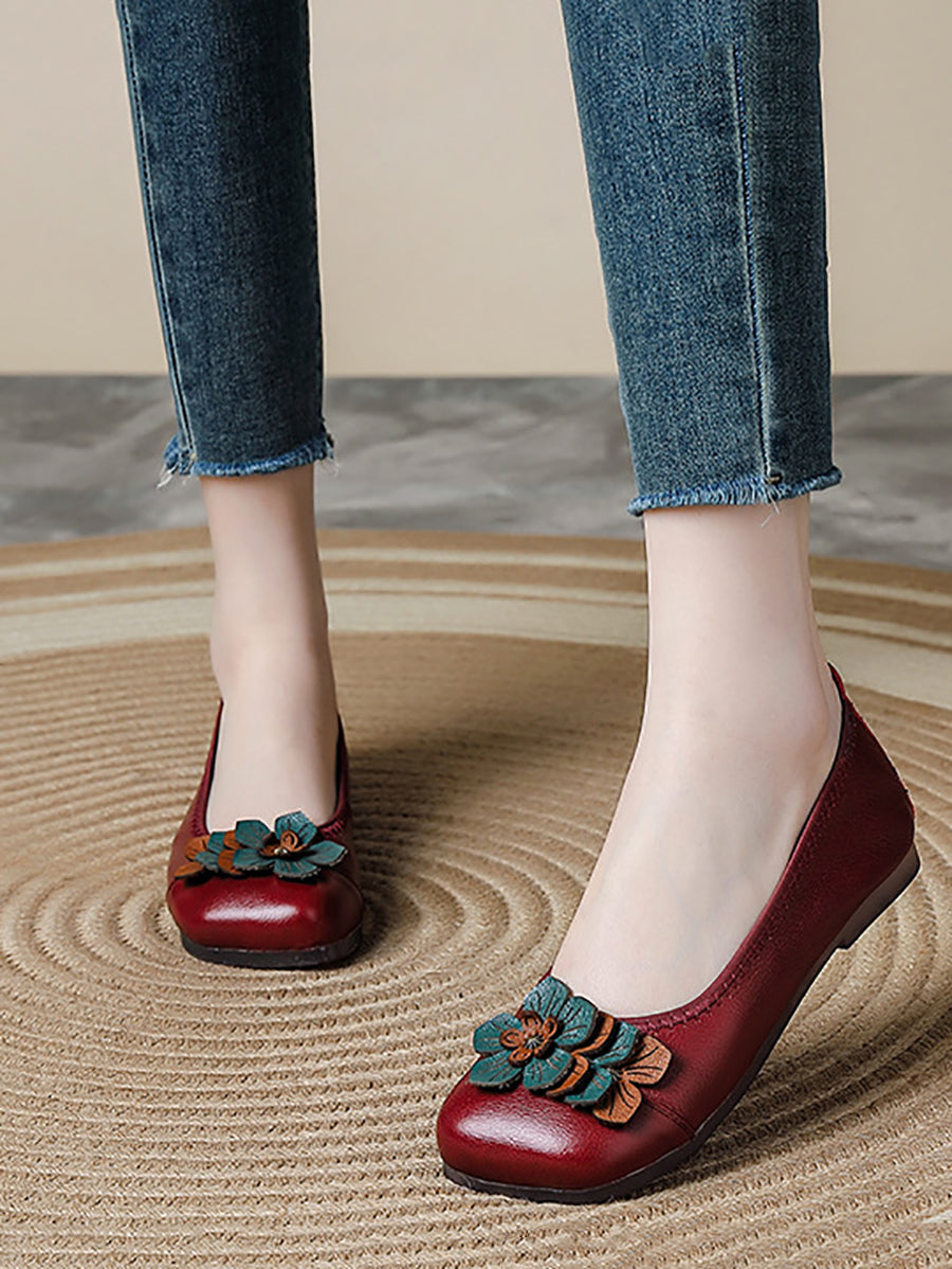 Sapatos femininos de couro legítimo com detalhes florais artísticos