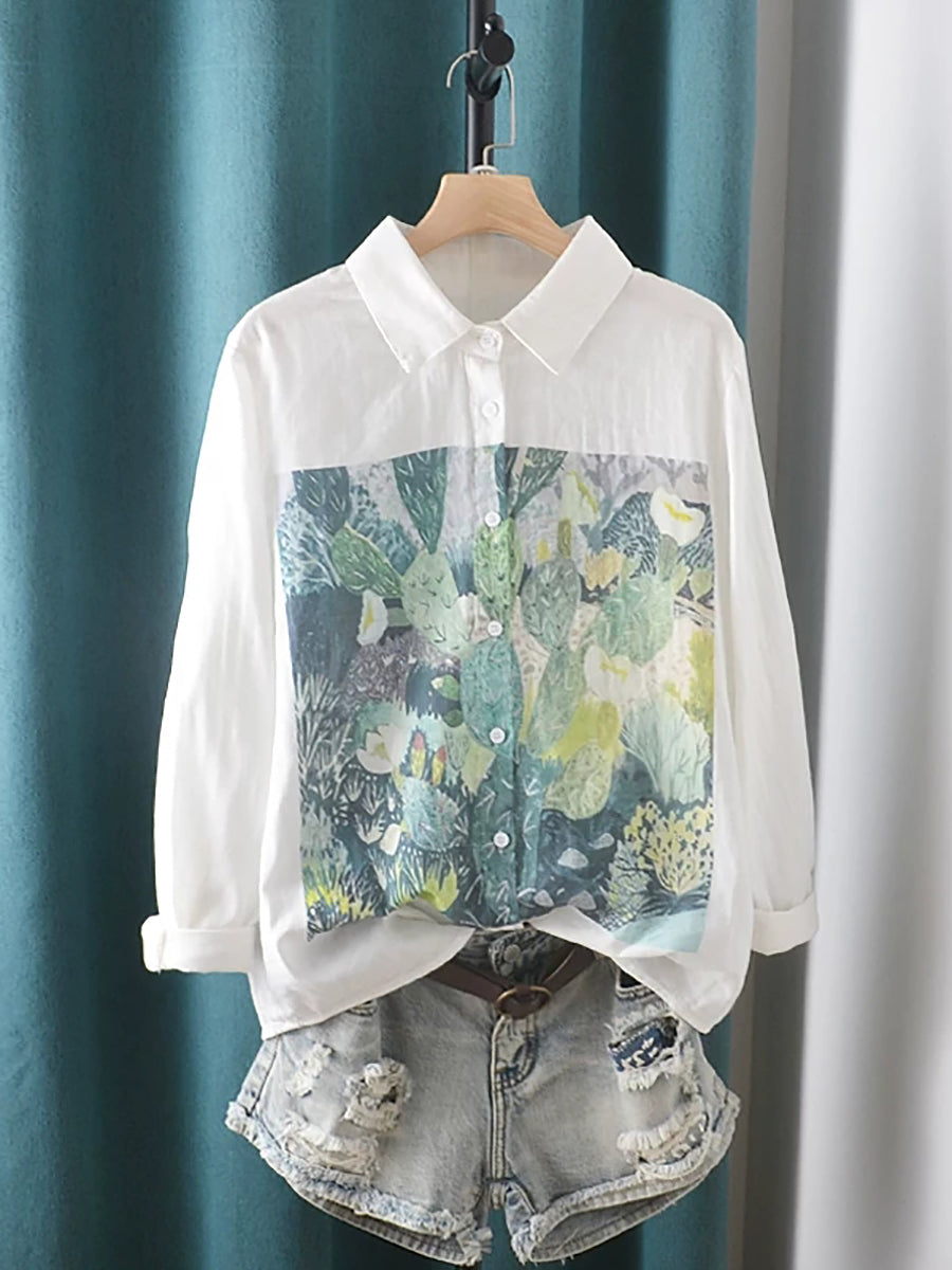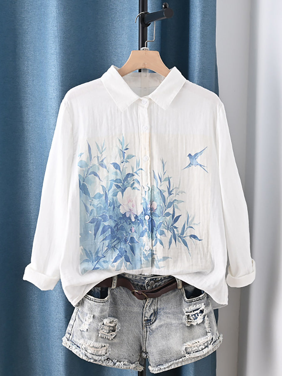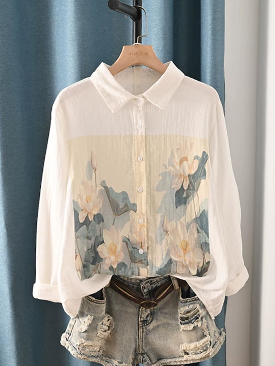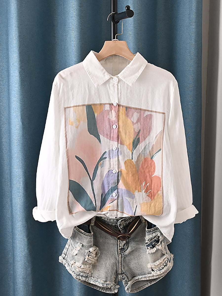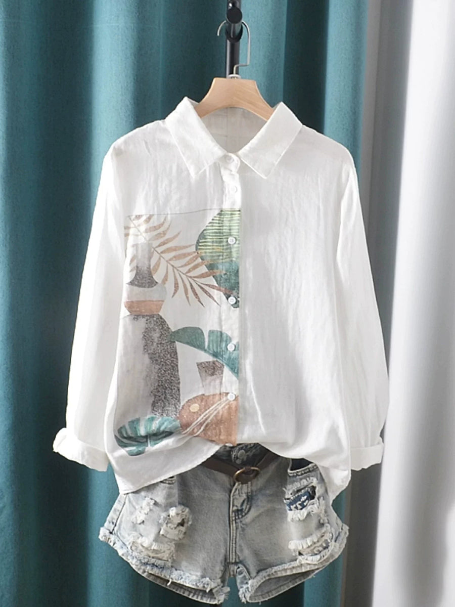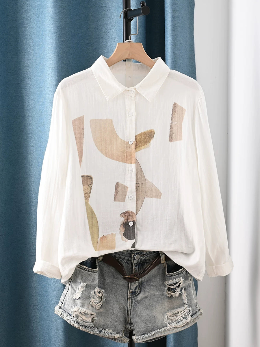 Camisa feminina Artsy Spring 100% algodão com gola dobrável