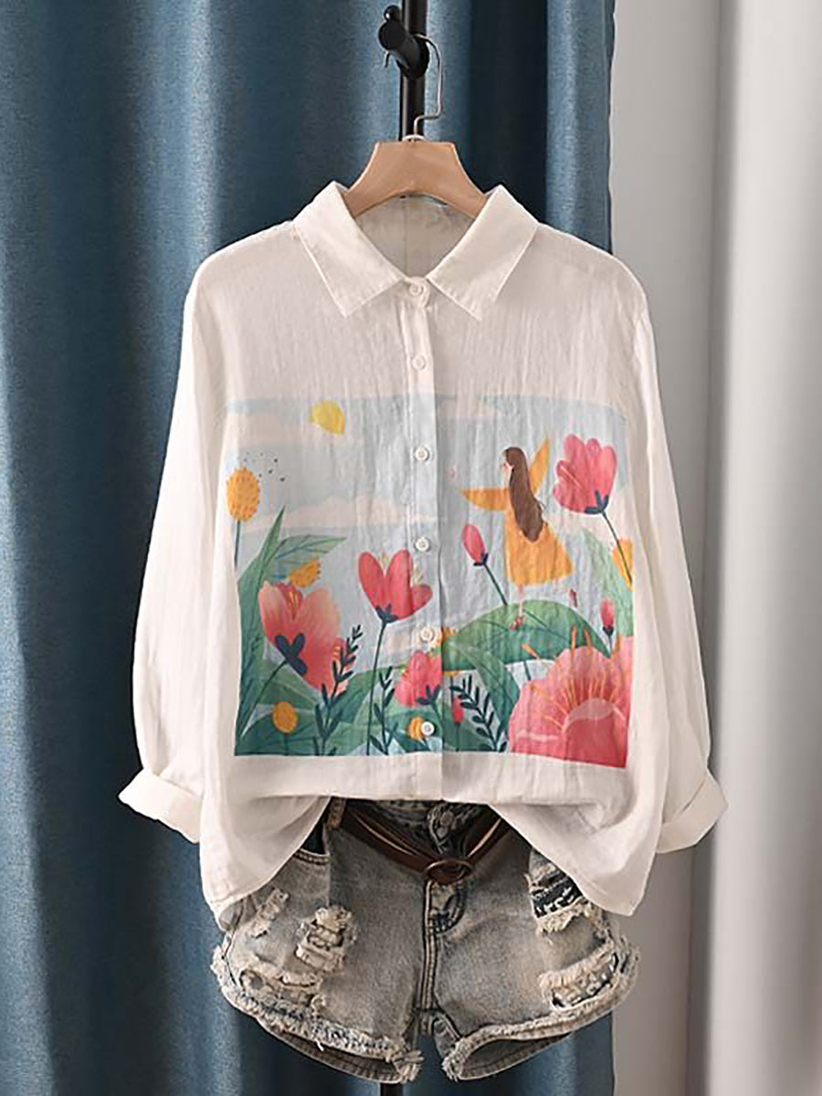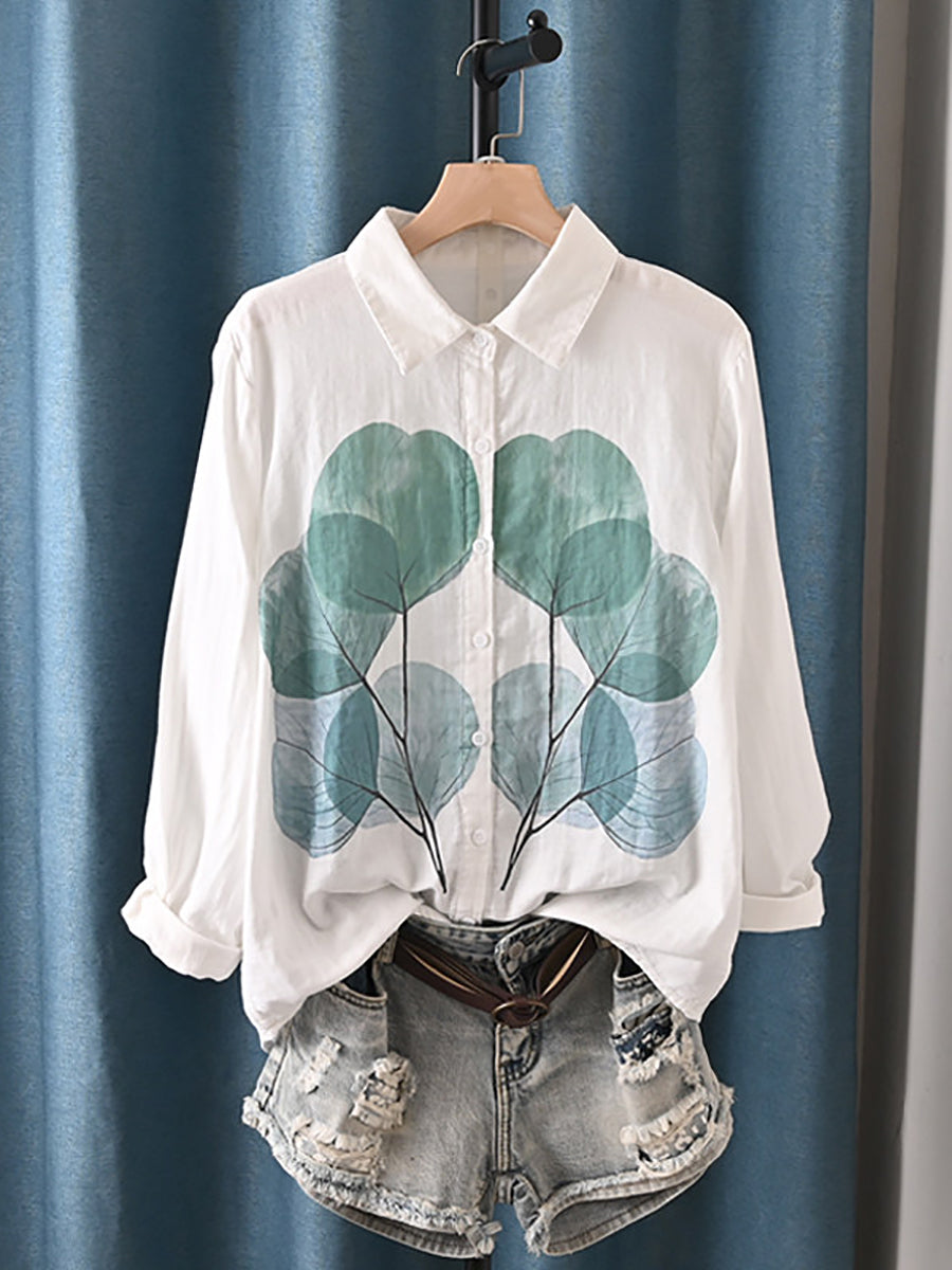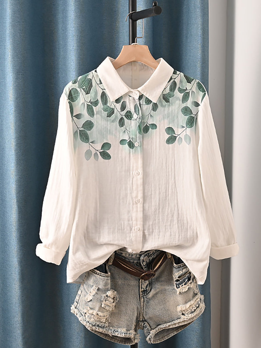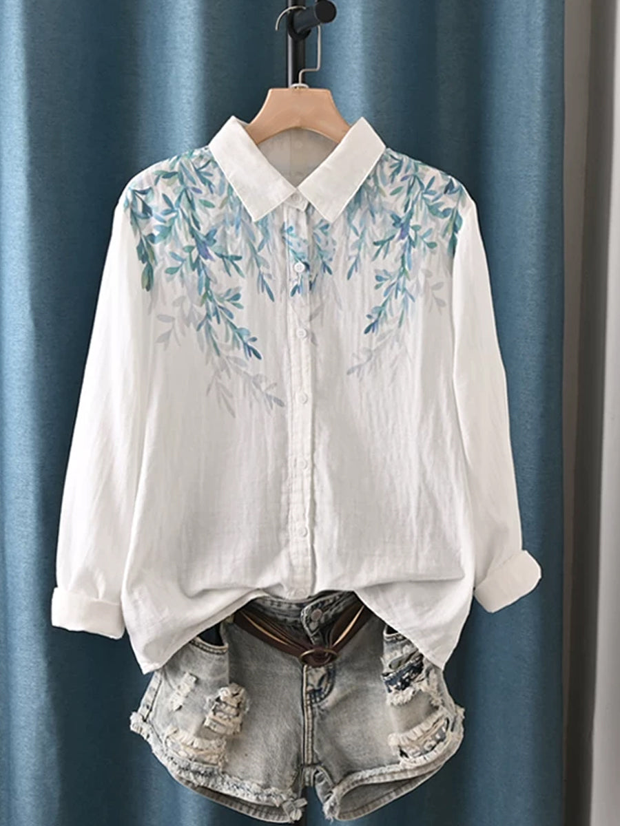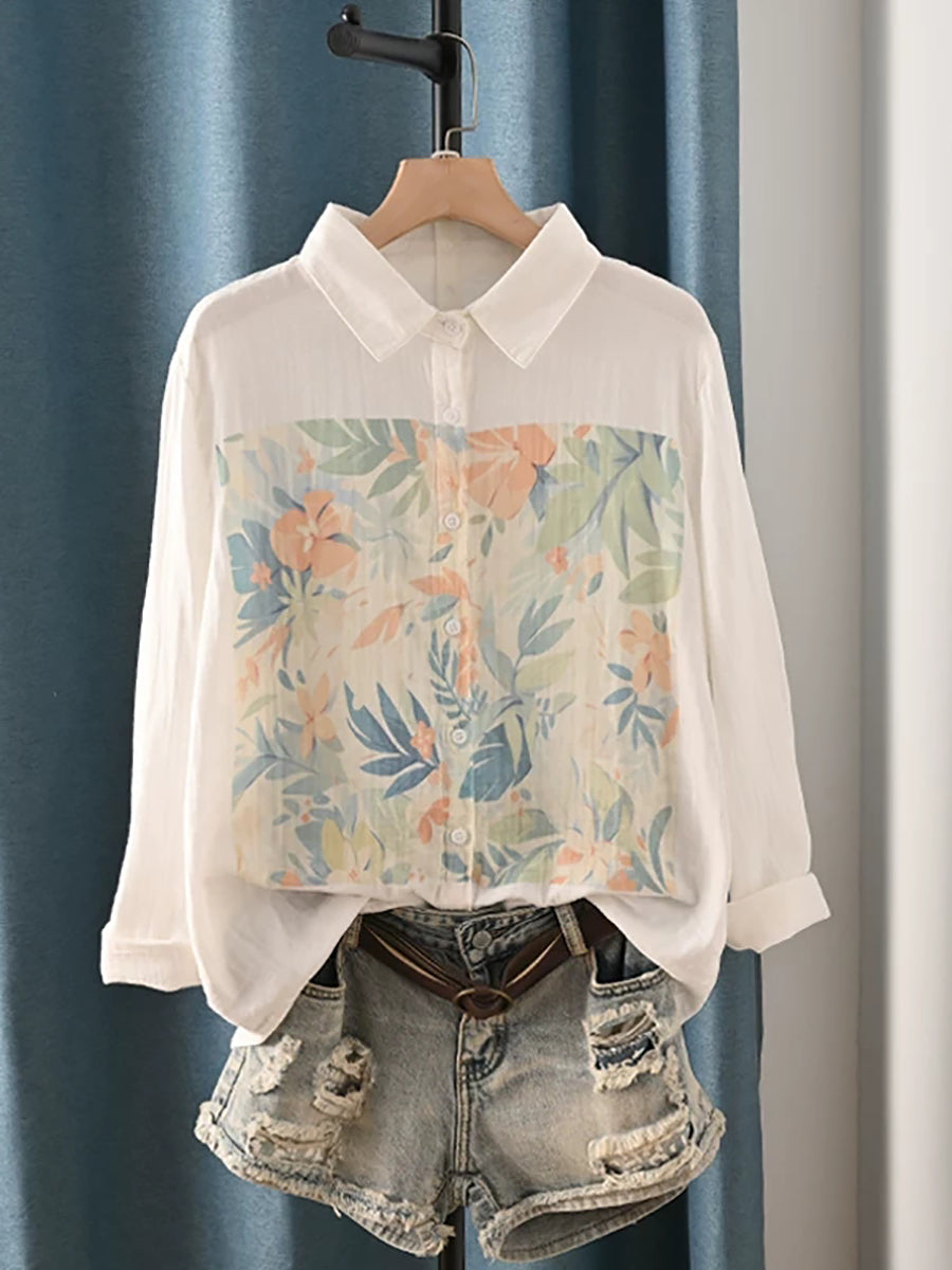 Camisa feminina Artsy Spring 100% algodão com gola dobrável