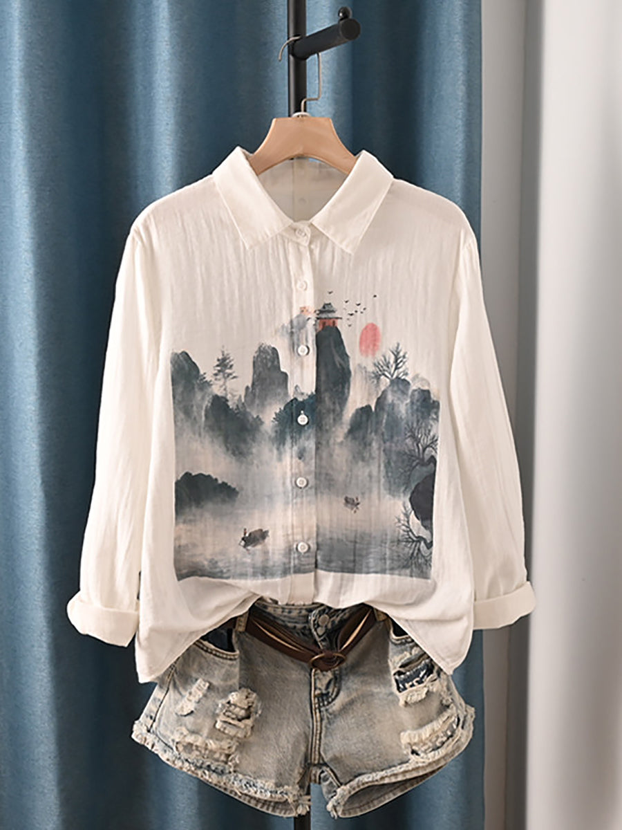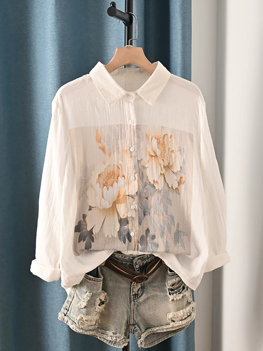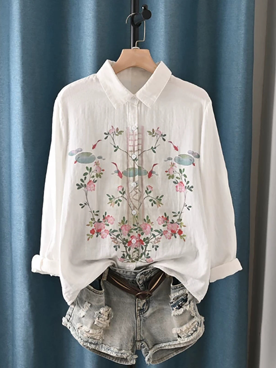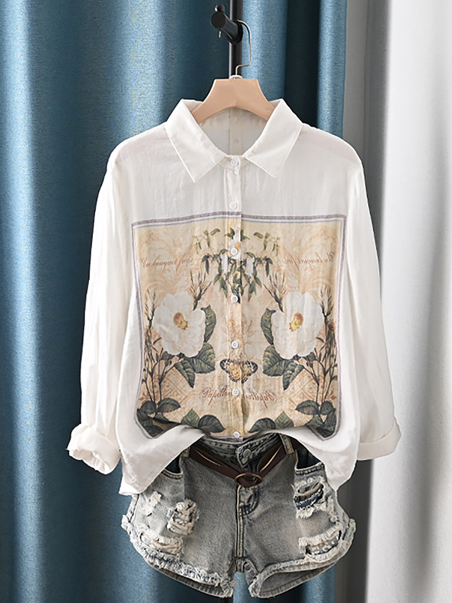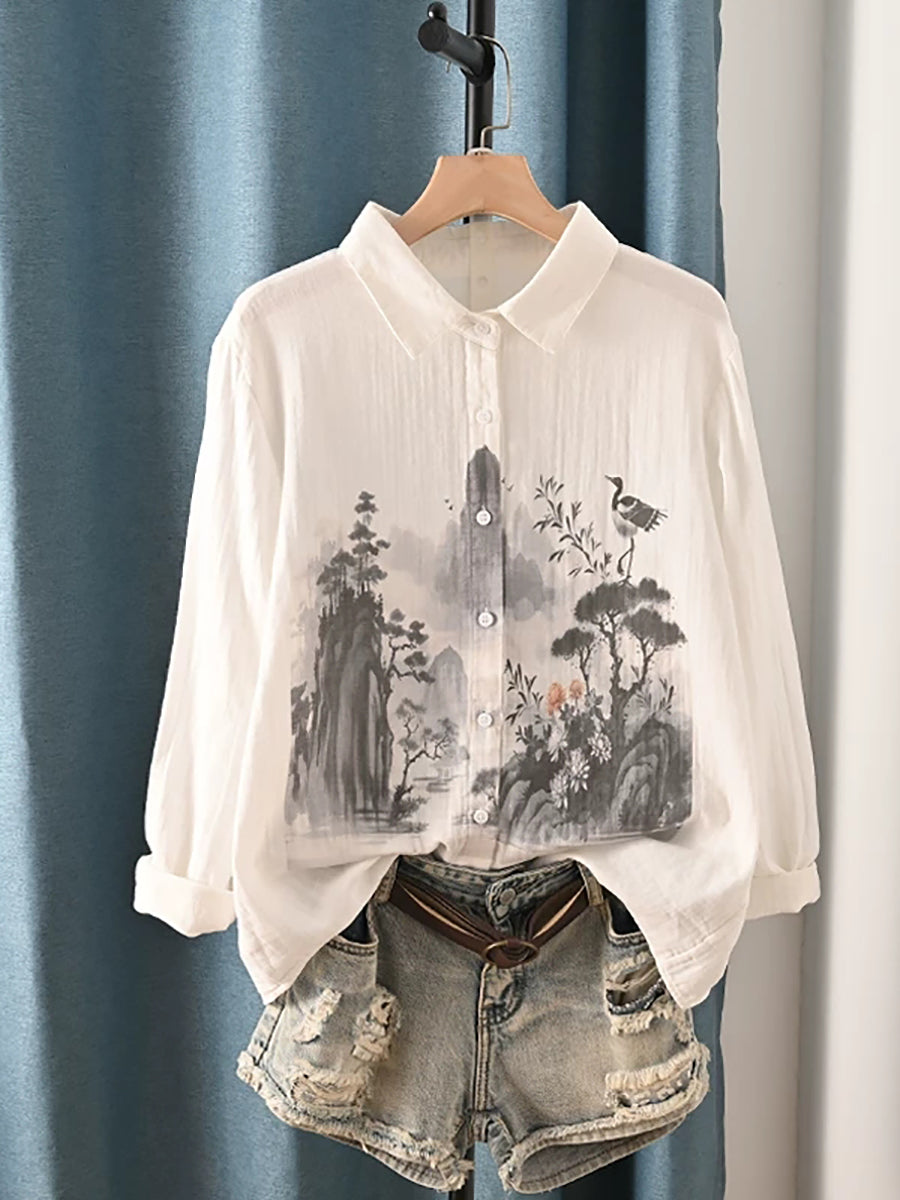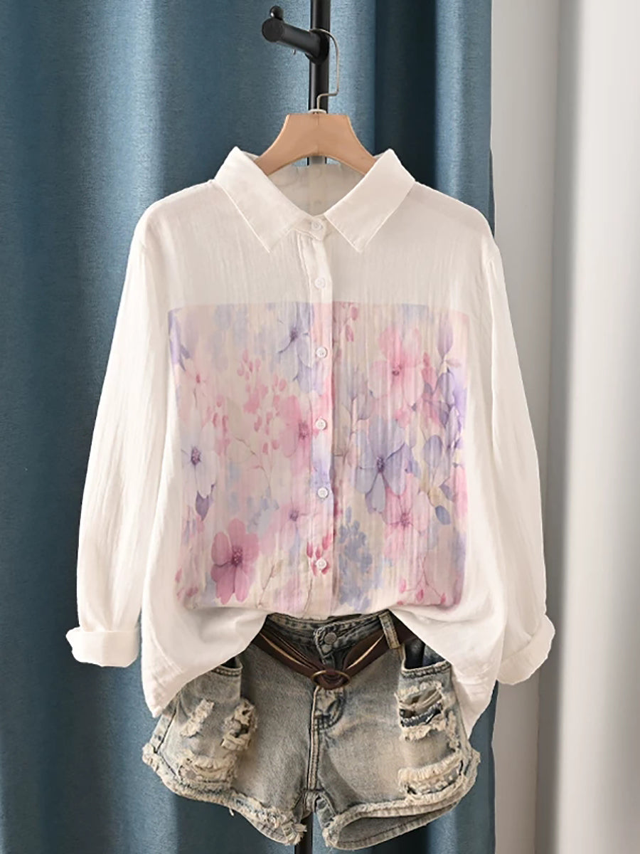 Camisa feminina Artsy Spring 100% algodão com gola dobrável