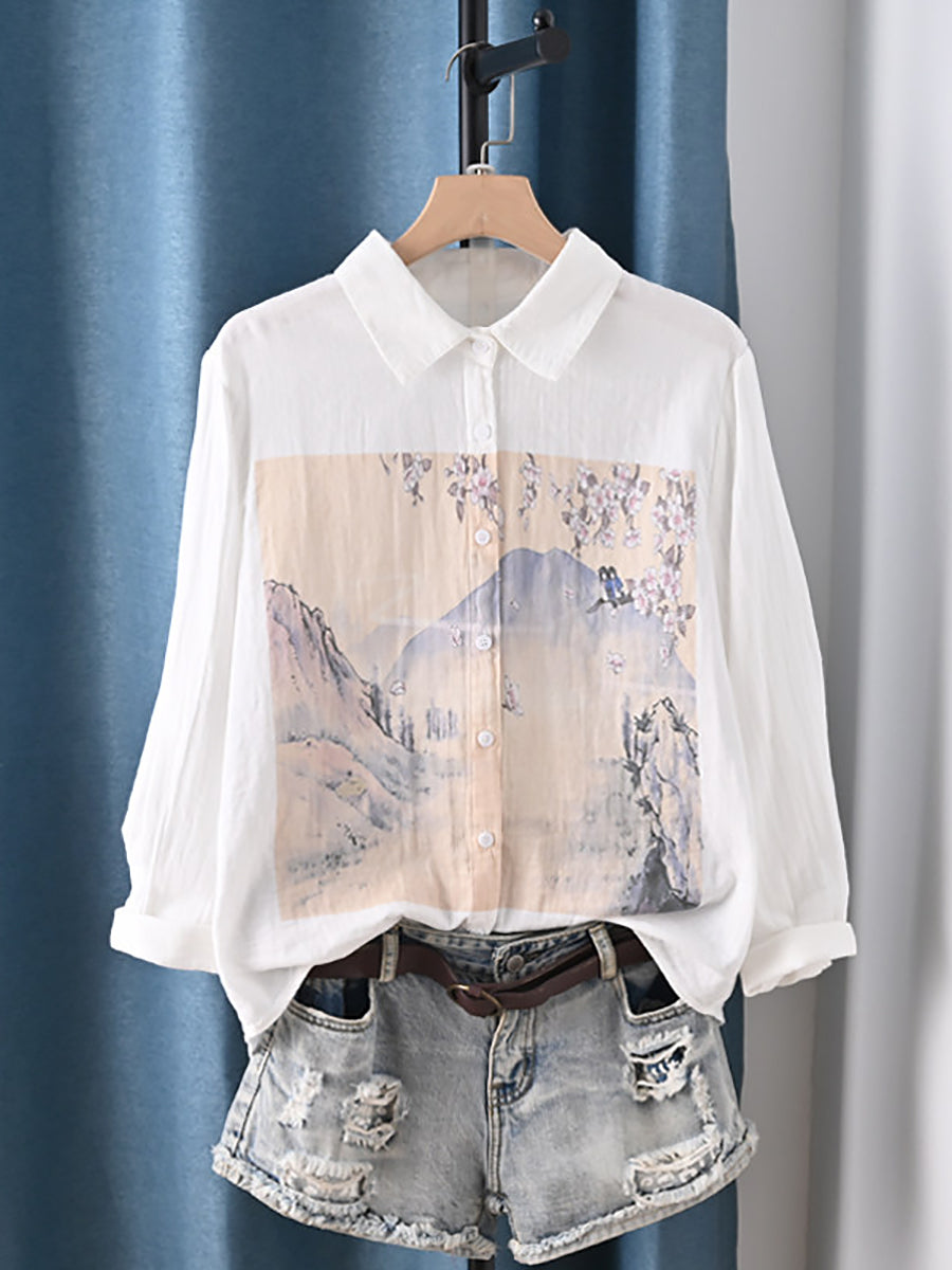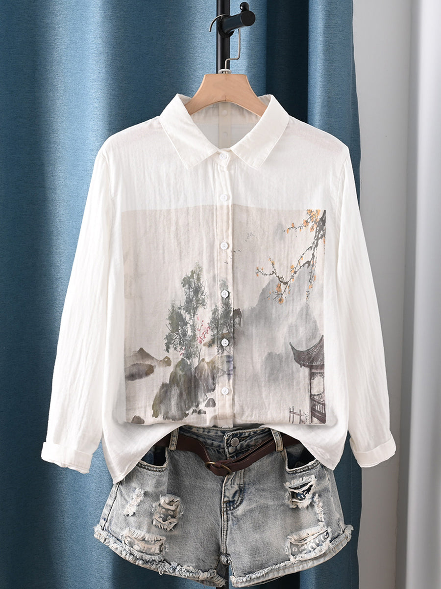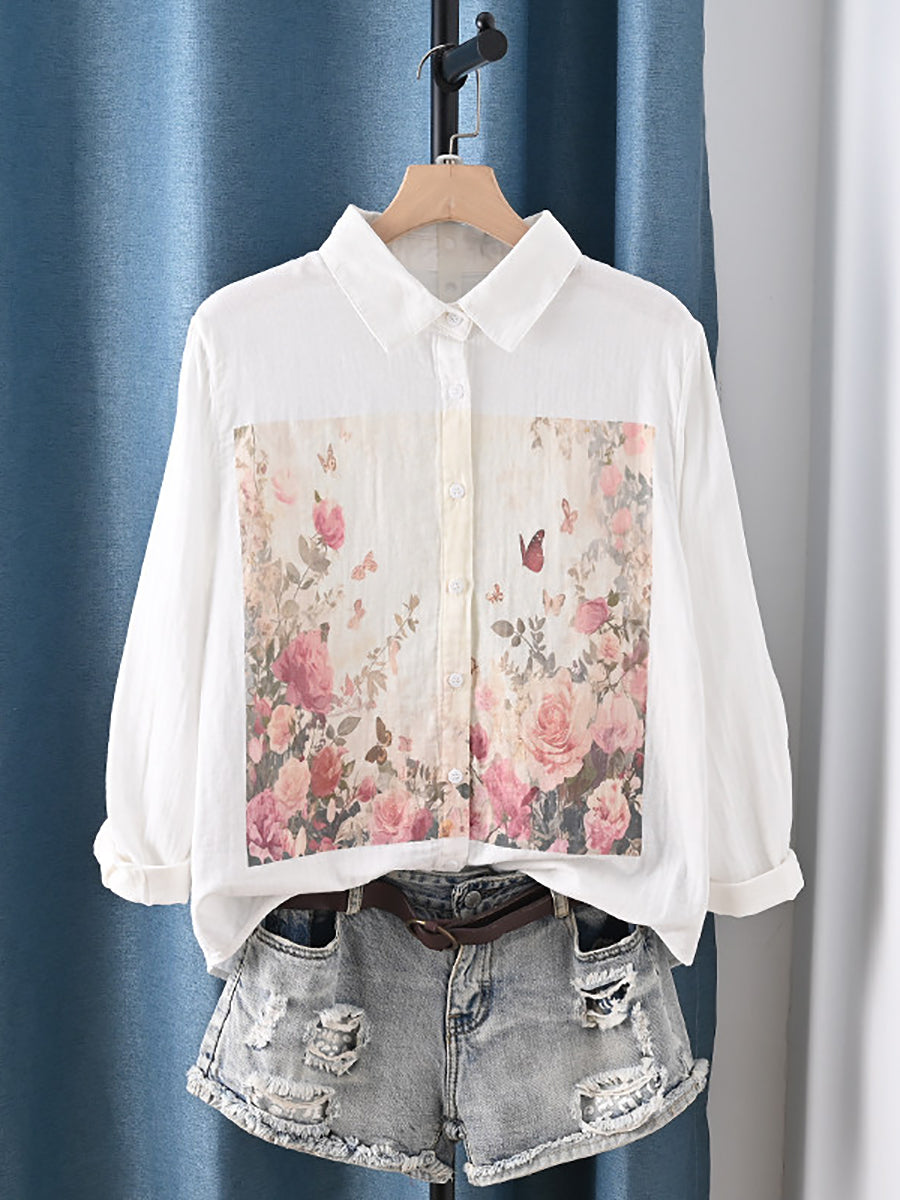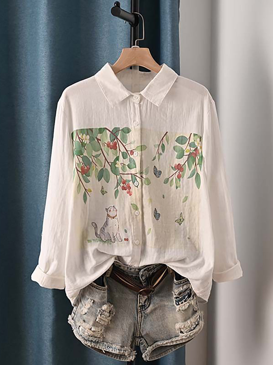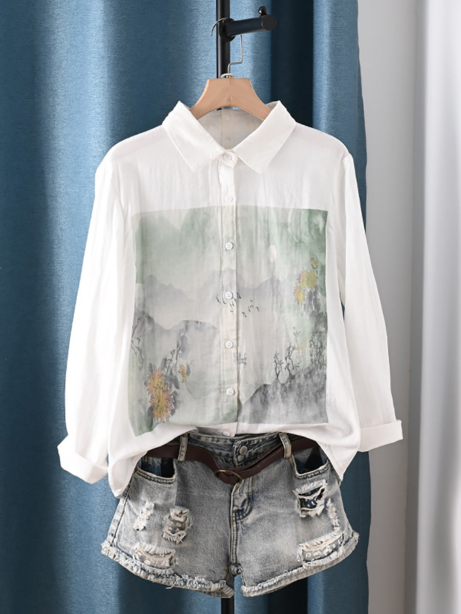 Camisa feminina Artsy Spring 100% algodão com gola dobrável