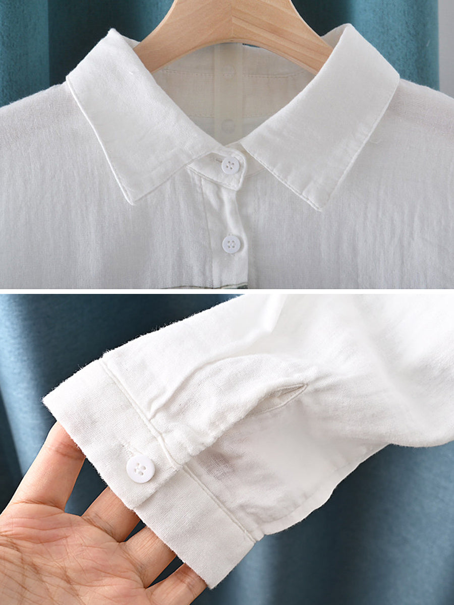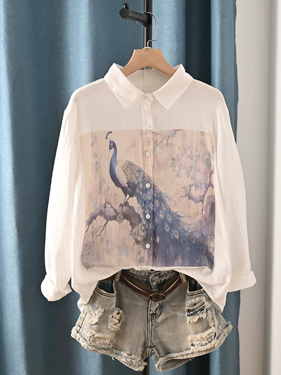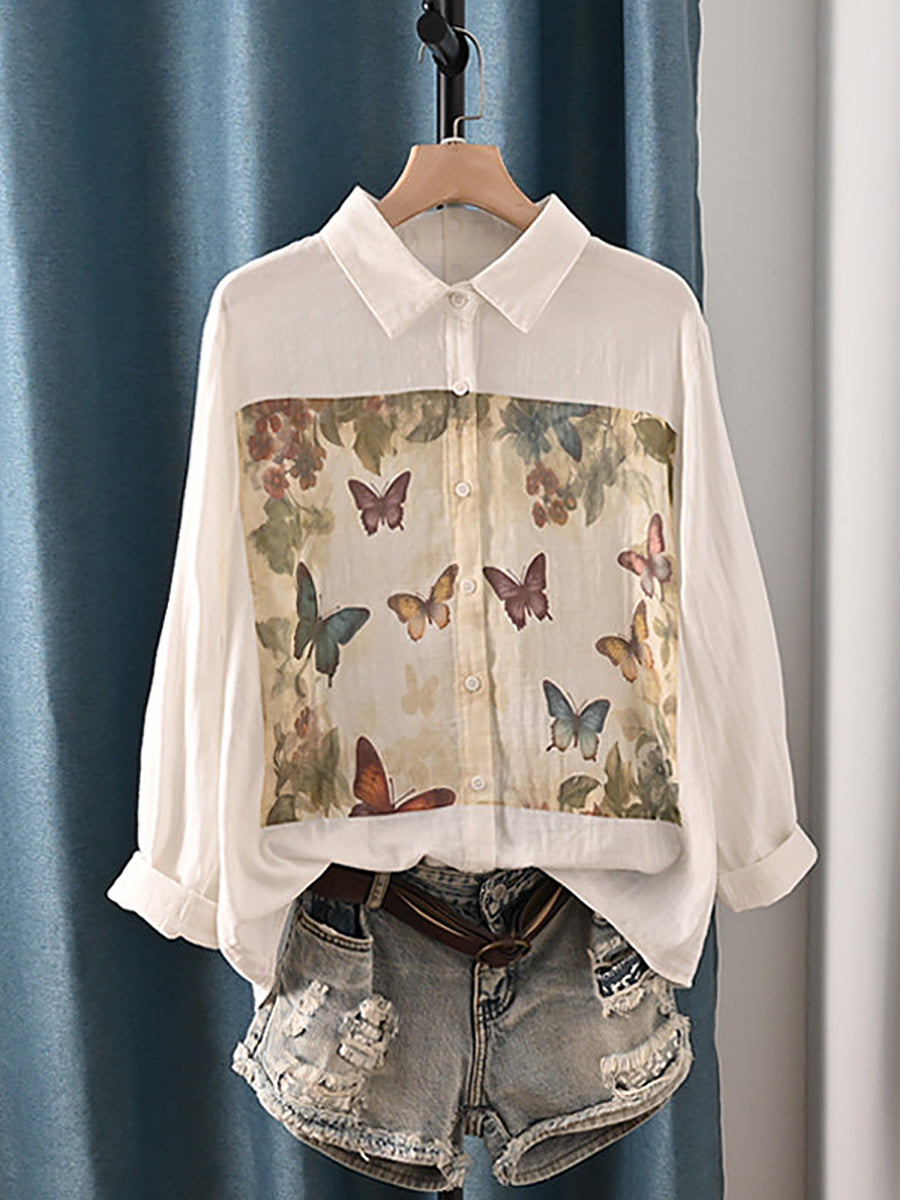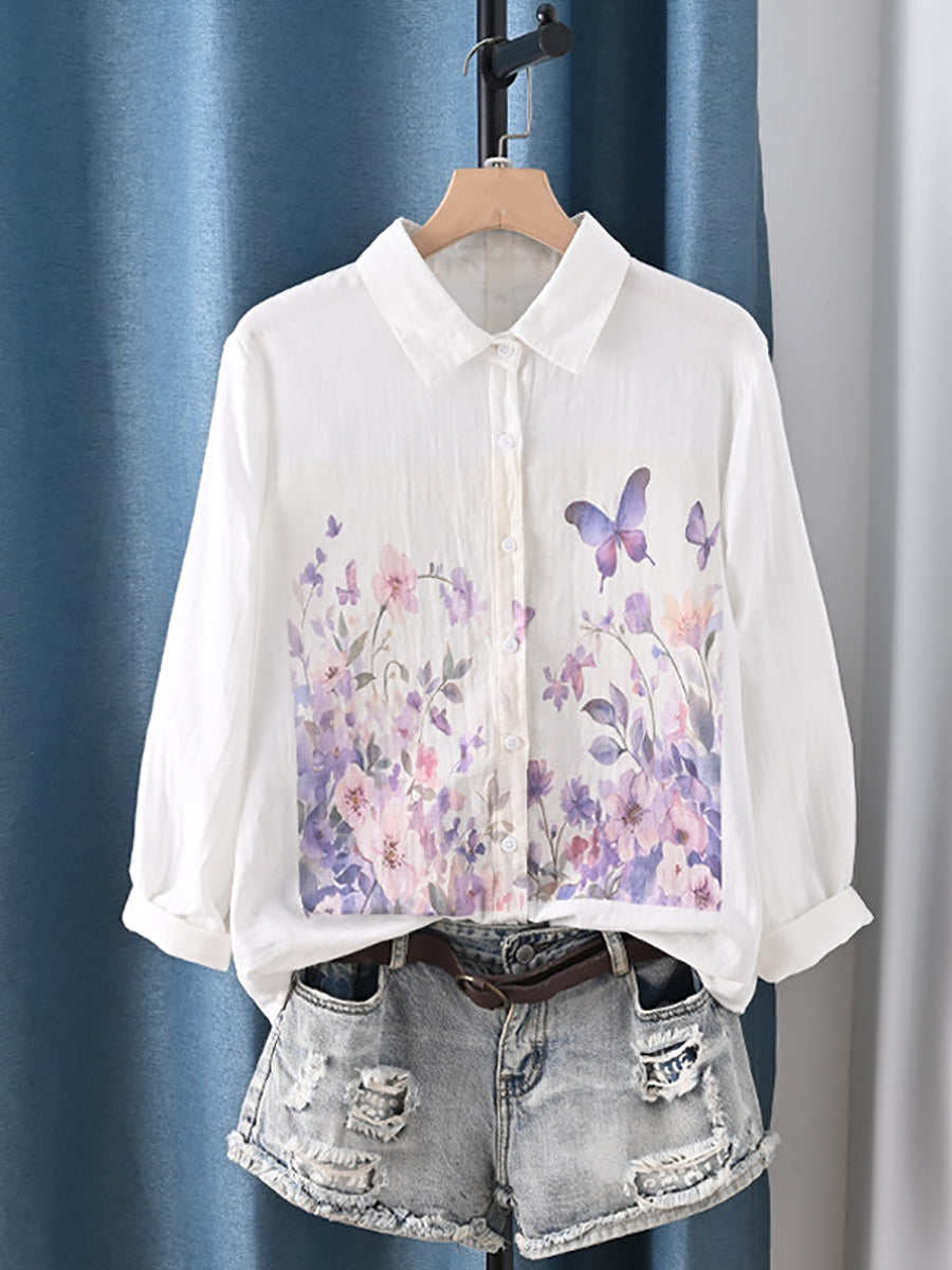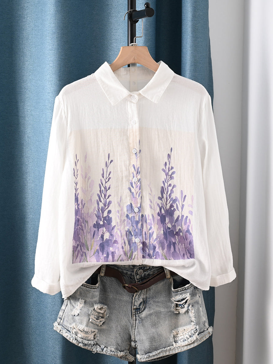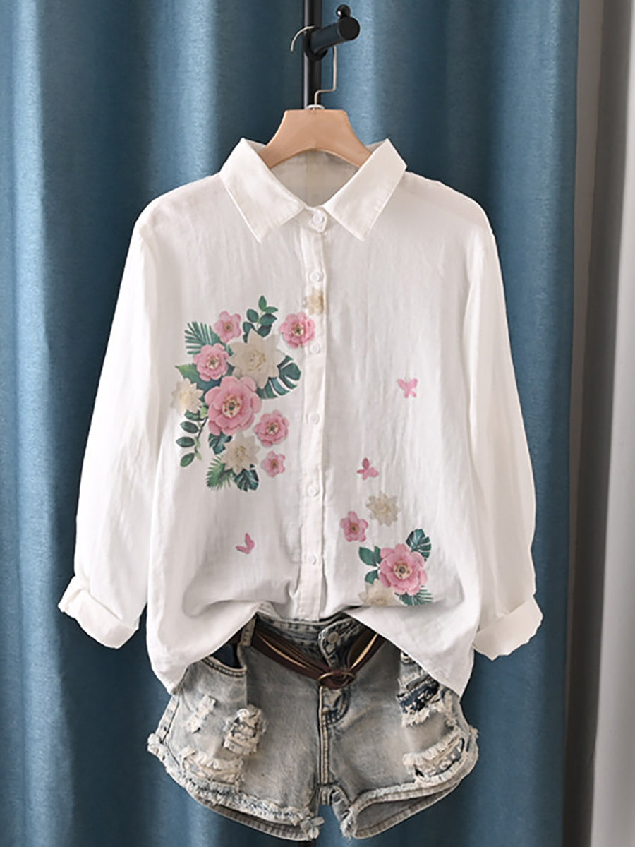 Camisa feminina Artsy Spring 100% algodão com gola dobrável