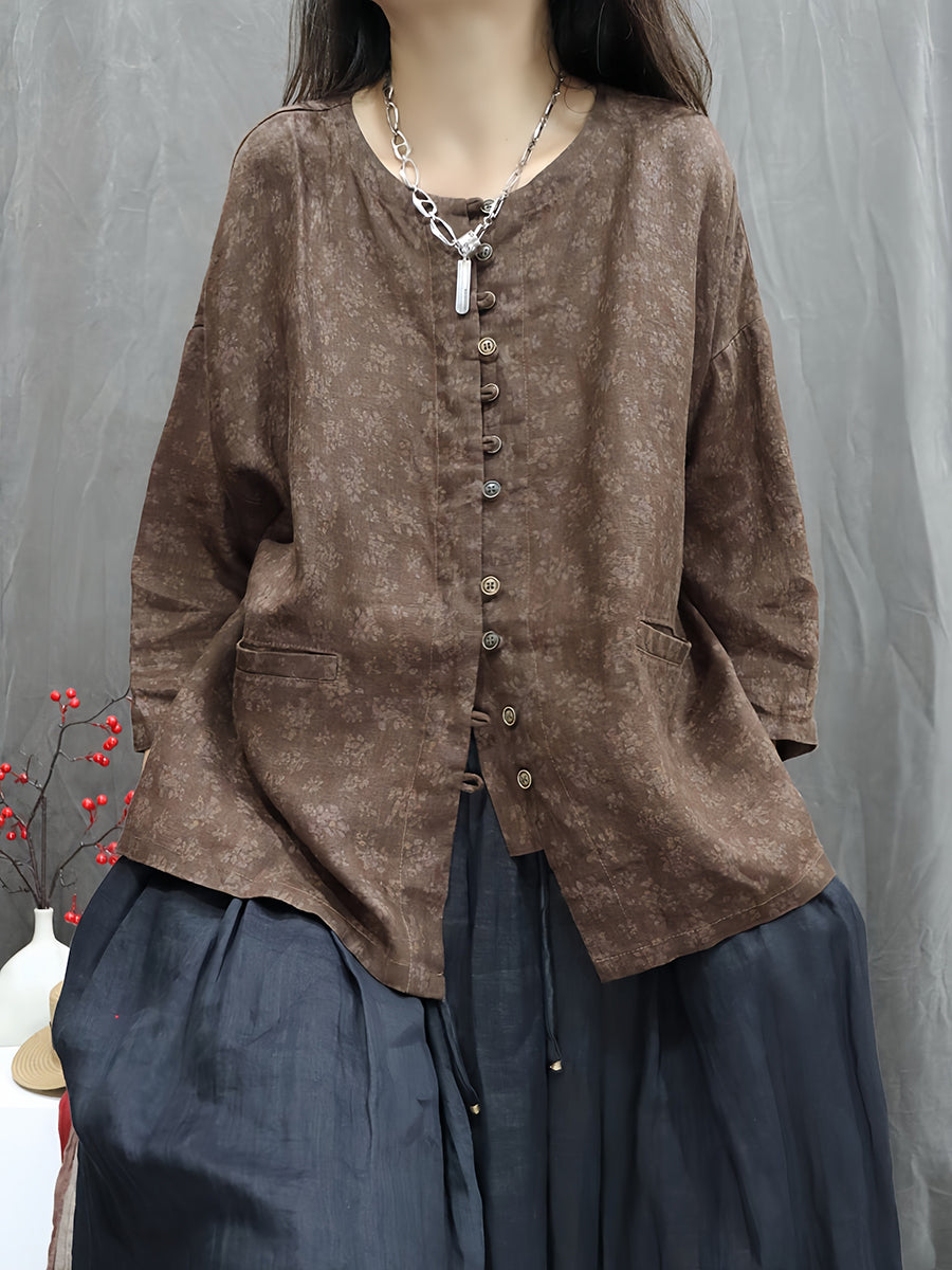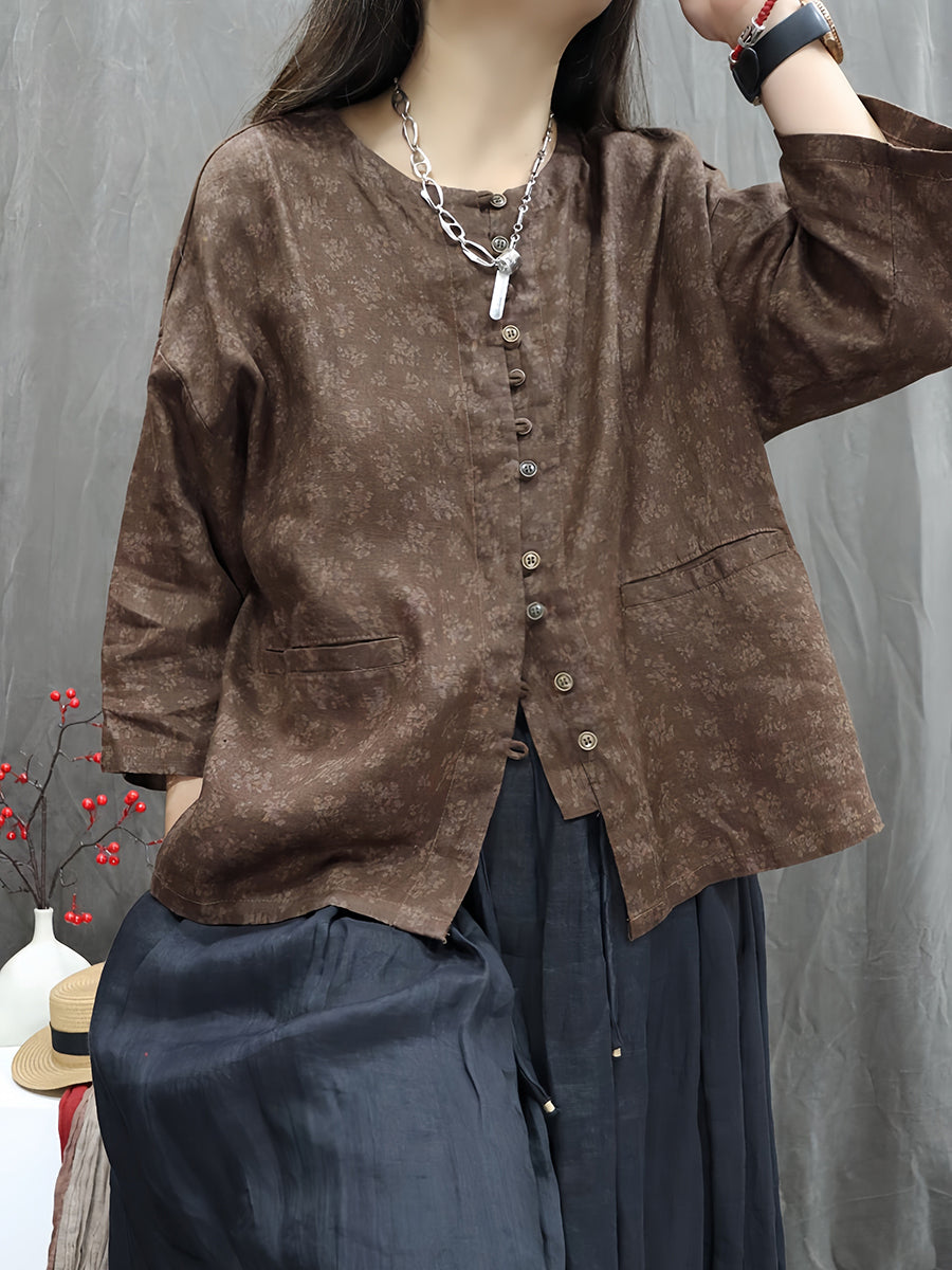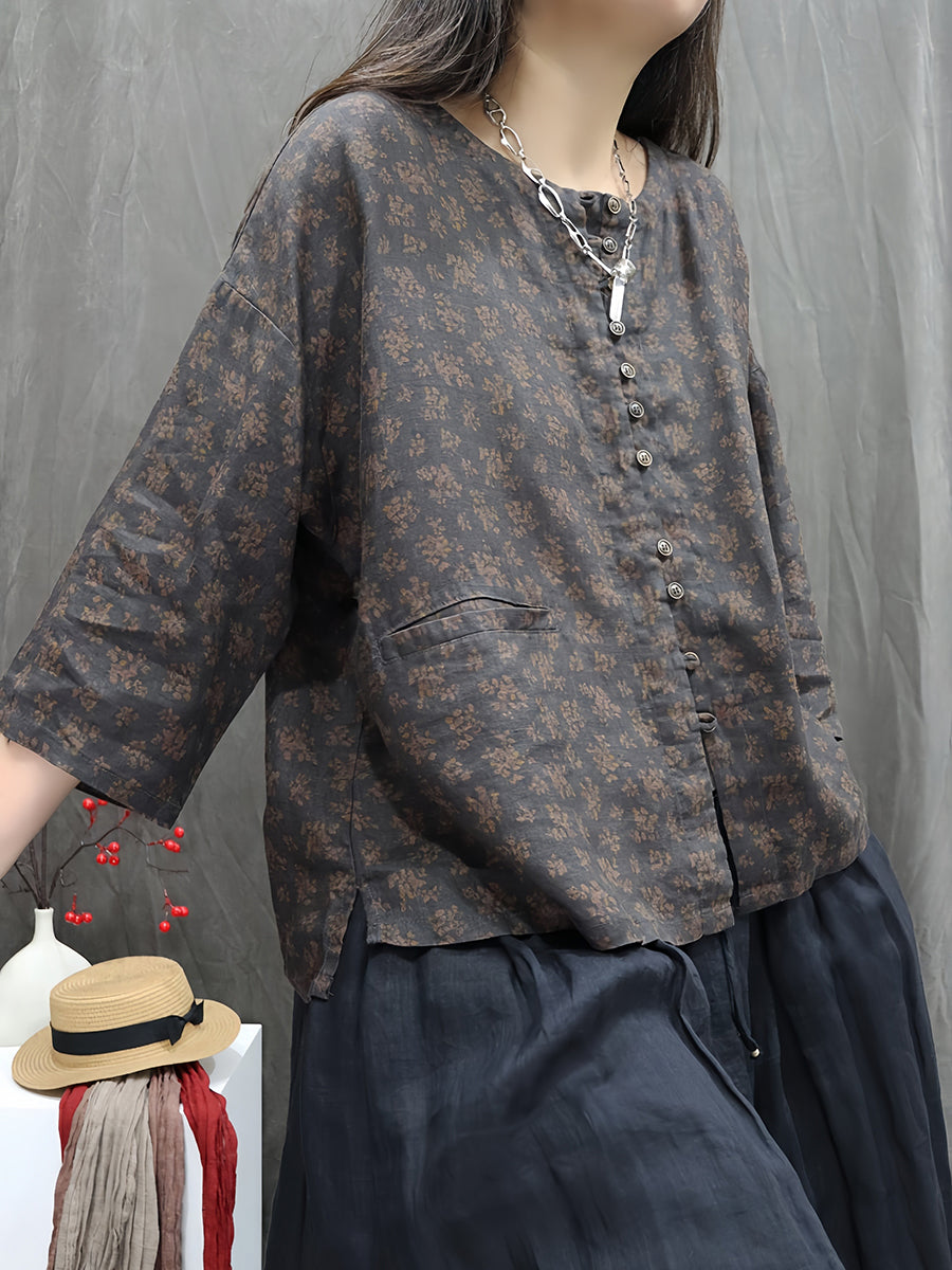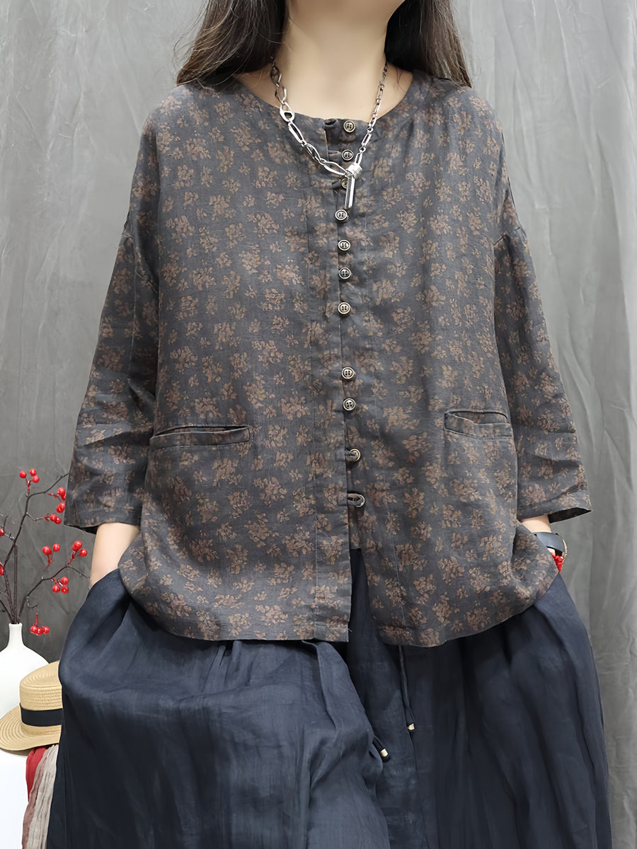Camisa feminina Artsy Spring Floral 100% linho com gola redonda