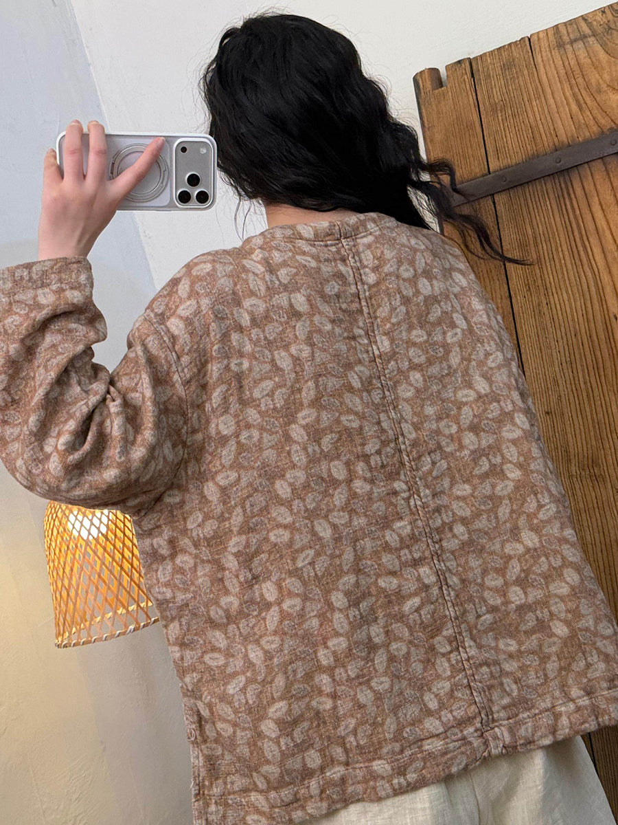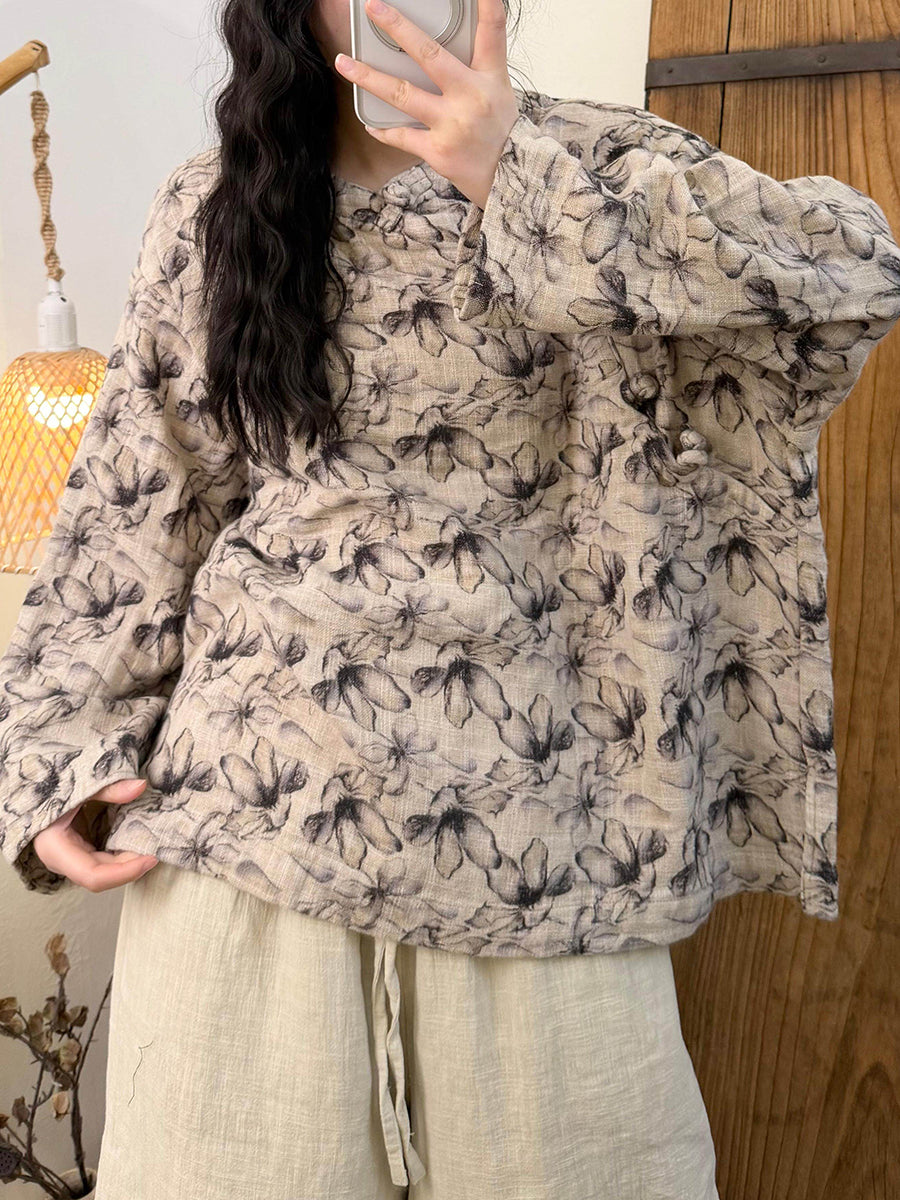 Blusa feminina artística com estampa floral e decote redondo, estilo primavera.