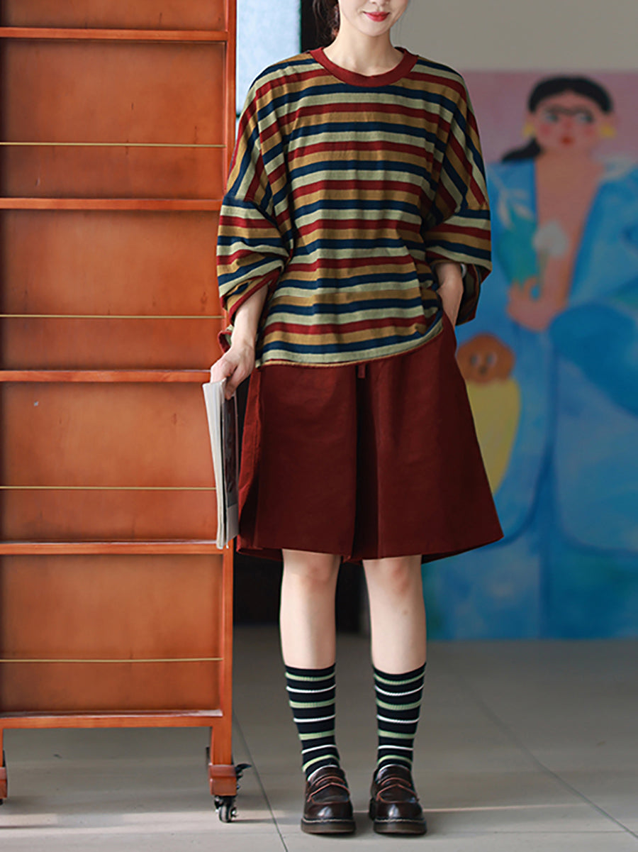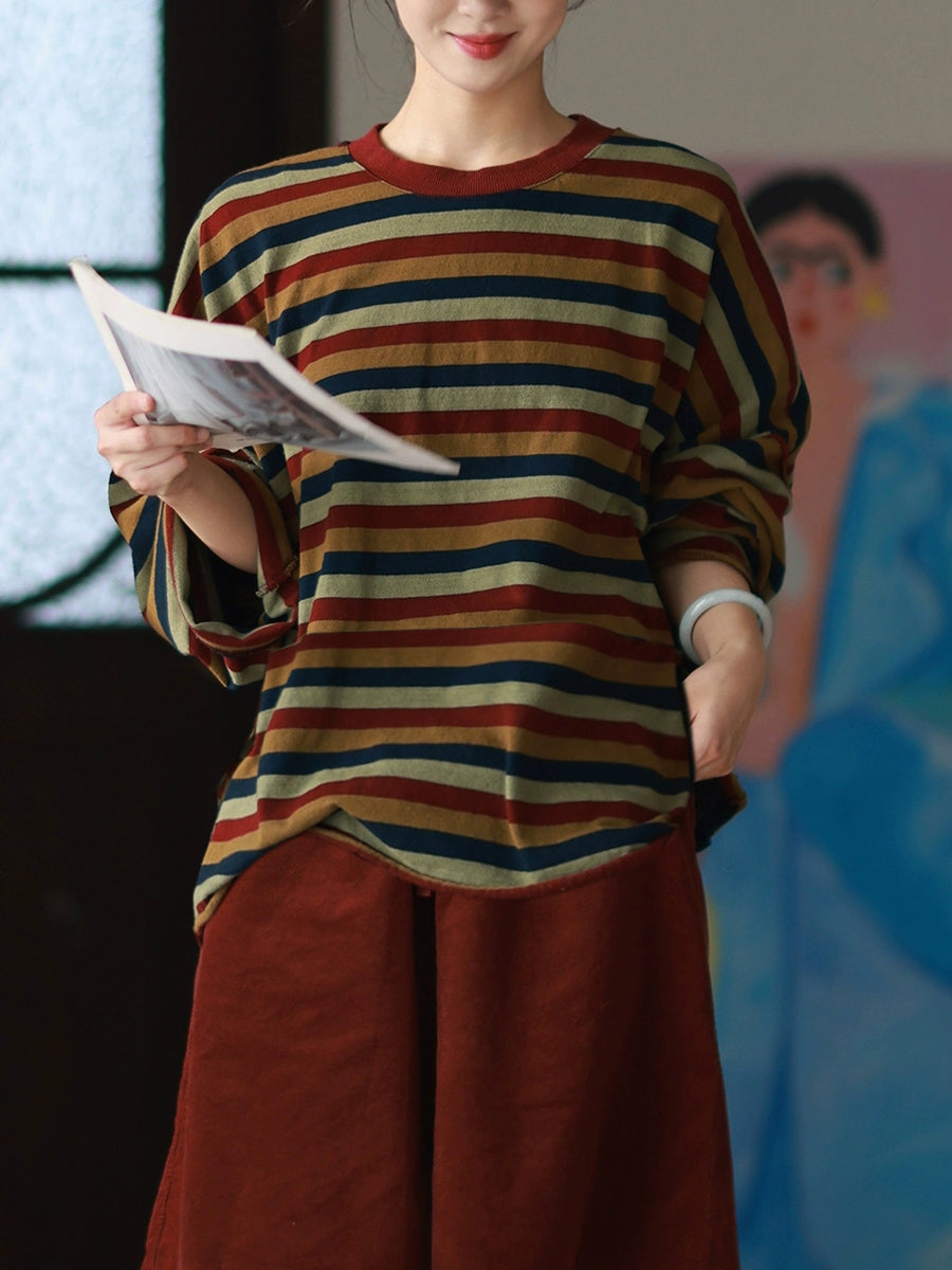 Blusa feminina casual de outono listrada com gola redonda 100% algodão