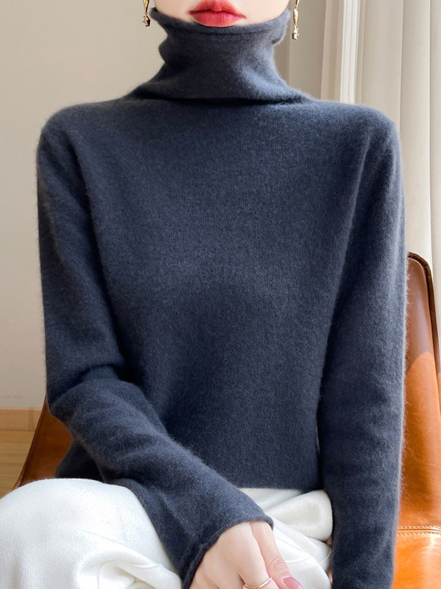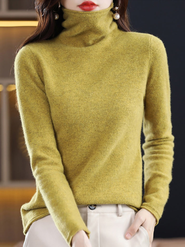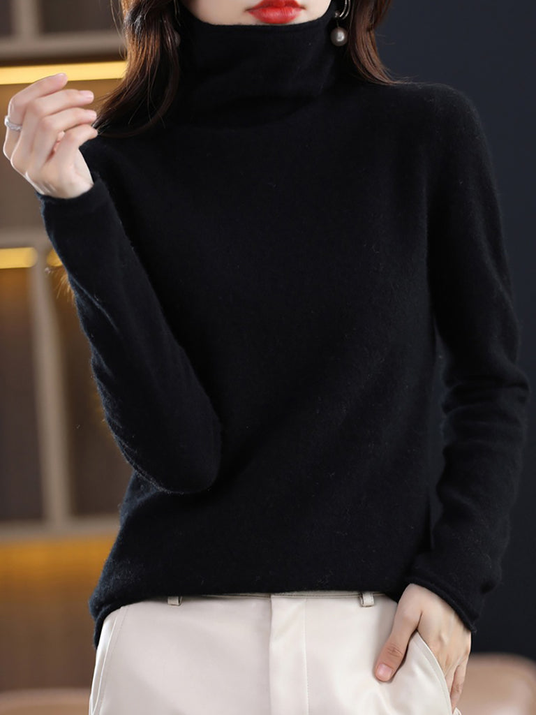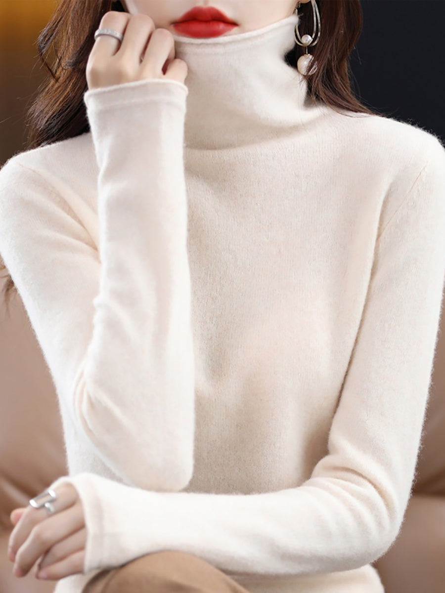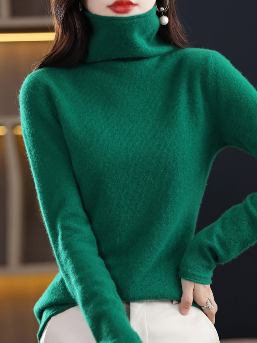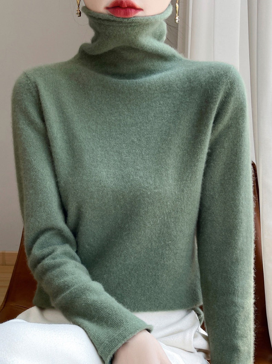 Suéter feminino de gola alta em lã de cor pura para o outono