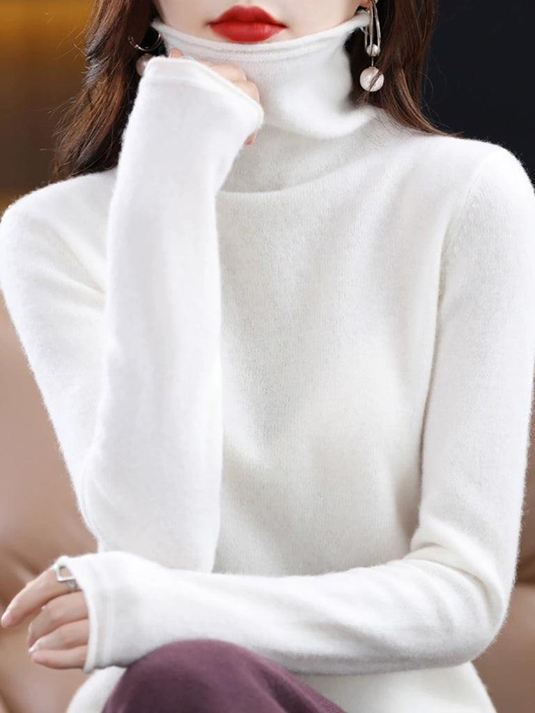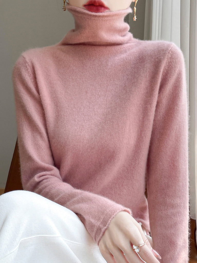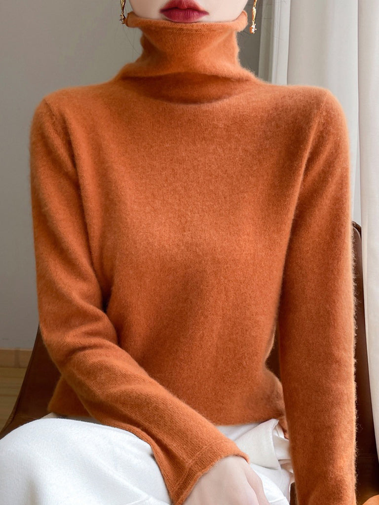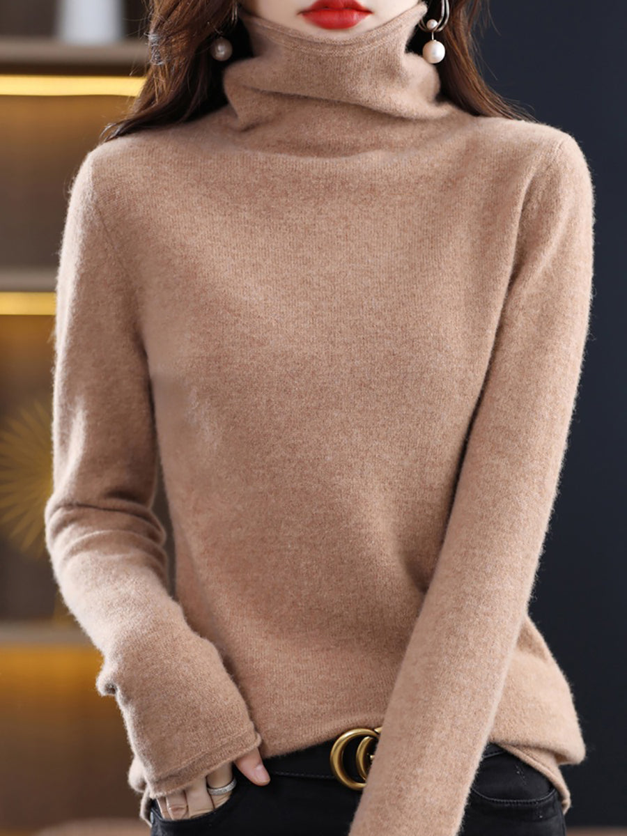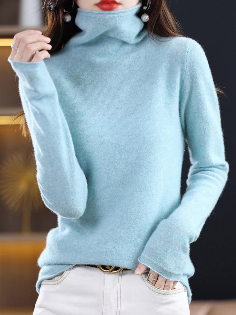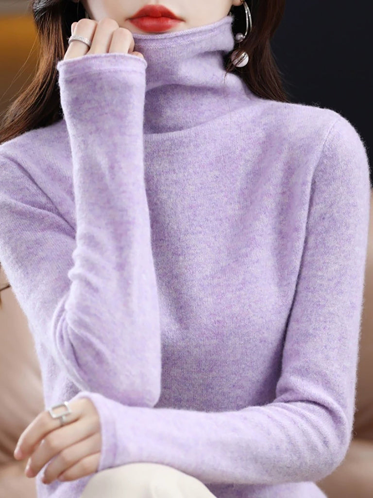 Suéter feminino de gola alta em lã de cor pura para o outono