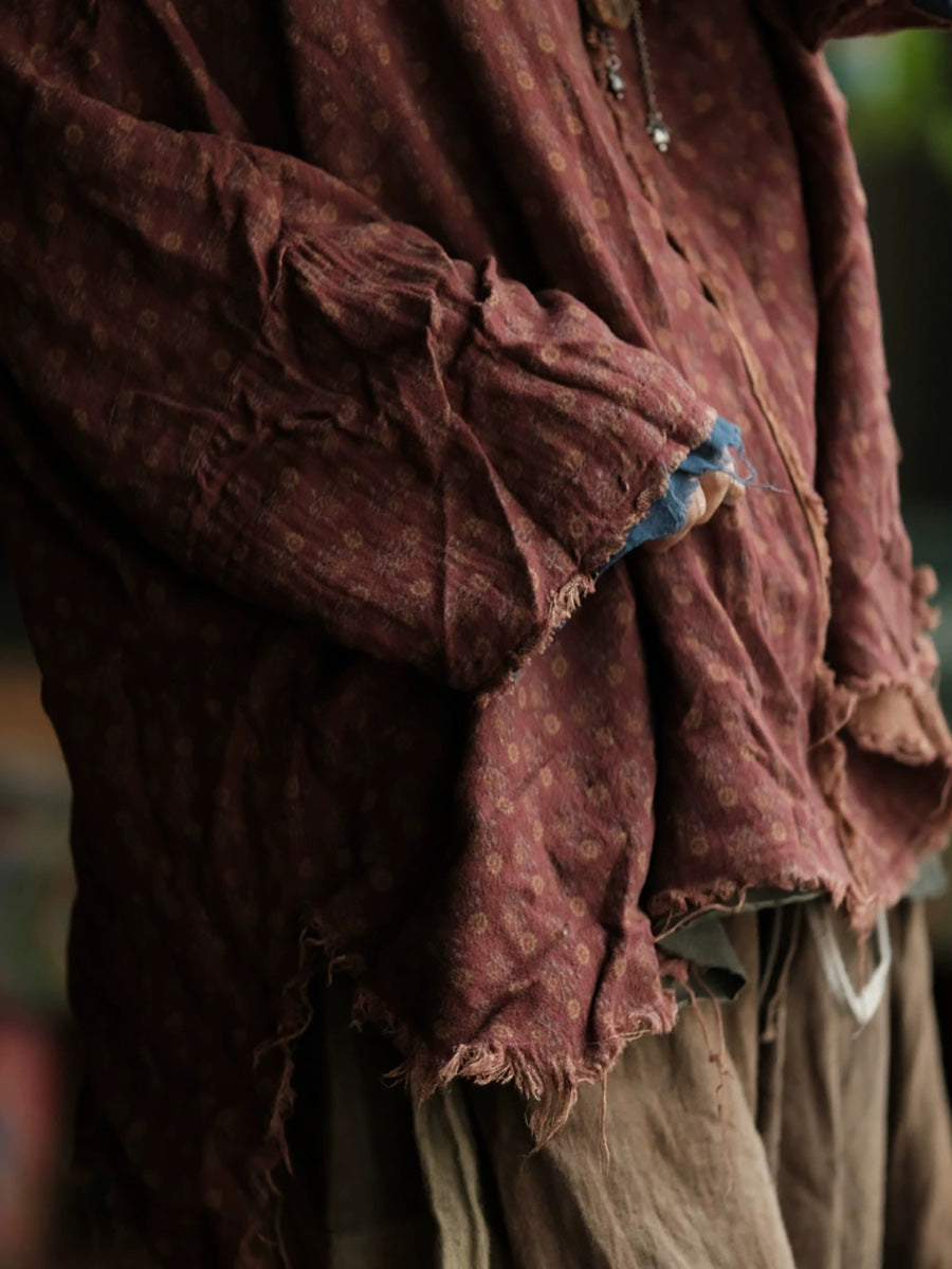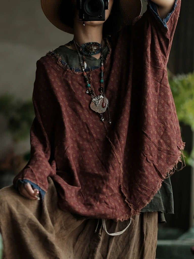 Camisa feminina de algodão com estampa retrô de outono e gola redonda com borda crua