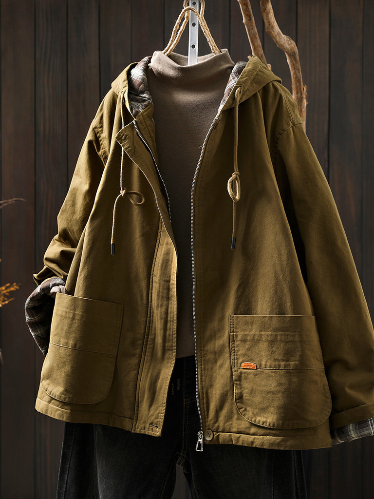 Jaqueta feminina retrô de algodão com capuz e cor pura para outono