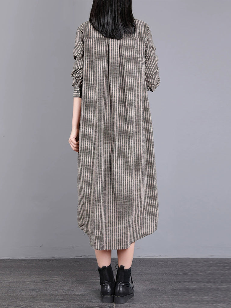 Vestido feminino listrado de outono com gola virada para baixo 100% algodão