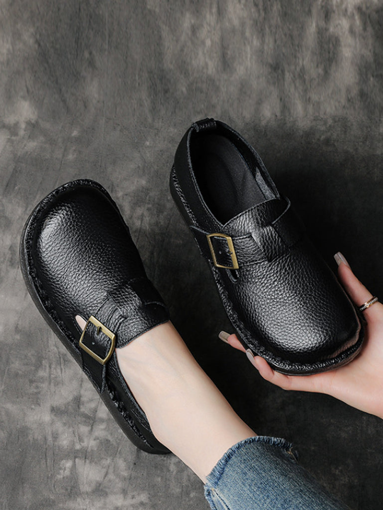 Sapatos de salto baixo de couro de cor pura casual feminino