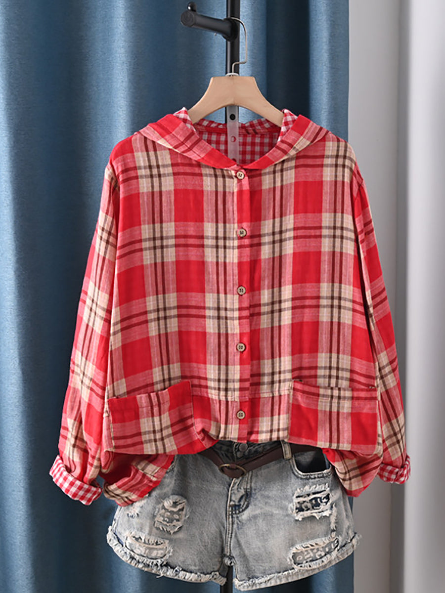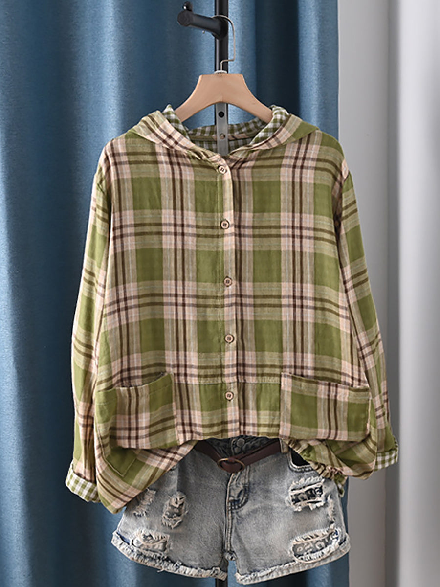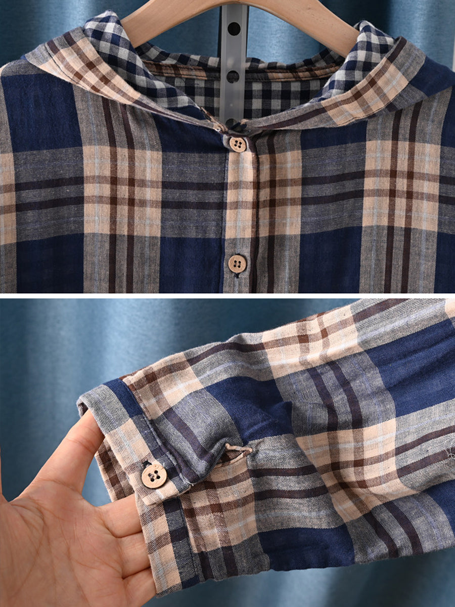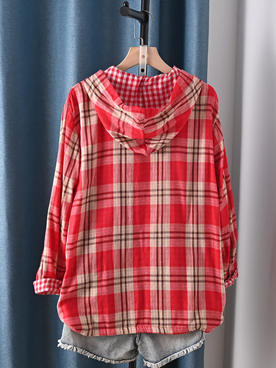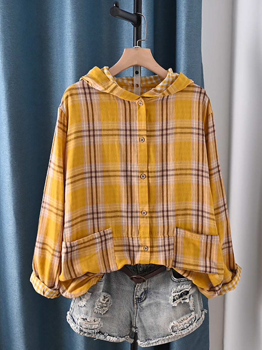 Camisa feminina casual de primavera xadrez com capuz, 100% algodão.