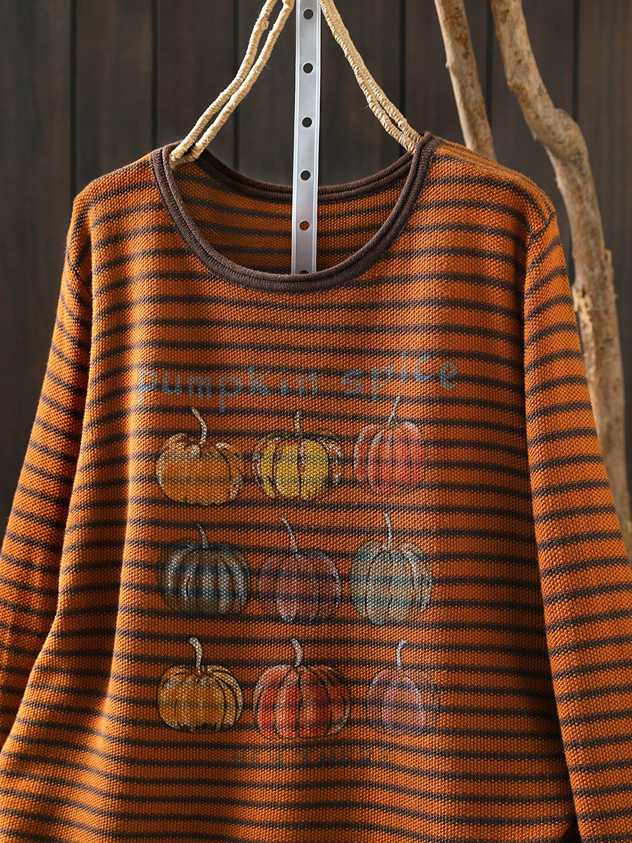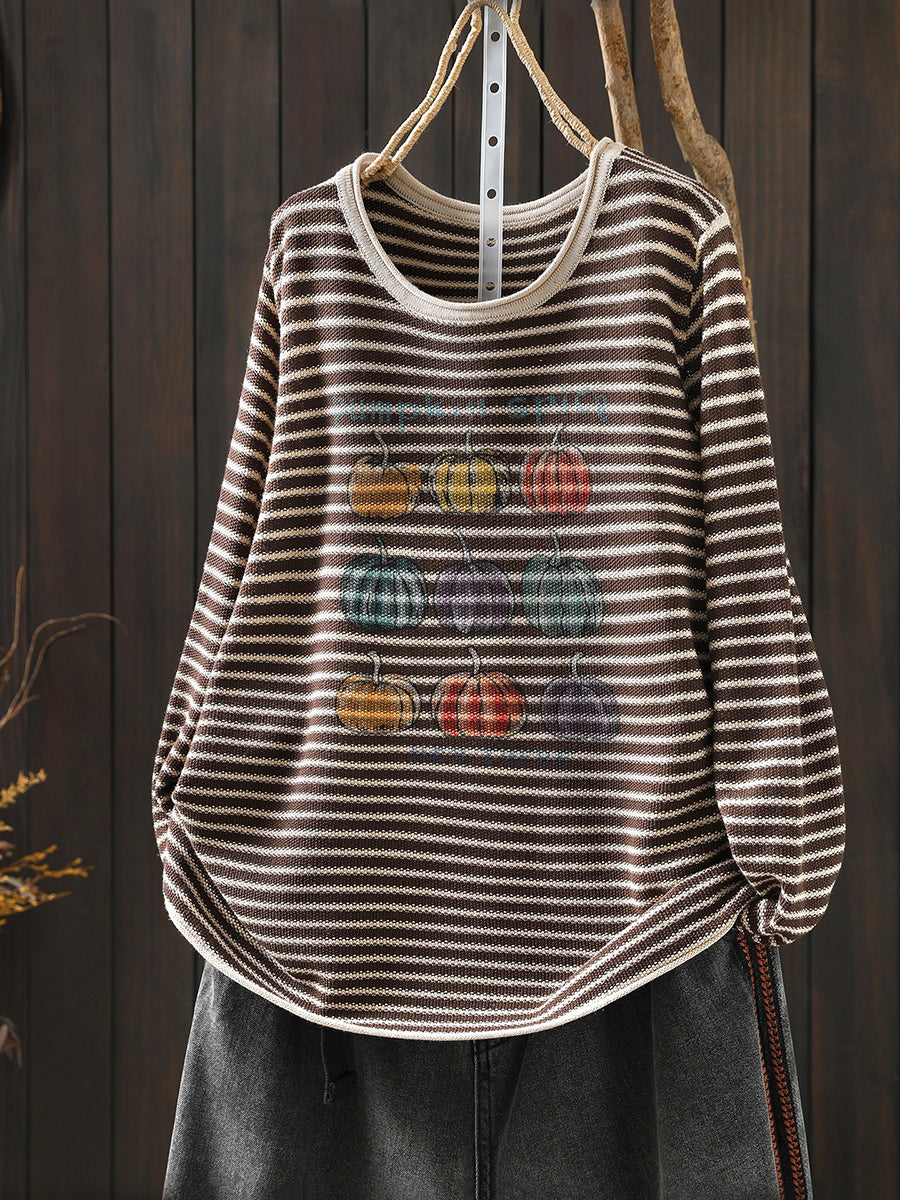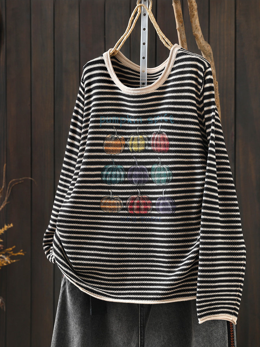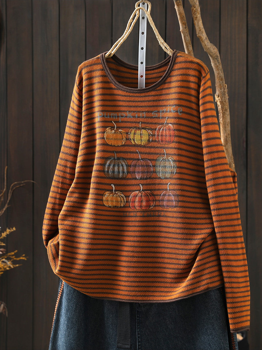 Blusa feminina casual de primavera com listras e estampa de abóbora, decote redondo.