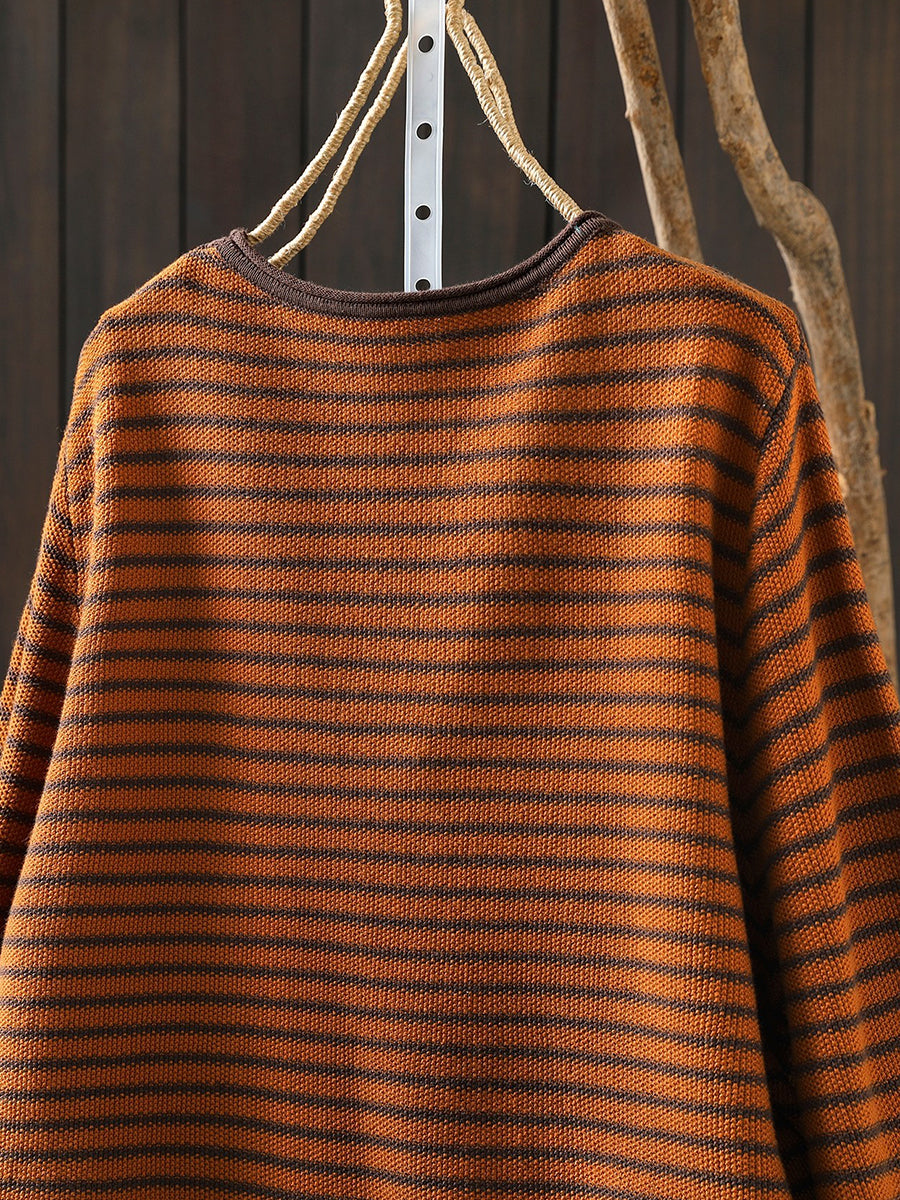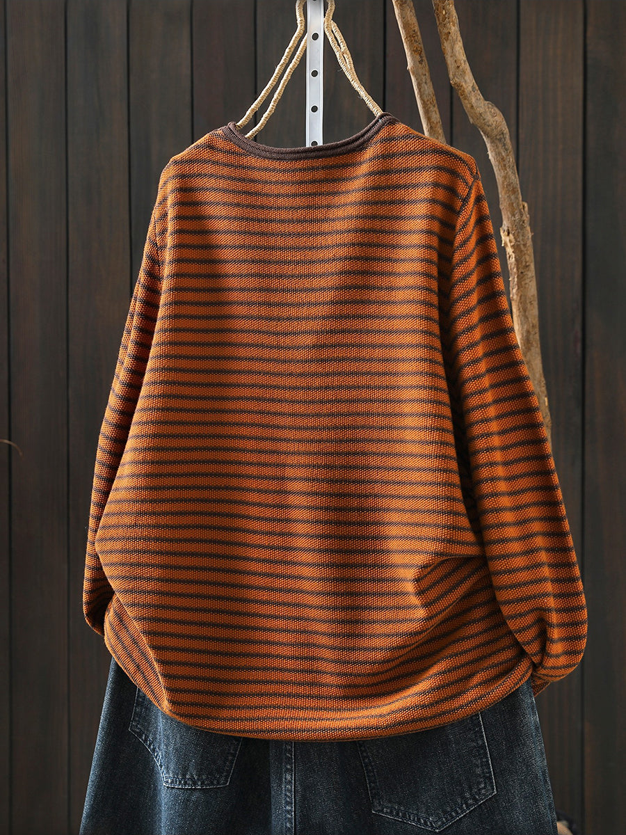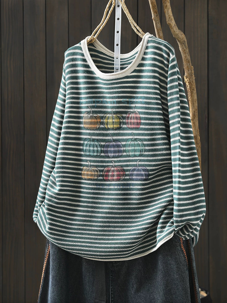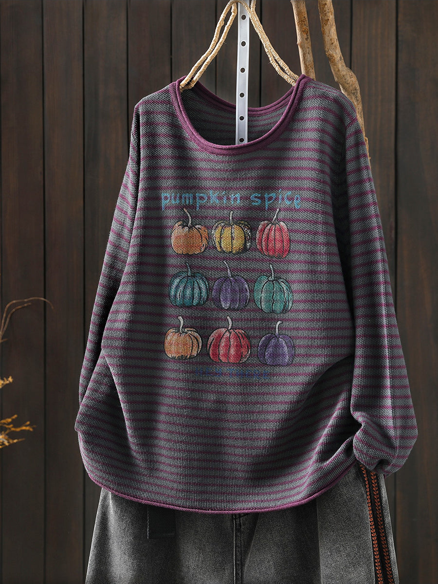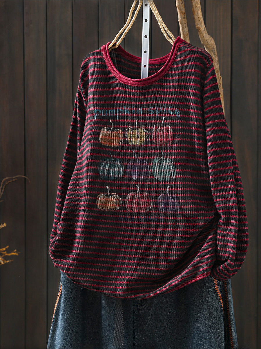 Blusa feminina casual de primavera com listras e estampa de abóbora, decote redondo.