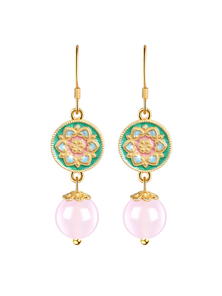 Brincos femininos étnicos de flor de cloisonné e jade