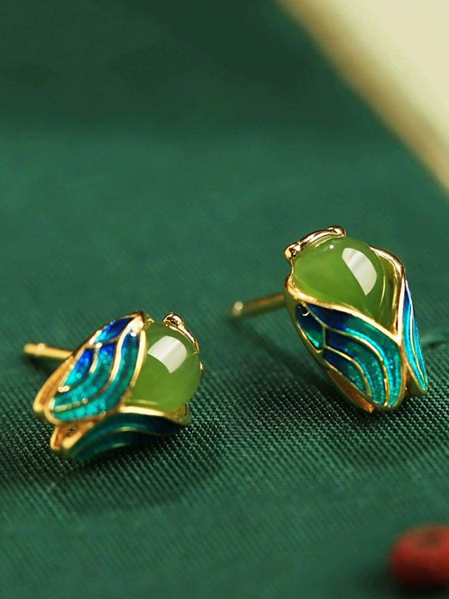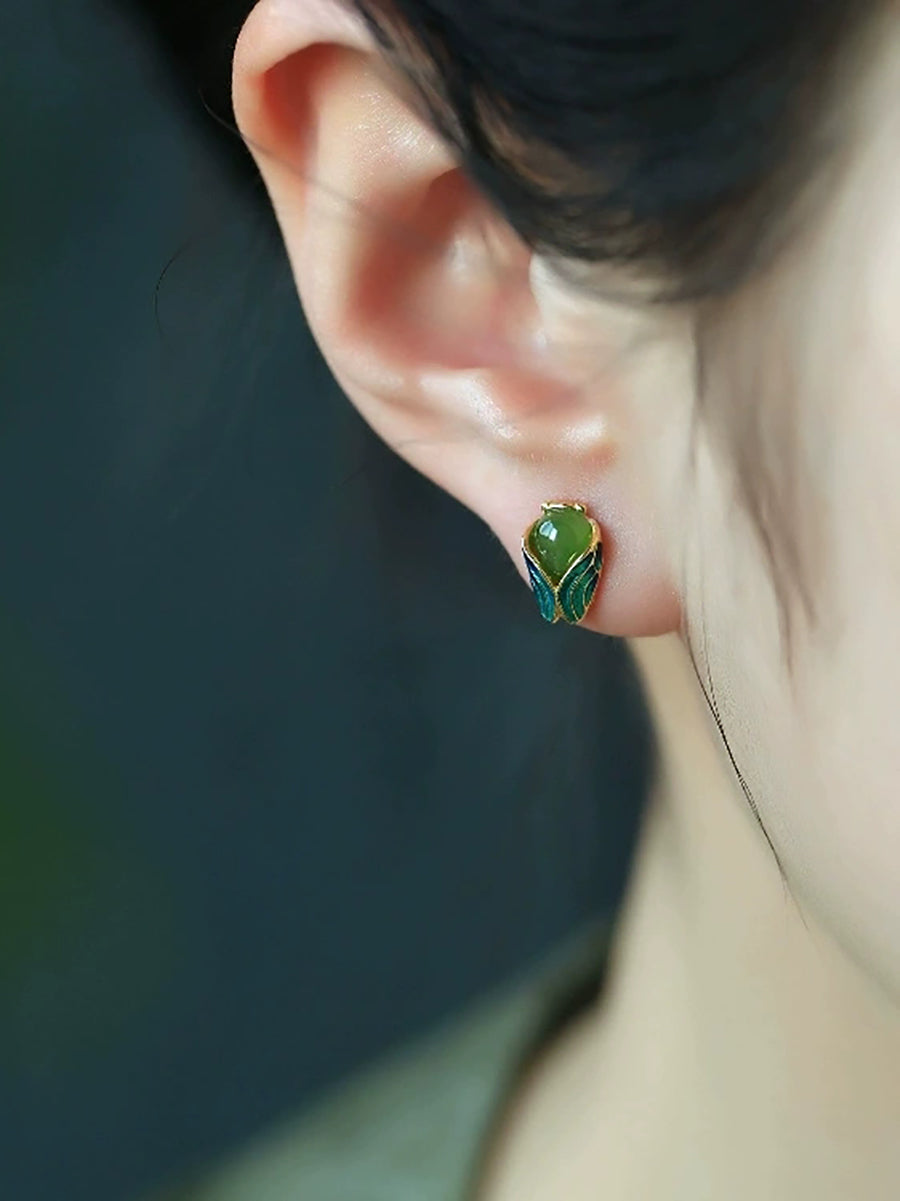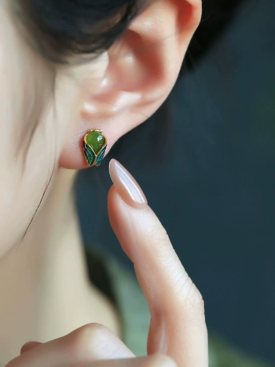 Brincos femininos étnicos de jade esmaltado com cigarra dourada