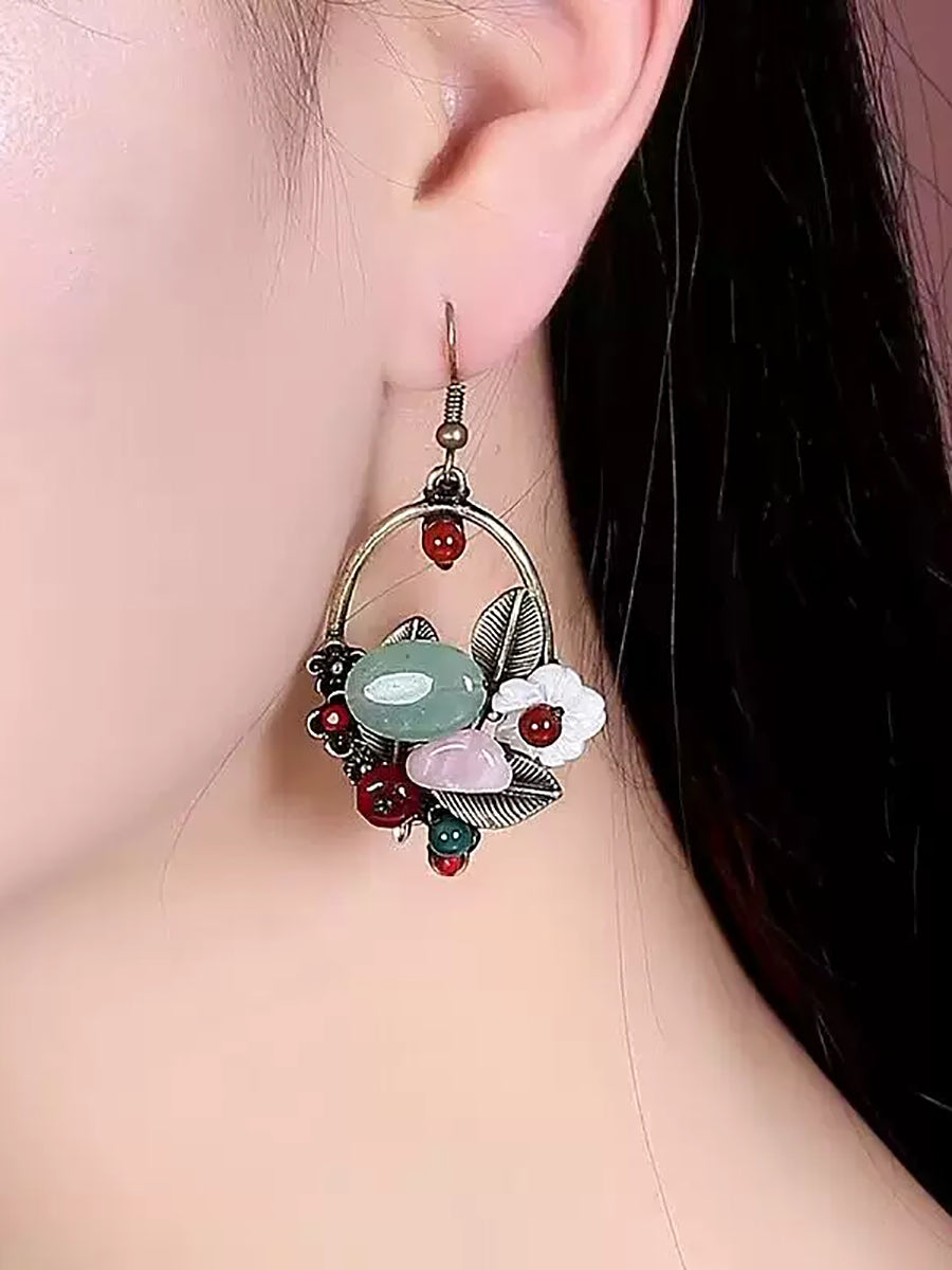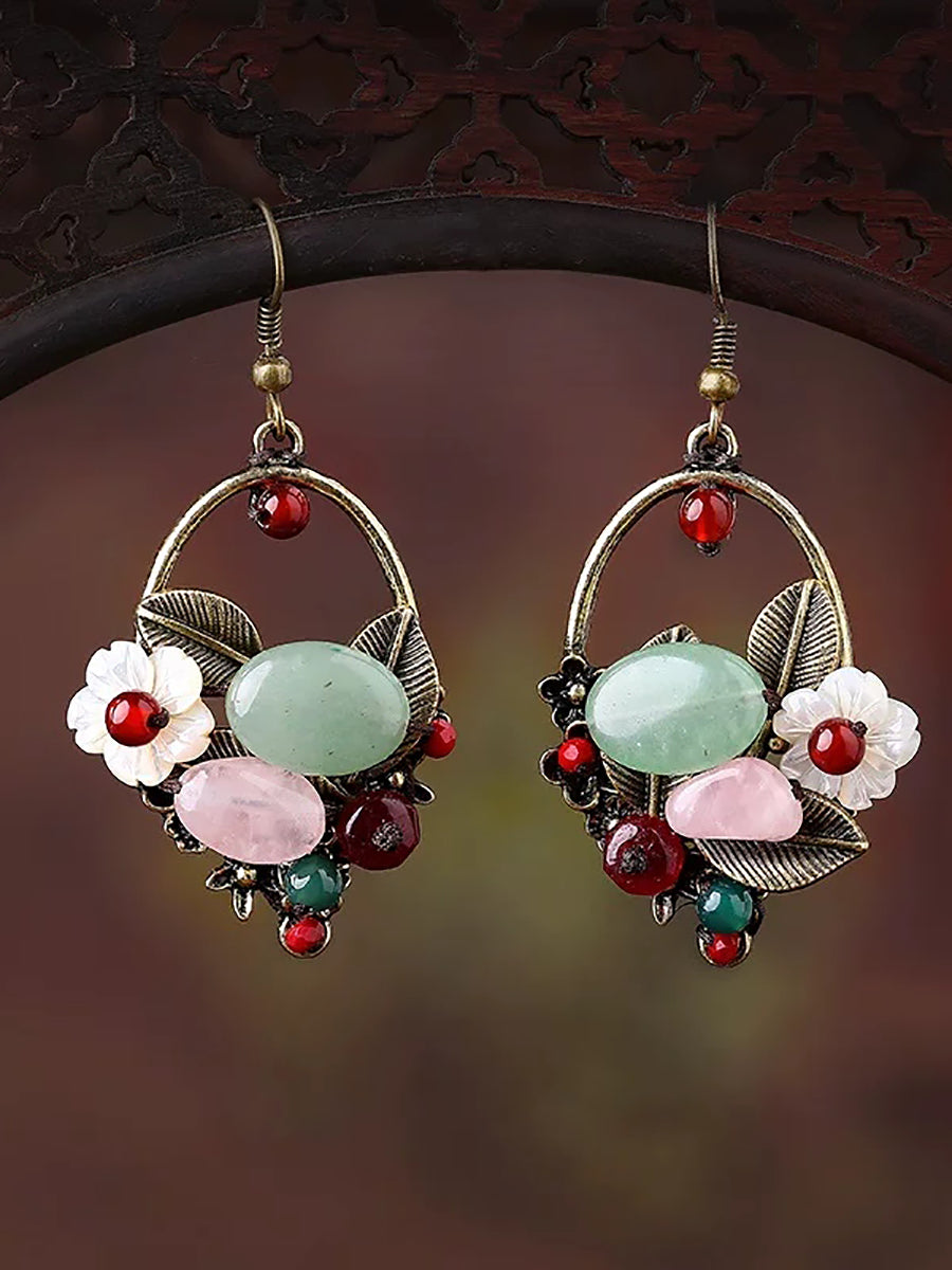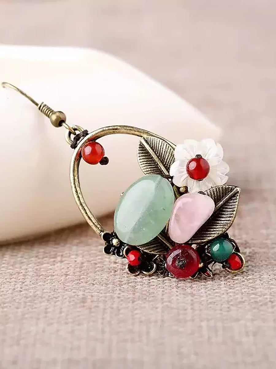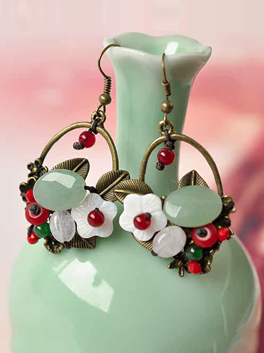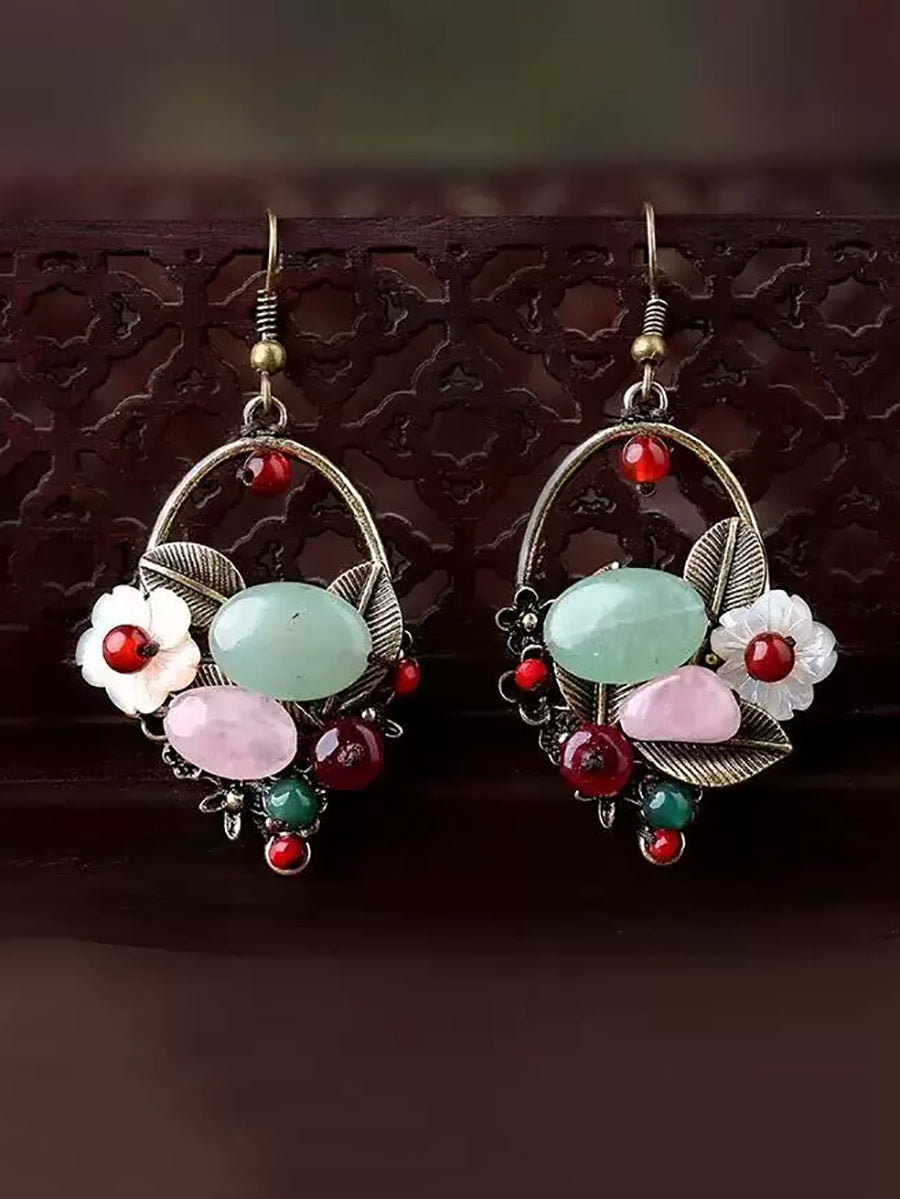 Brincos femininos étnicos de jade com conchas e liga metálica.