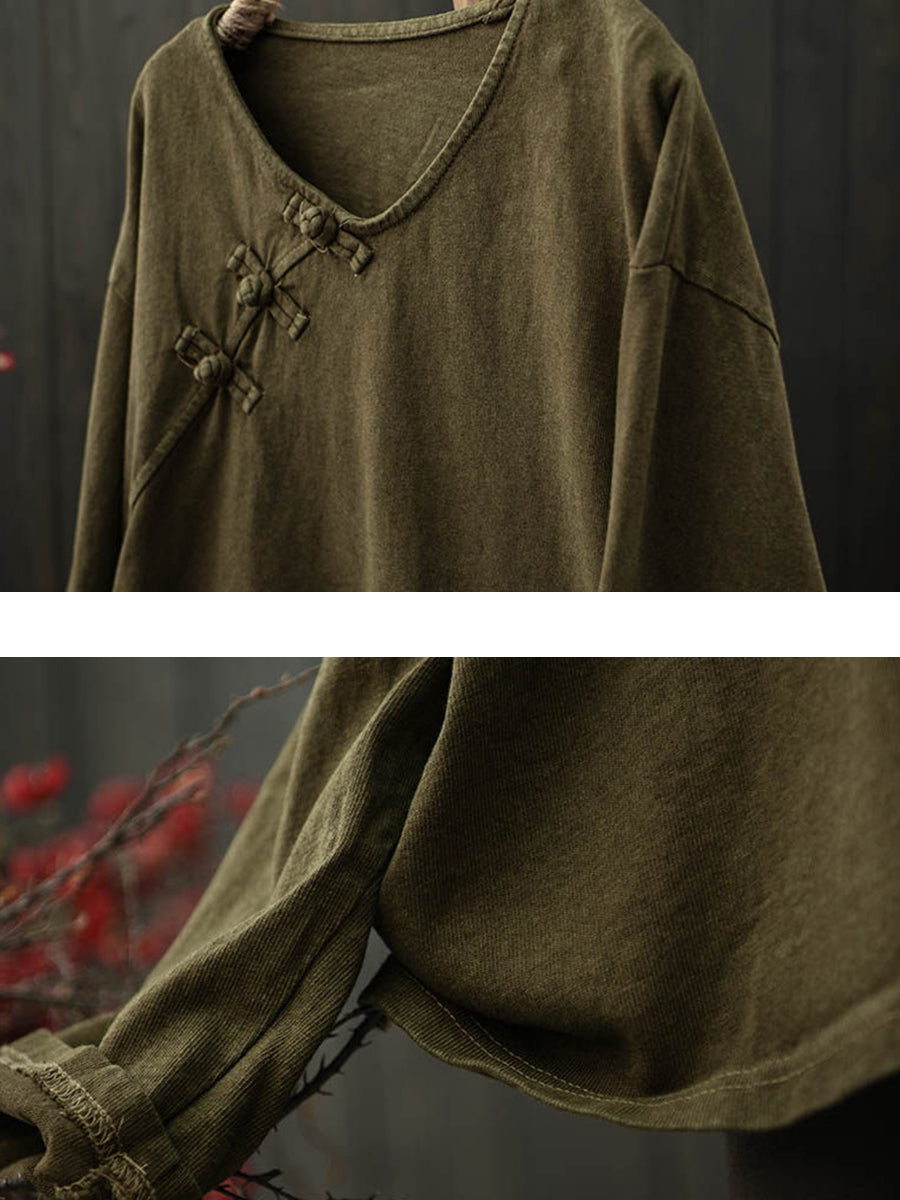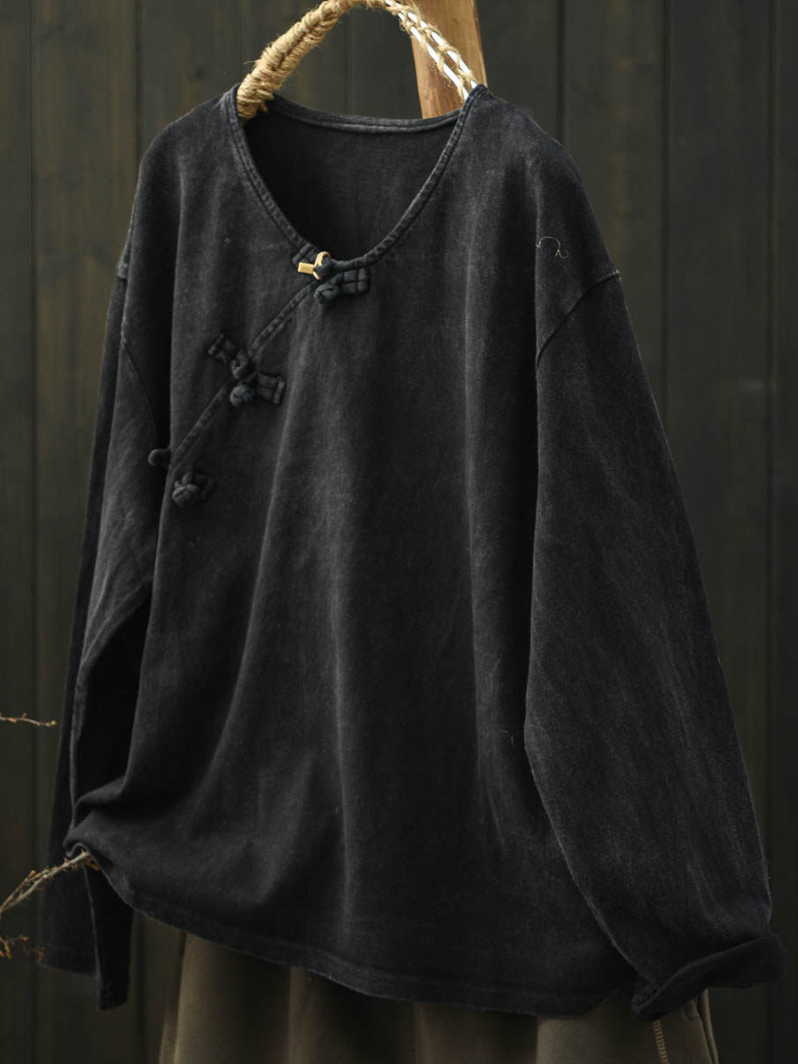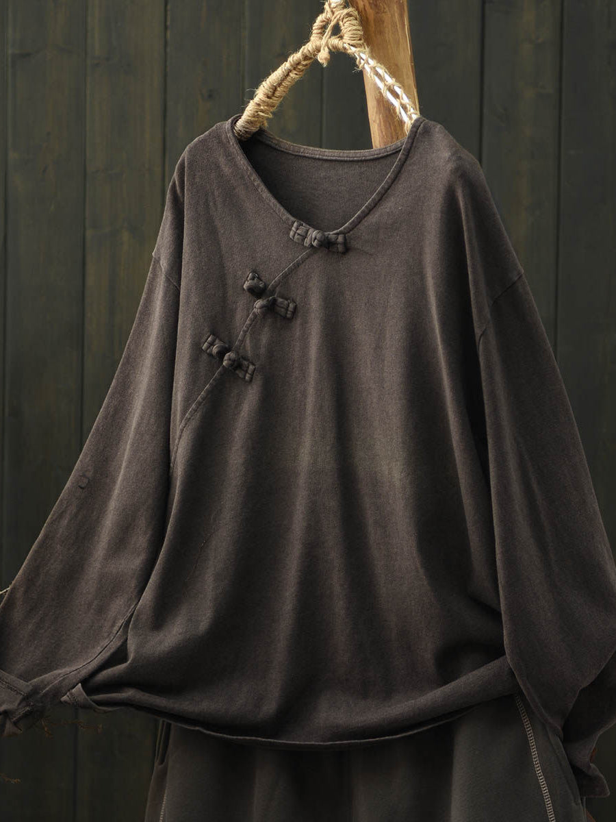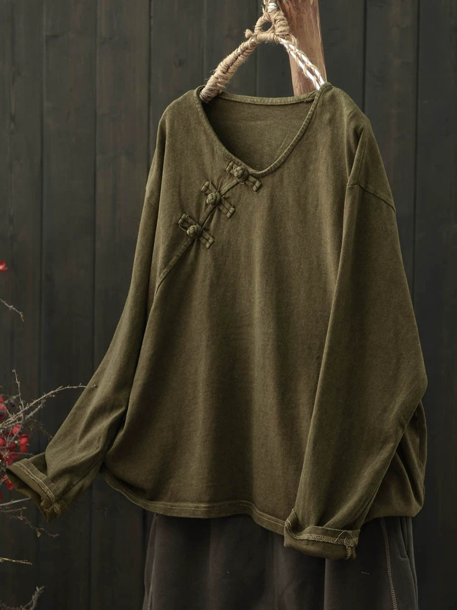 Camisa feminina étnica de primavera em algodão liso com gola redonda