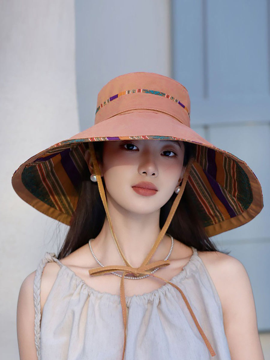Chapéu feminino étnico listrado com tiras coloridas e à prova de sol