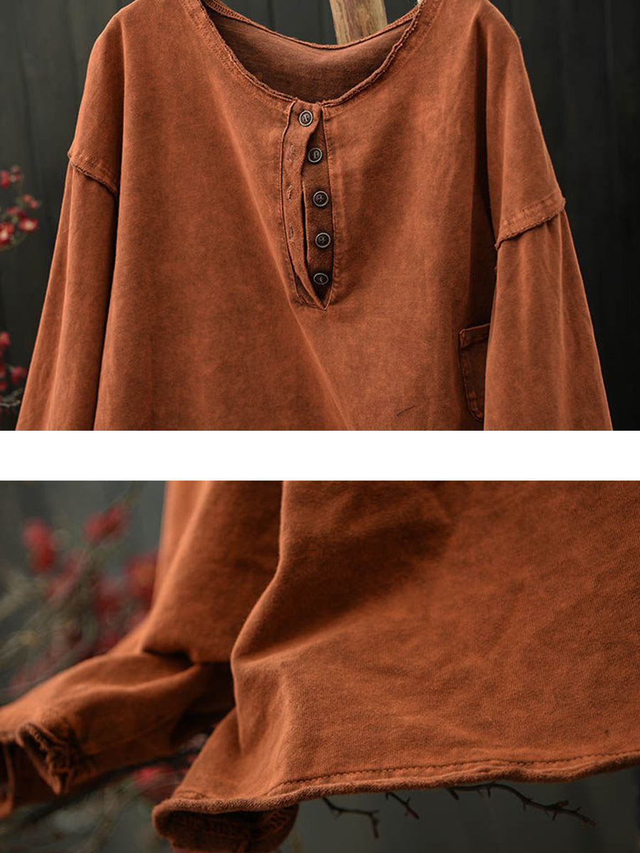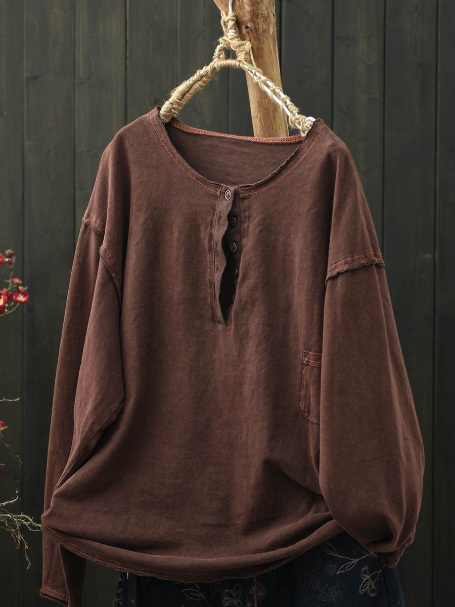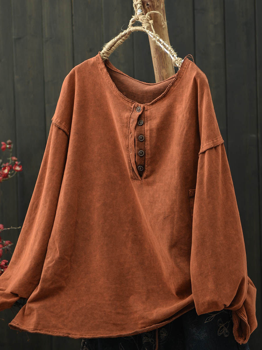 Blusa feminina retrô de primavera em algodão puro com decote redondo.