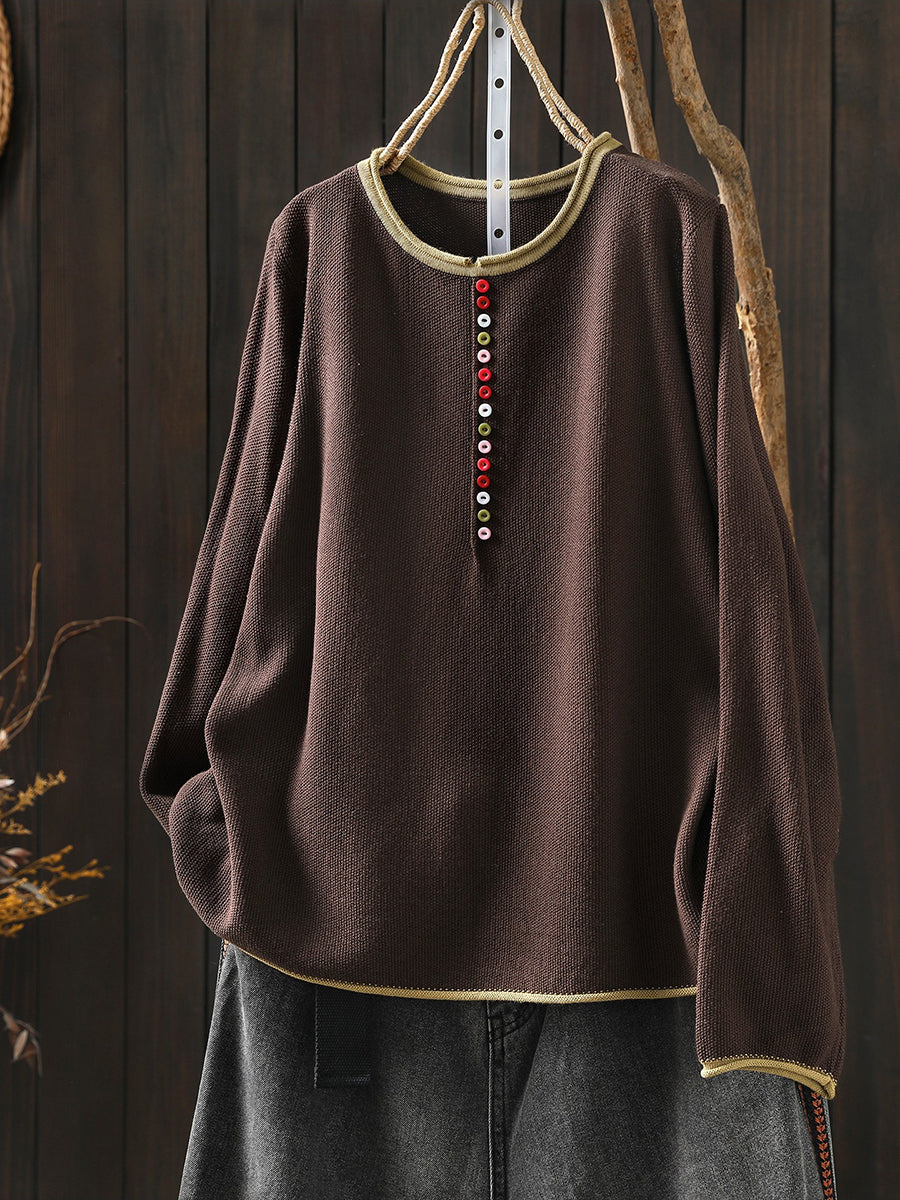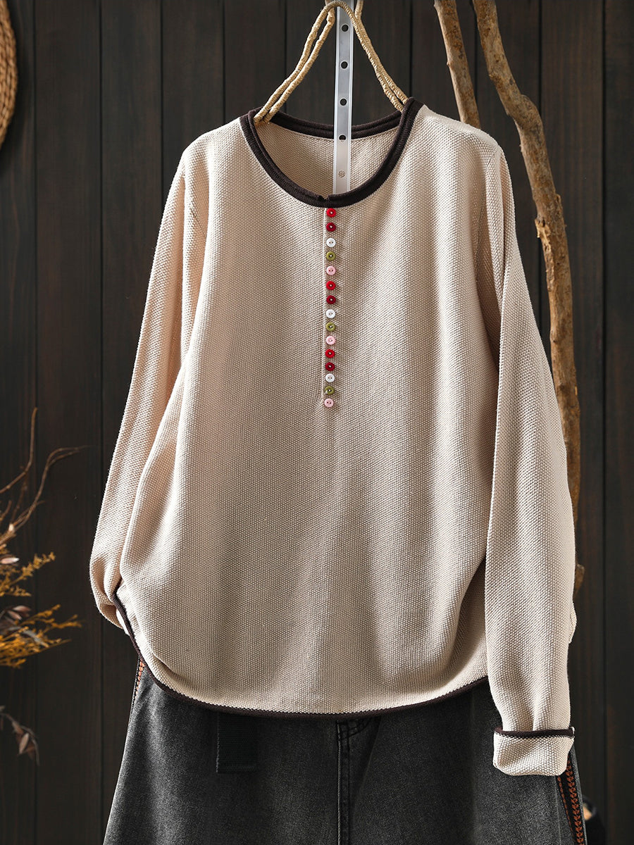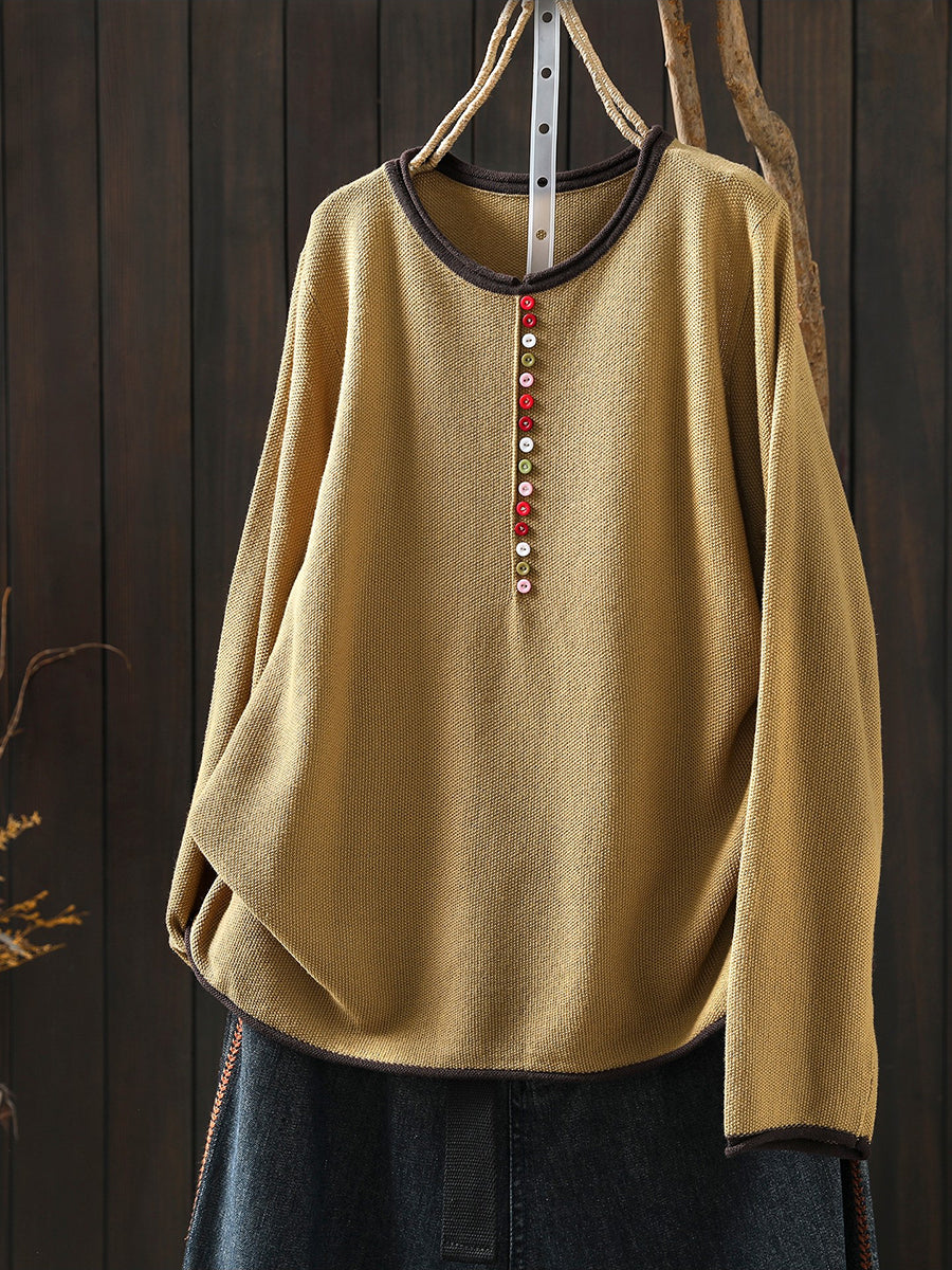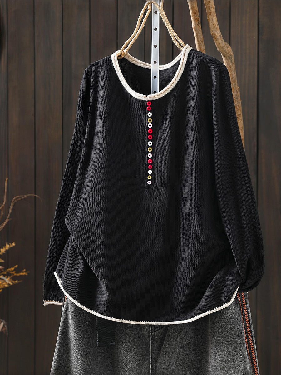 Blusa feminina de primavera com decote redondo e blocos de cores.