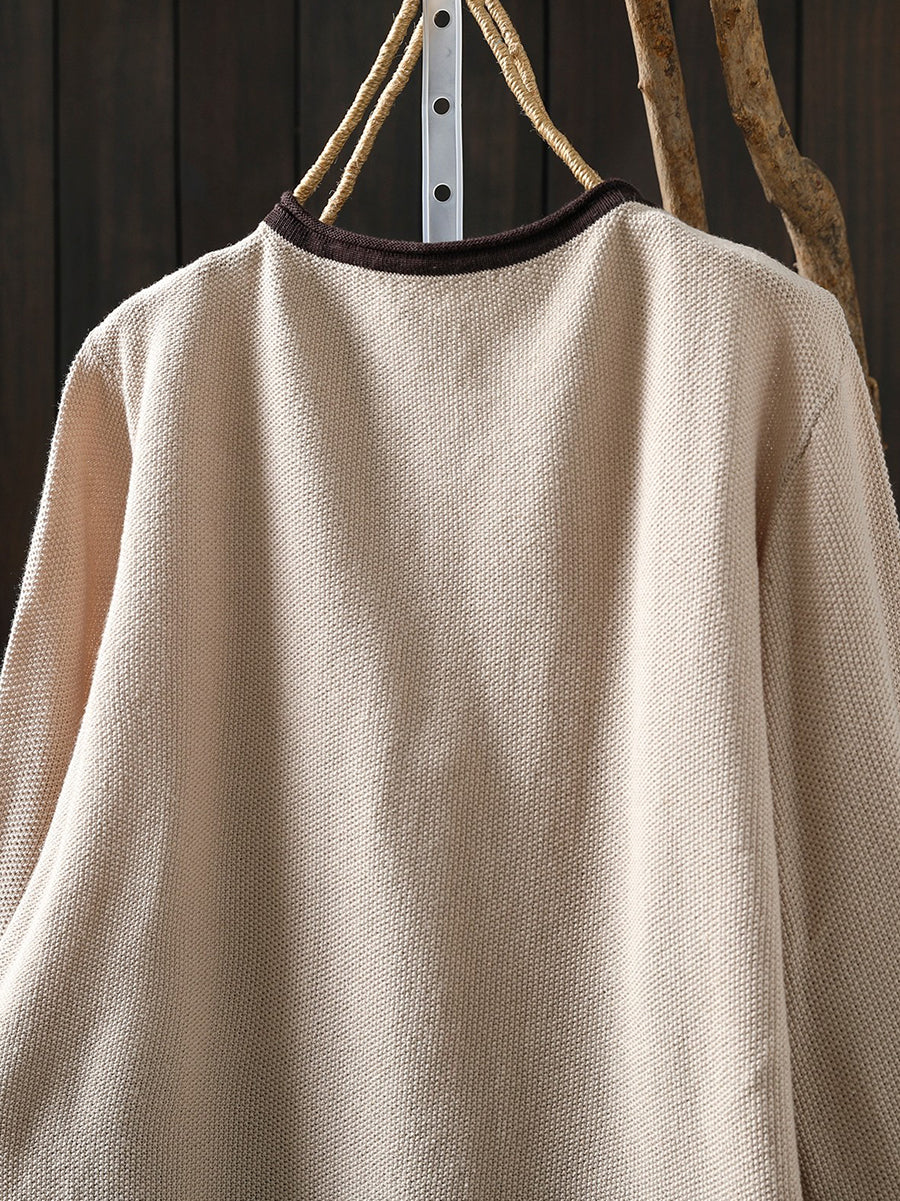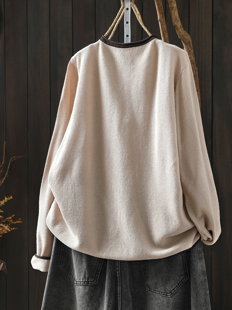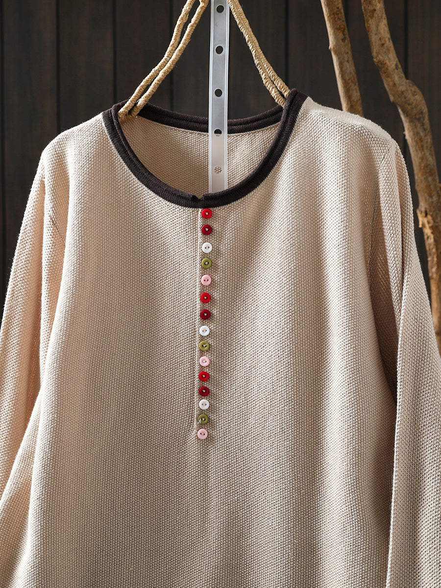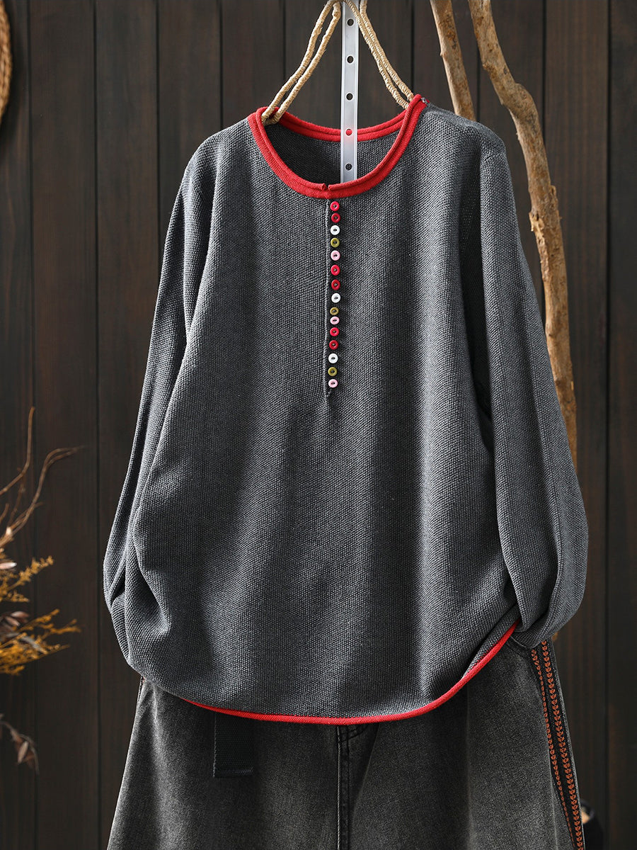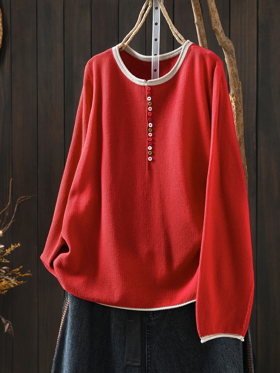 Blusa feminina de primavera com decote redondo e blocos de cores.
