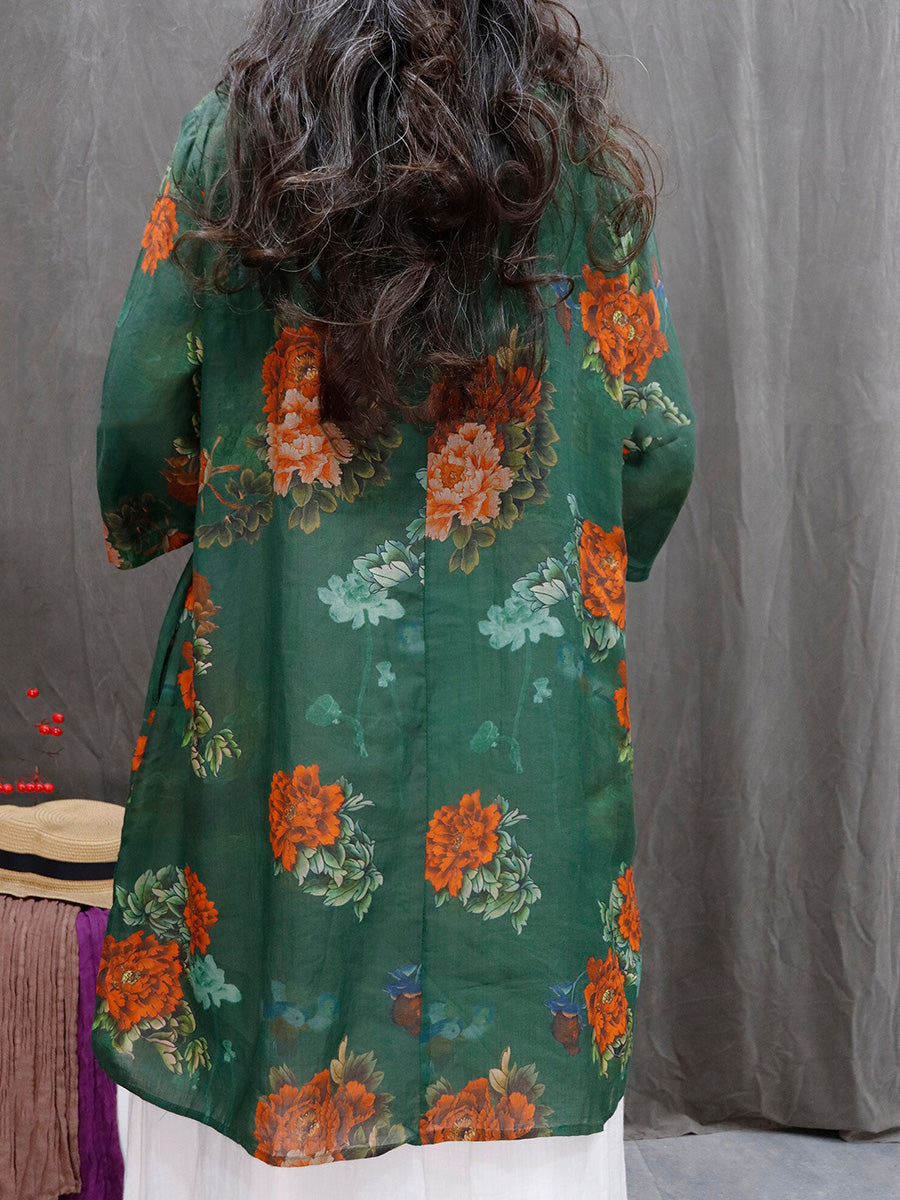 Blusa feminina de primavera com estampa floral artística, 100% rami, decote em V.