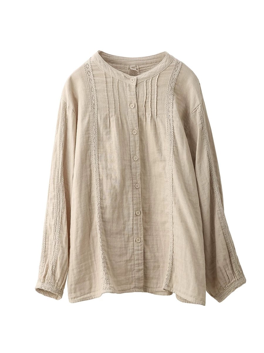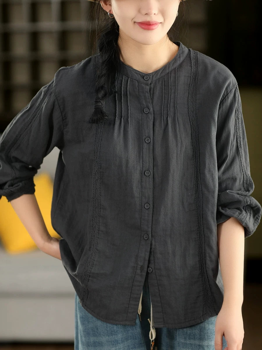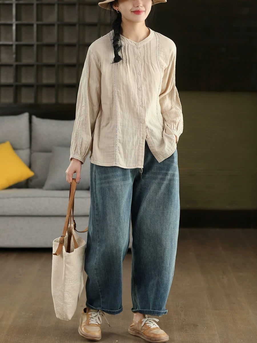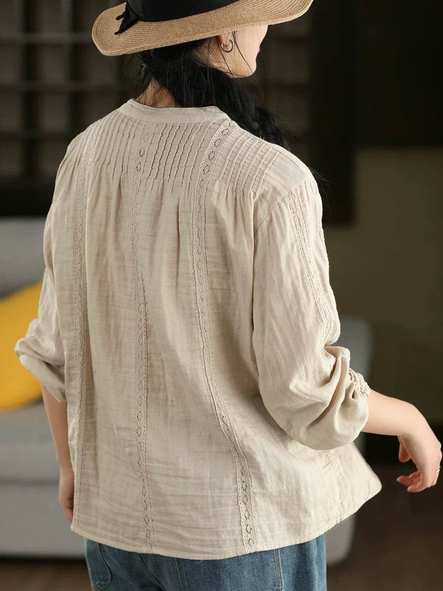 Camisa feminina de primavera com detalhes em renda artística, 100% algodão.