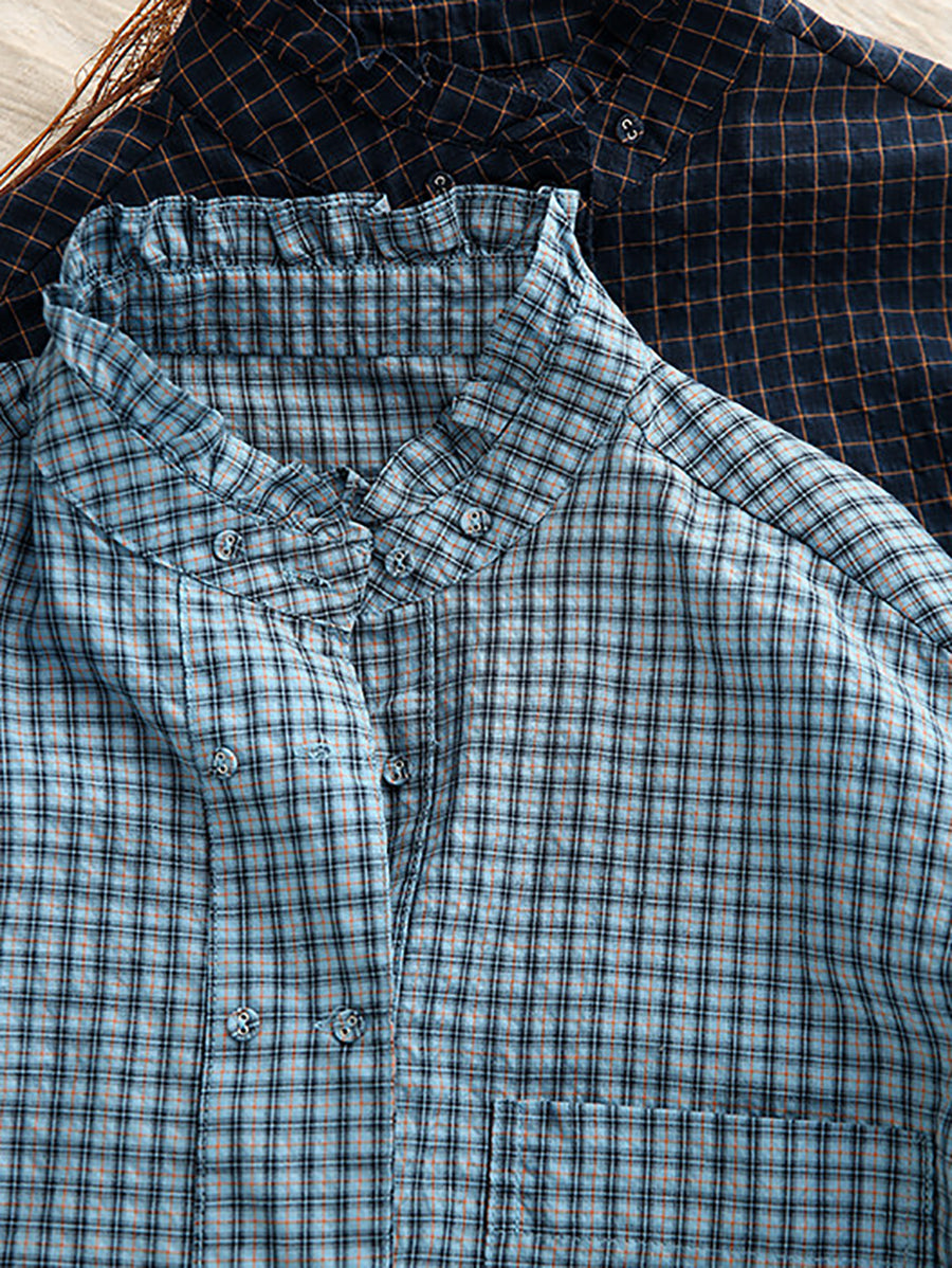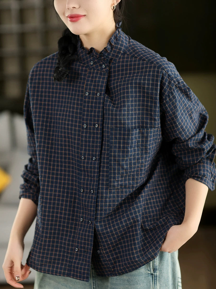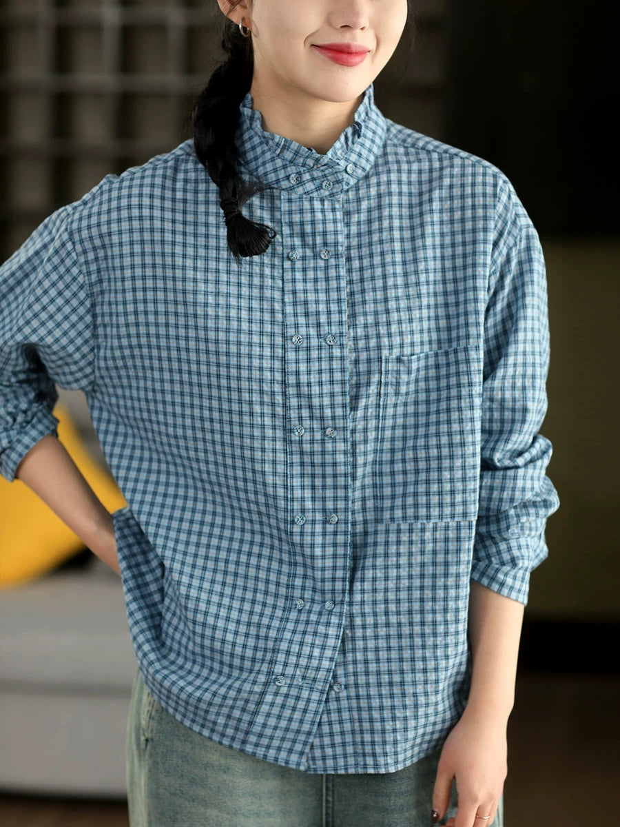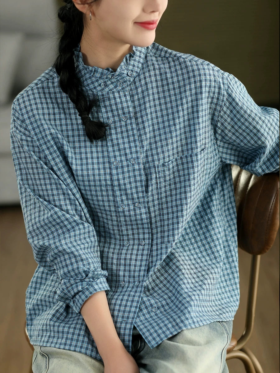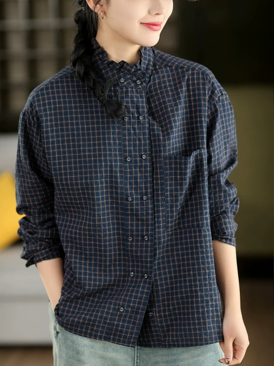Camisa feminina de algodão com estampa xadrez e gola alta para a primavera