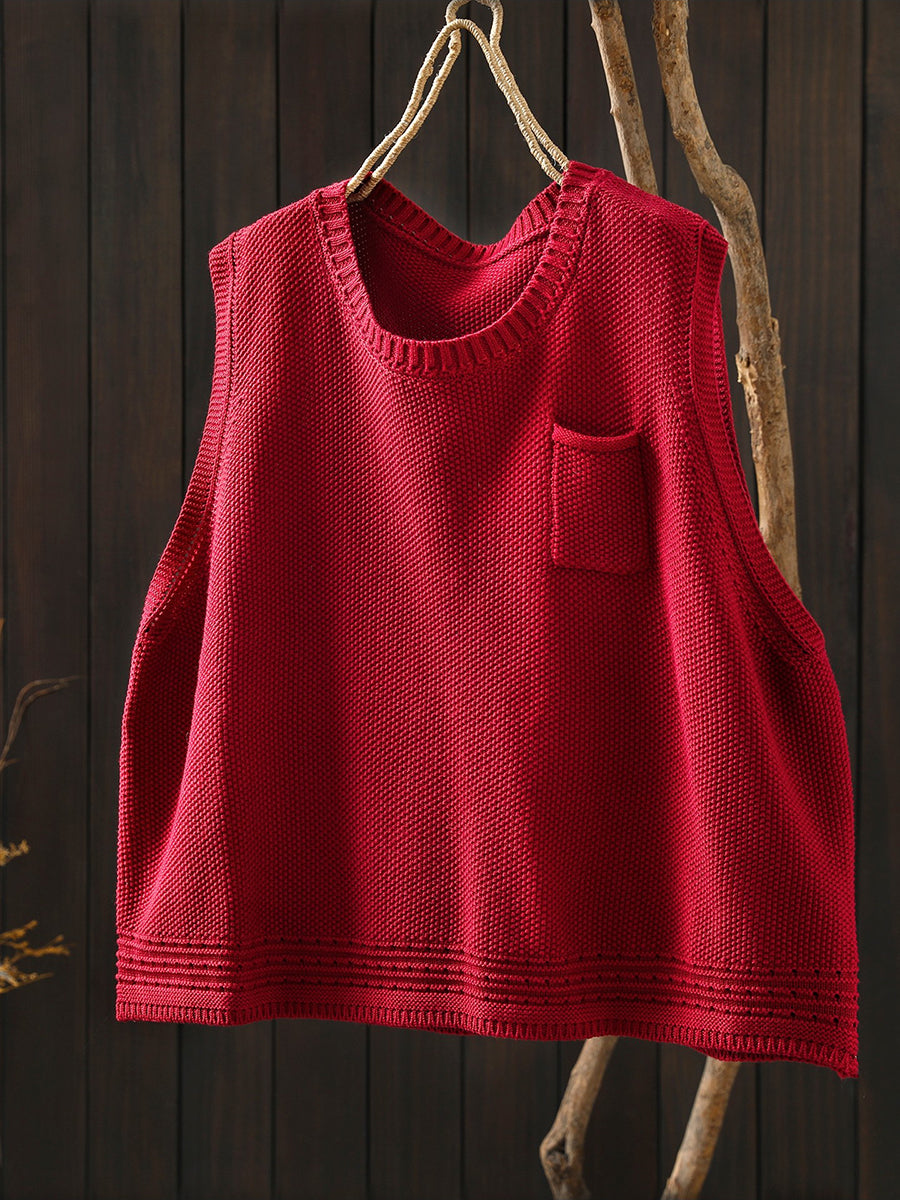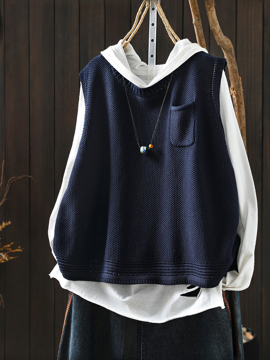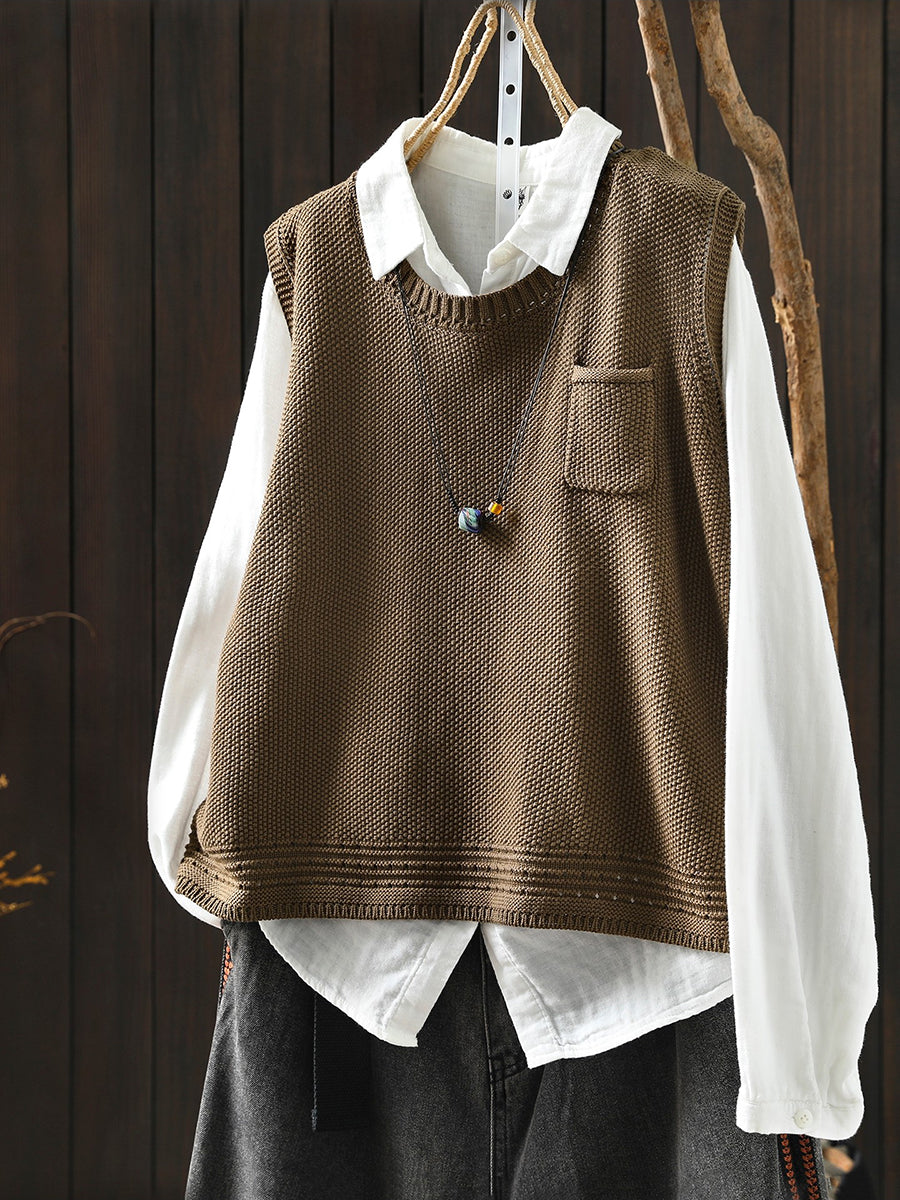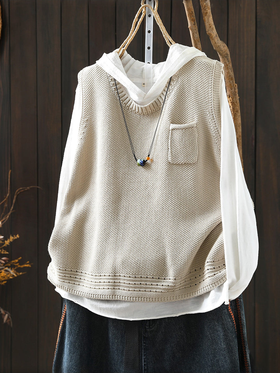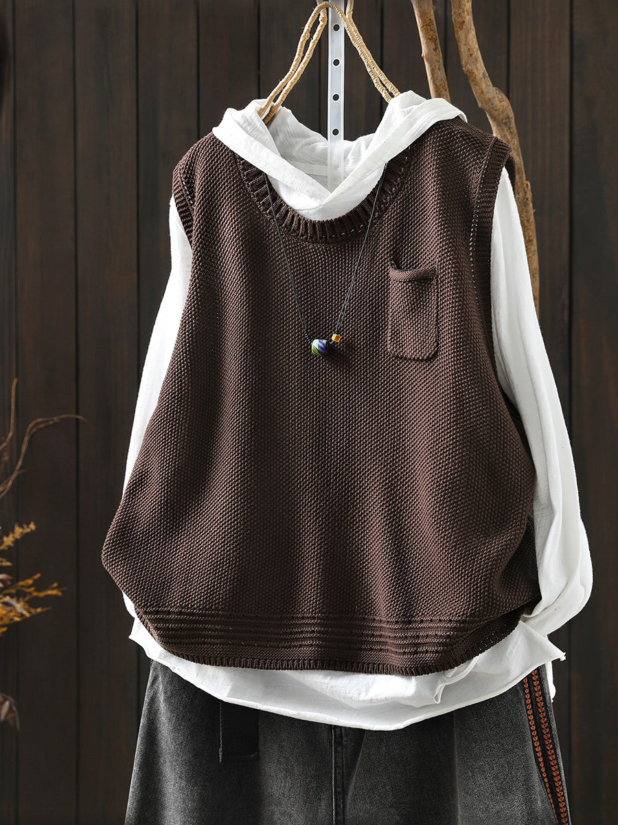 Colete feminino de tricô com decote redondo e cor lisa, estilo artístico, para a primavera.