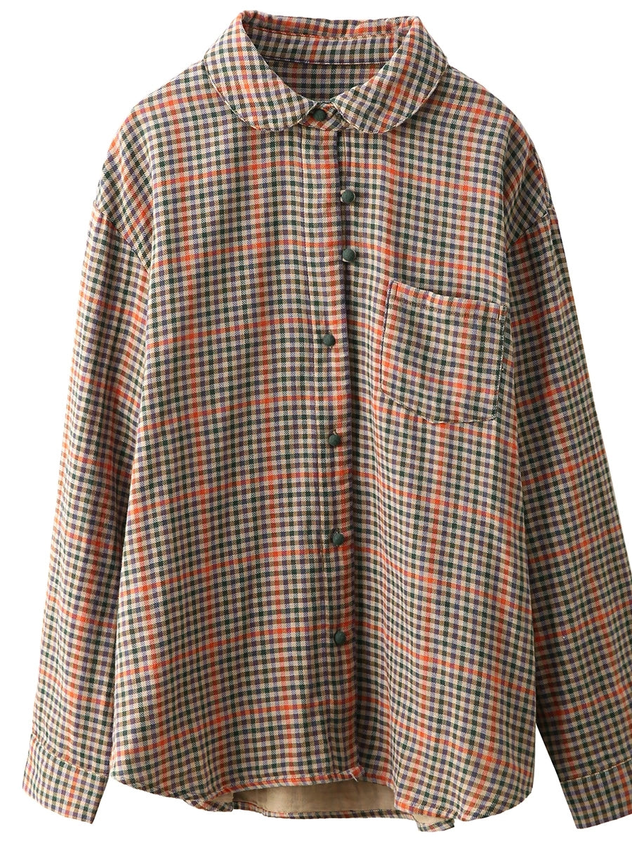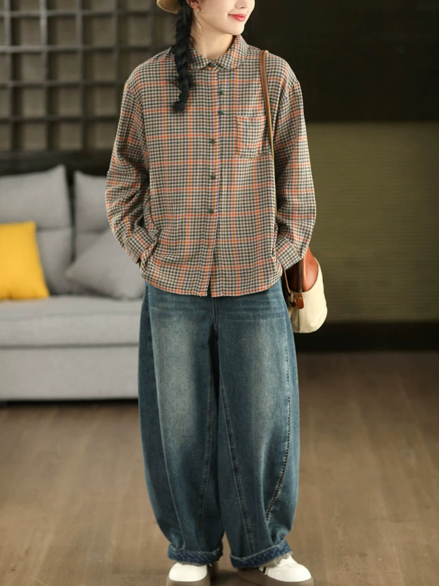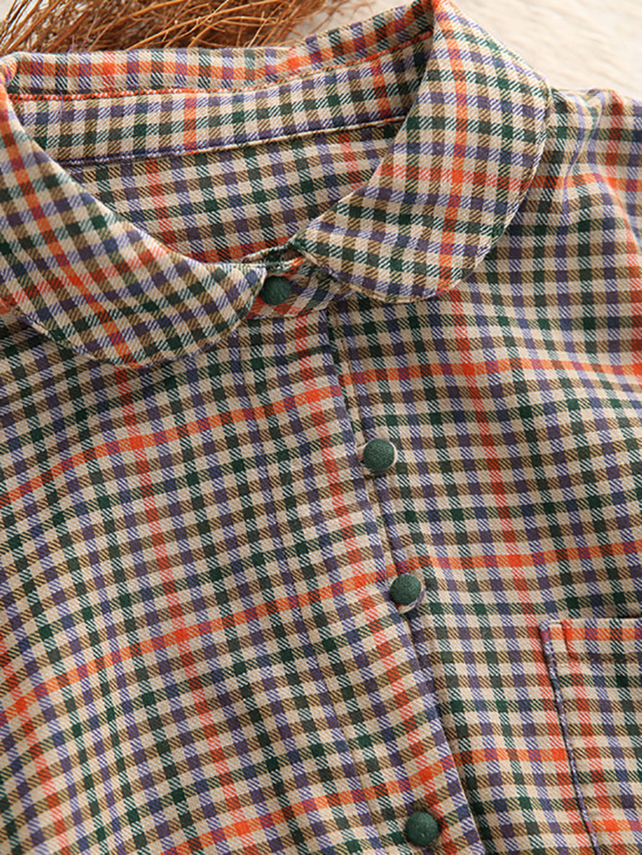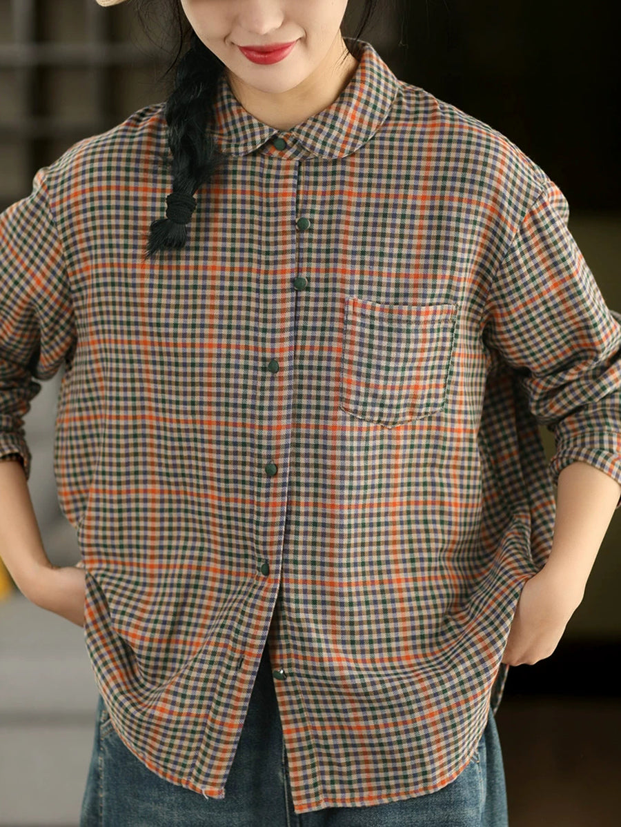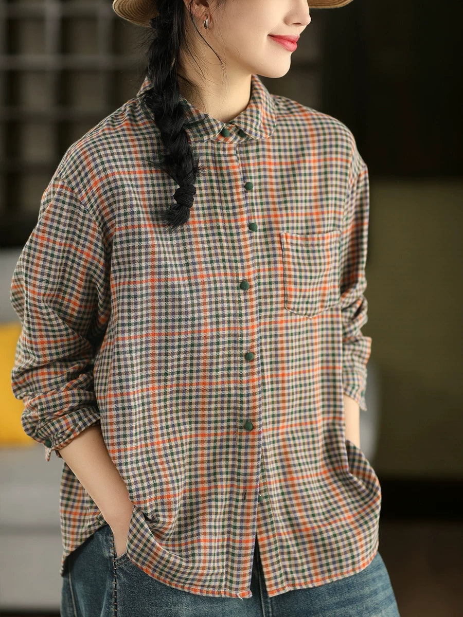 Camisa feminina de algodão 100% com estampa xadrez artística para a primavera