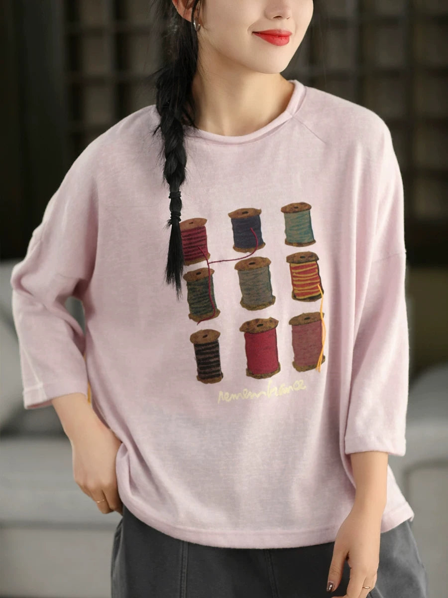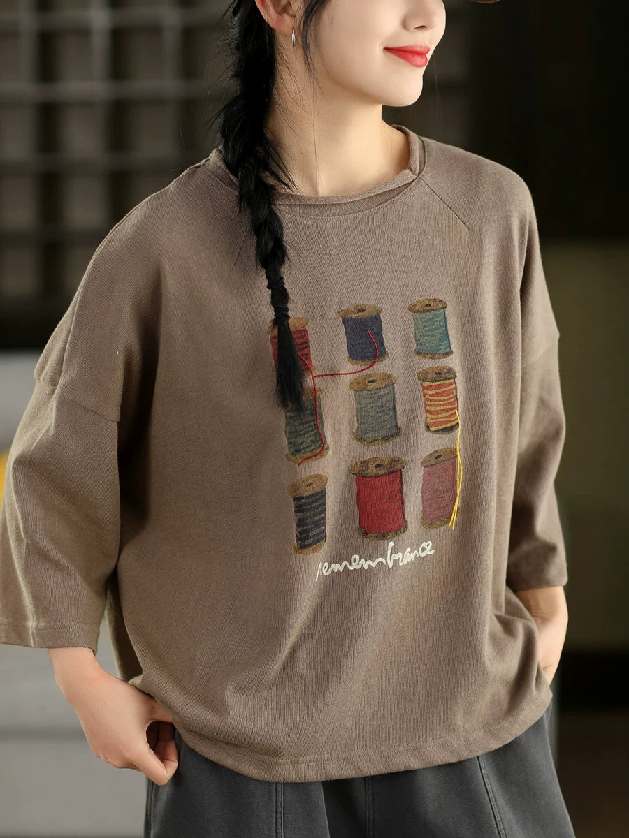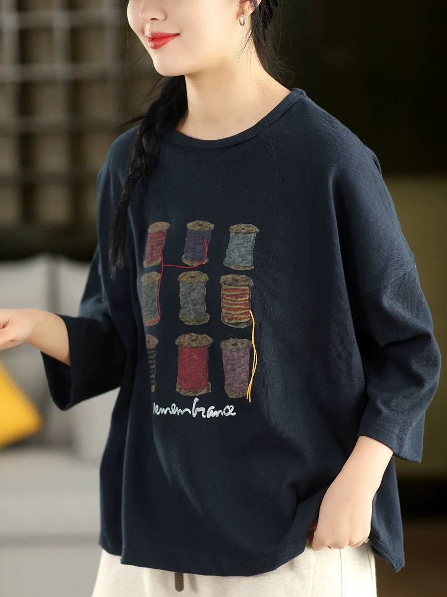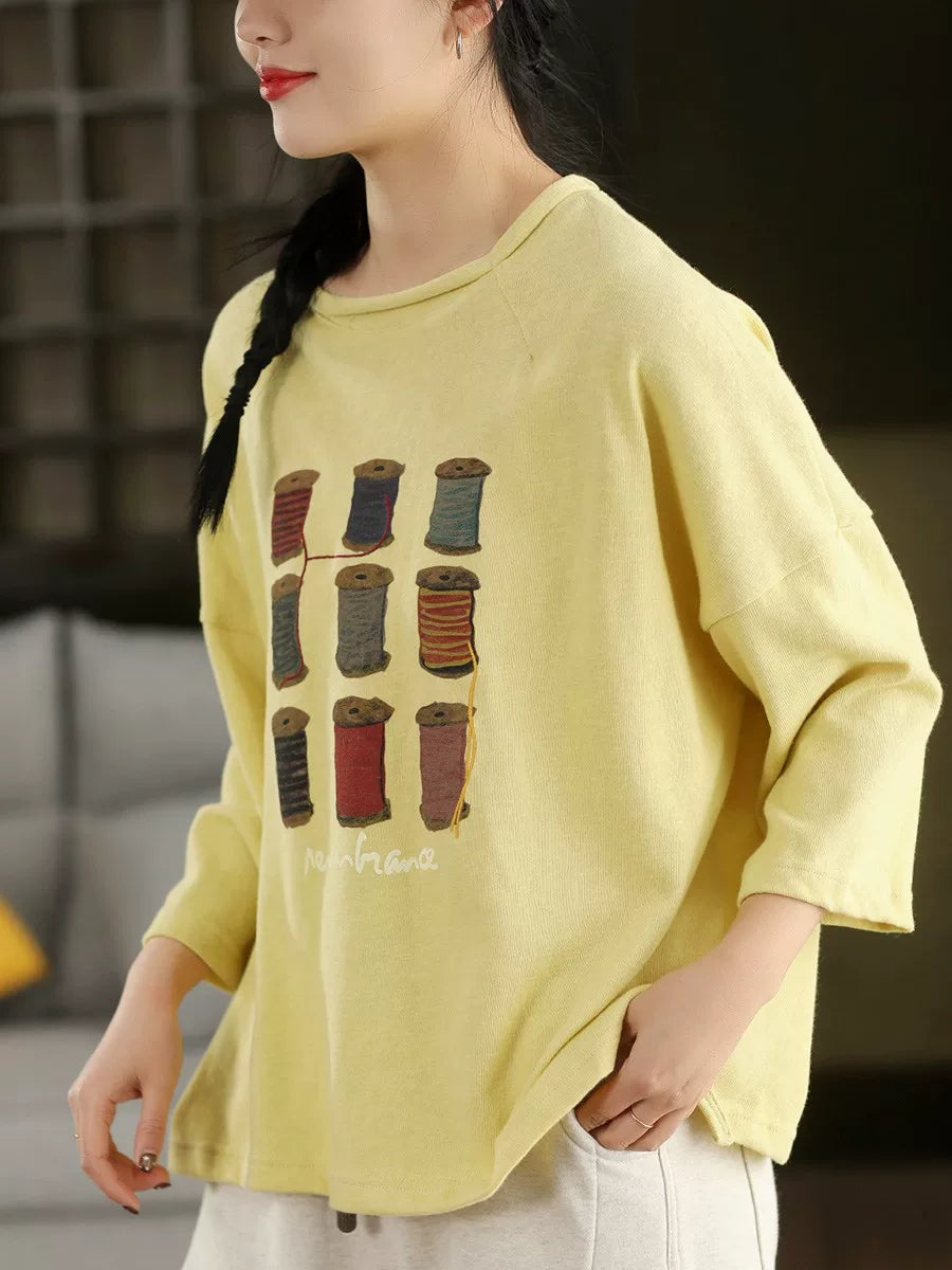 Blusa feminina de algodão com estampa artística e gola redonda, estilo primavera.